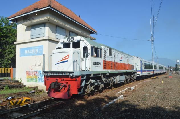 Rangkaian Kereta Api (KA) kelas eksekutif berangkat menuju Surabaya saat menjalani uji mekanik dari Stasiun KA Madiun, Jatim, Jumat (13/5). PT Industri Kereta Api (Inka) Madiun bersama PT Kereta Api Indonesia (KAI) melakukan uji mekanik satu dari lima rangkaian KA eksekutif pesanan PT KAI dengan nilai kontrak Rp304 miliar sebelum diserahkan kepada pemesan yang akan mulai dioperasikan mulai pelaksanaan angkutan lebaran 2016. ANTARA FOTO/Siswowidodo/aww/16.