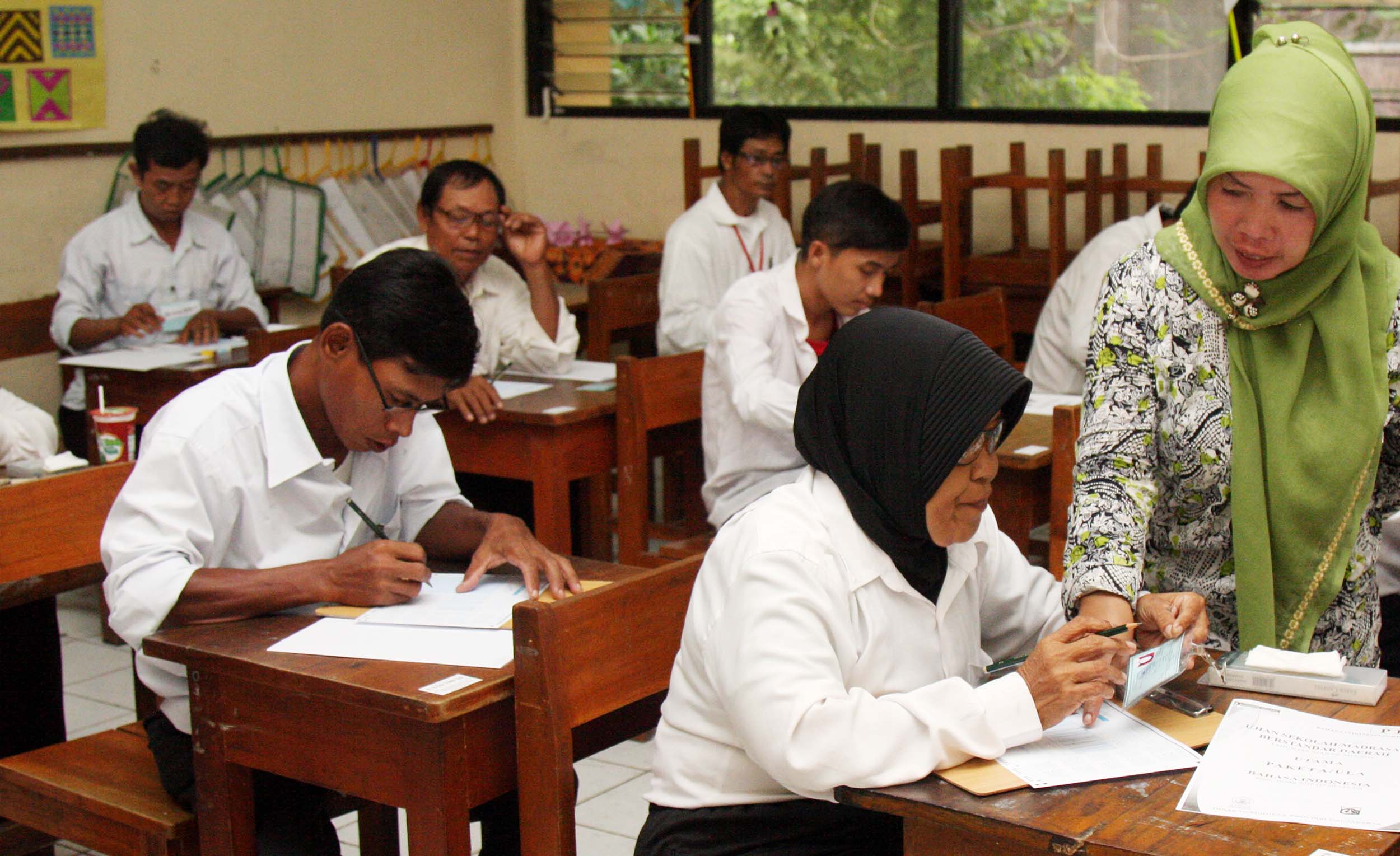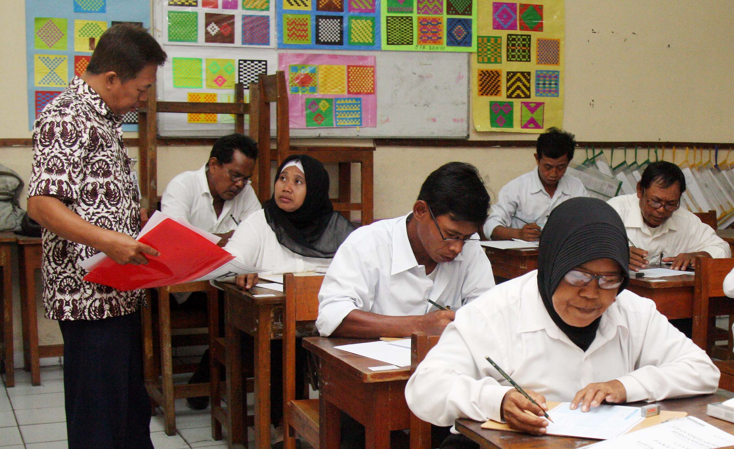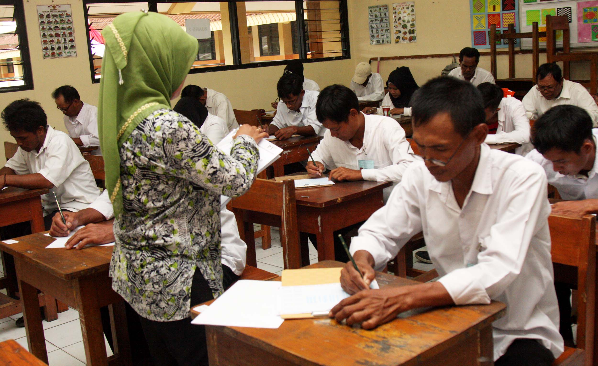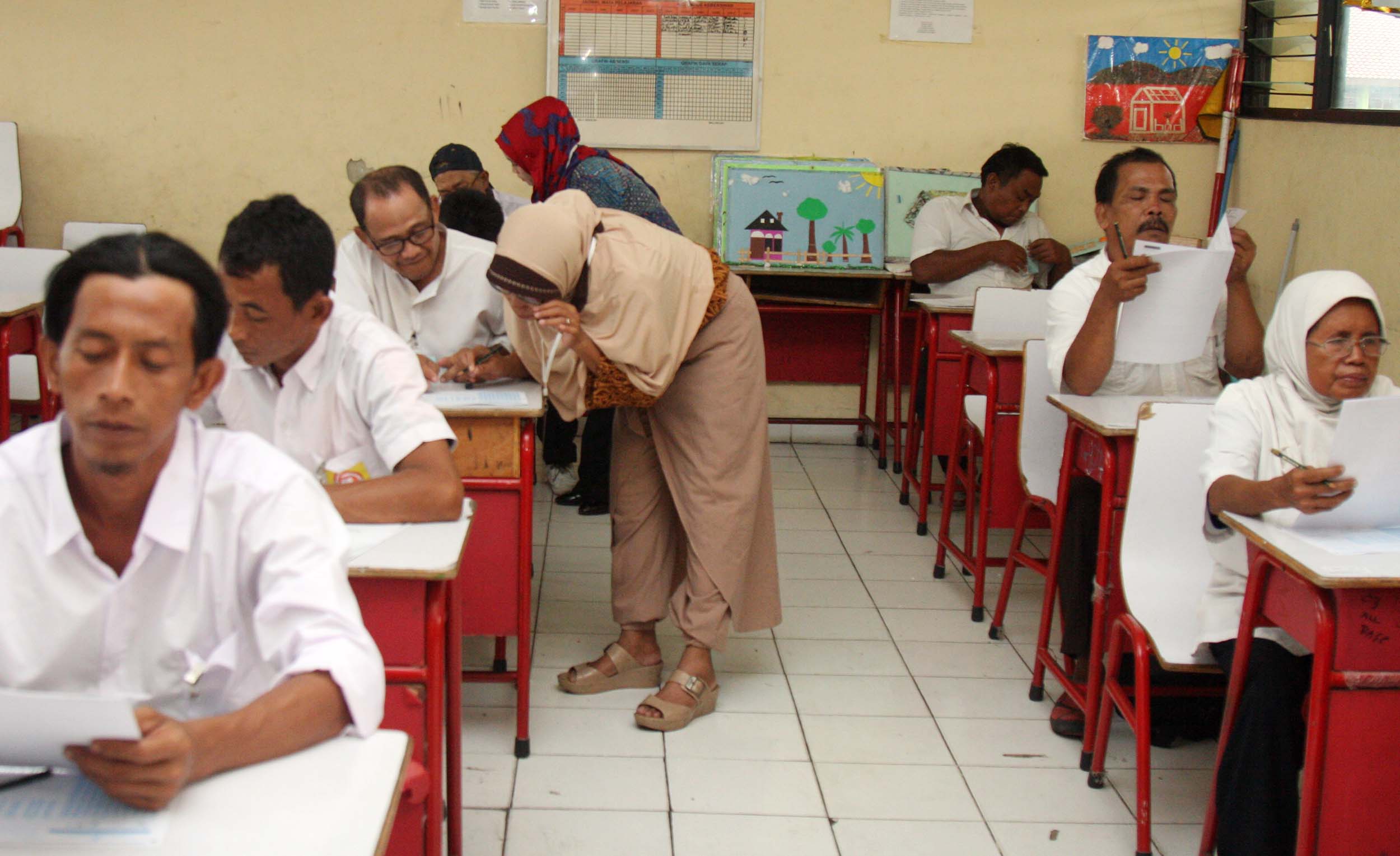 Pengawas ujian membagikan soal dan lembar jawaban kepada peserta ujian penyetaraan Paket A , di di Jakarta, Senin (16/05/2016). Ujian kejar Paket A digelar di Jakarta muali hari ini, Ujian Kejar Paket A adalah ujian penyetaraan dengan Sekolah Dasar (SD) dan para peserta ujian akan melaksanakan ujian hingga tanggal 18 Mei 2016.