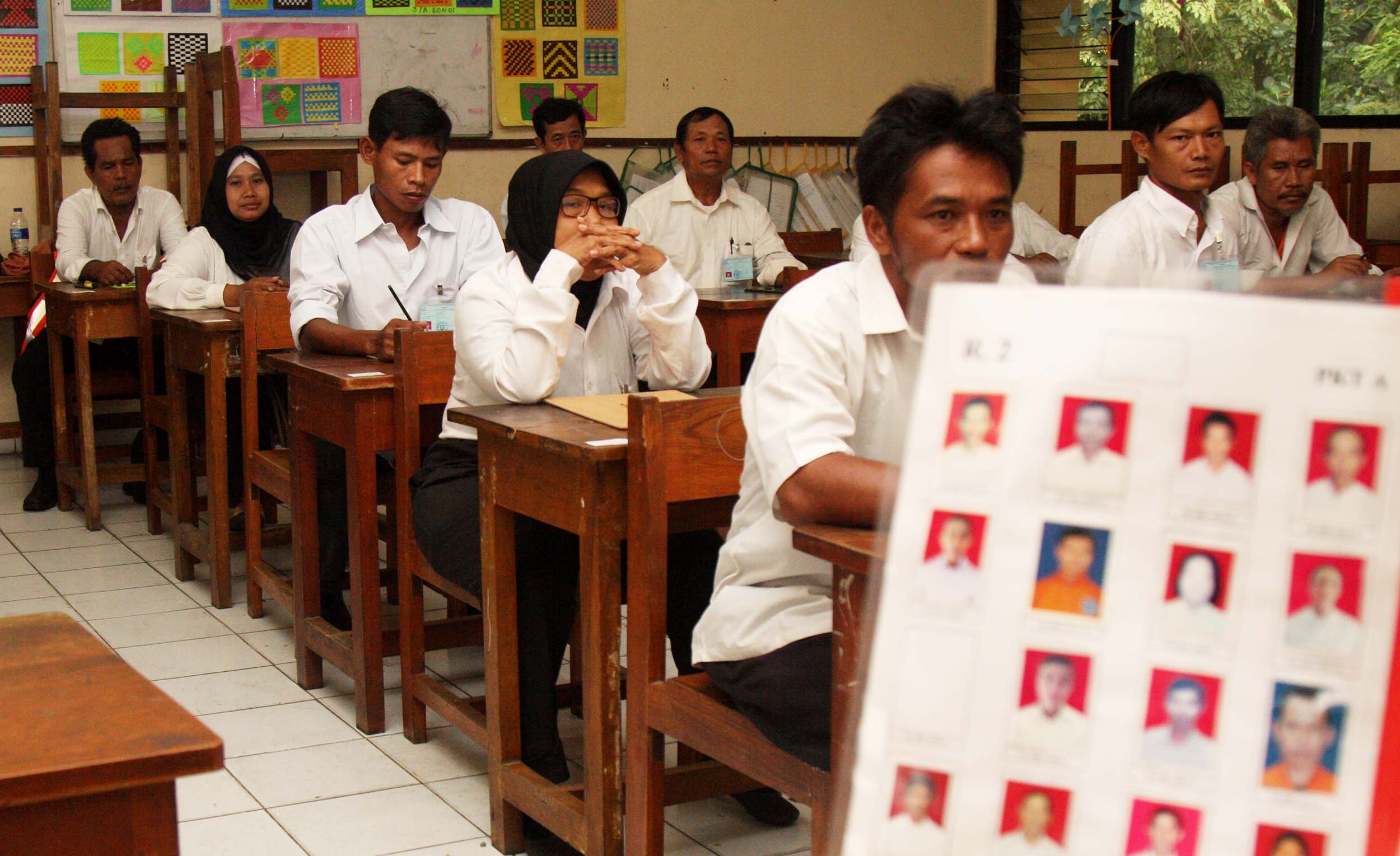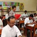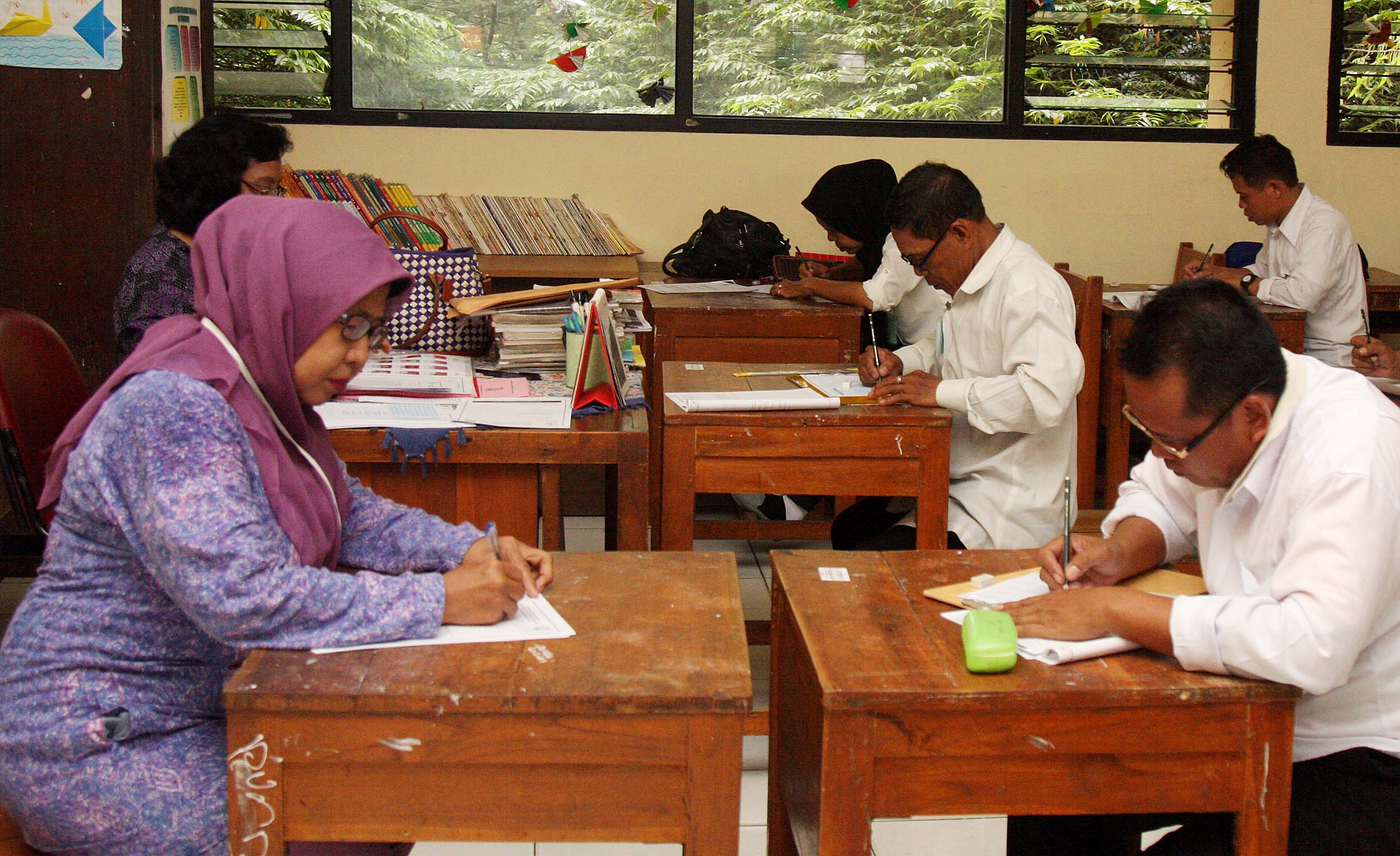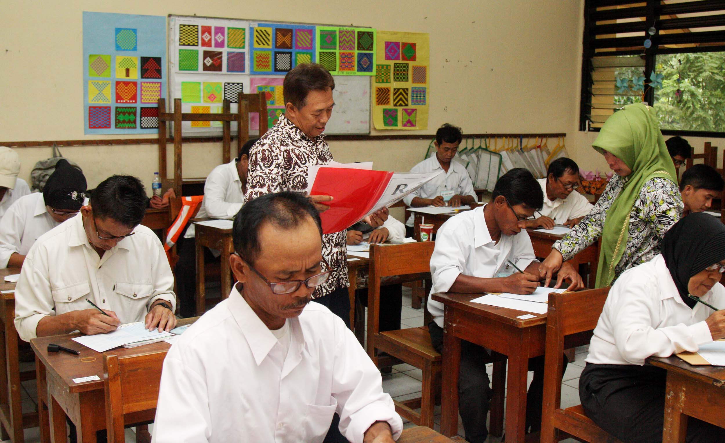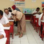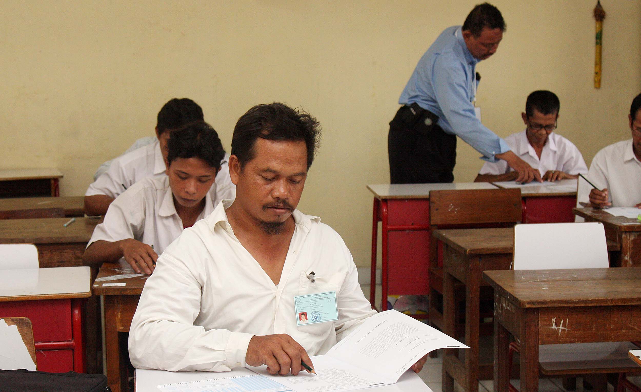 Pengawas ujian membagikan soal dan lembar jawaban kepada peserta ujian penyetaraan Paket A , di di Jakarta, Senin (16/05/2016). Ujian kejar Paket A digelar di Jakarta muali hari ini, Ujian Kejar Paket A adalah ujian penyetaraan dengan Sekolah Dasar (SD) dan para peserta ujian akan melaksanakan ujian hingga tanggal 18 Mei 2016.