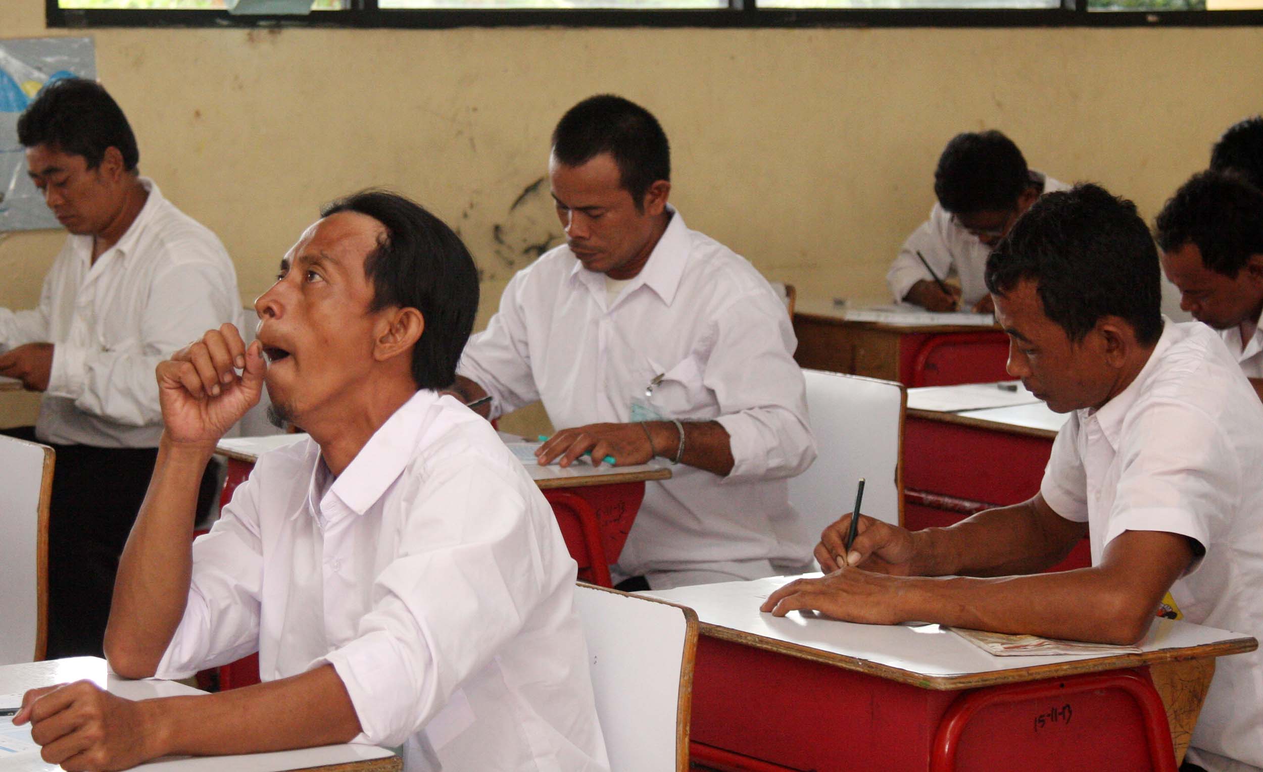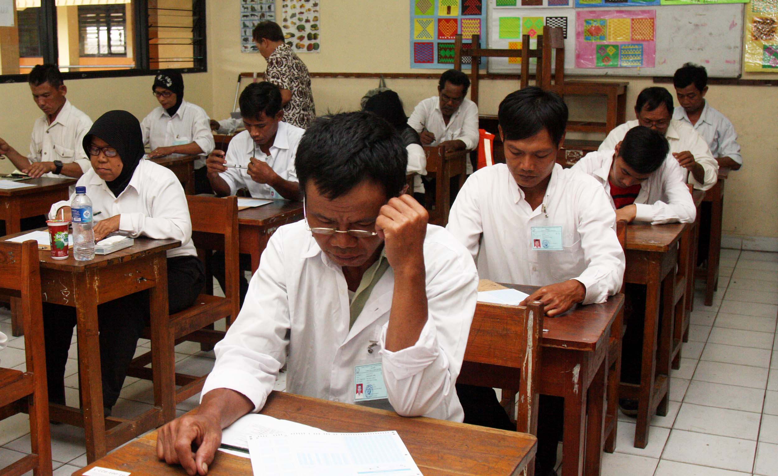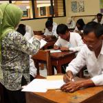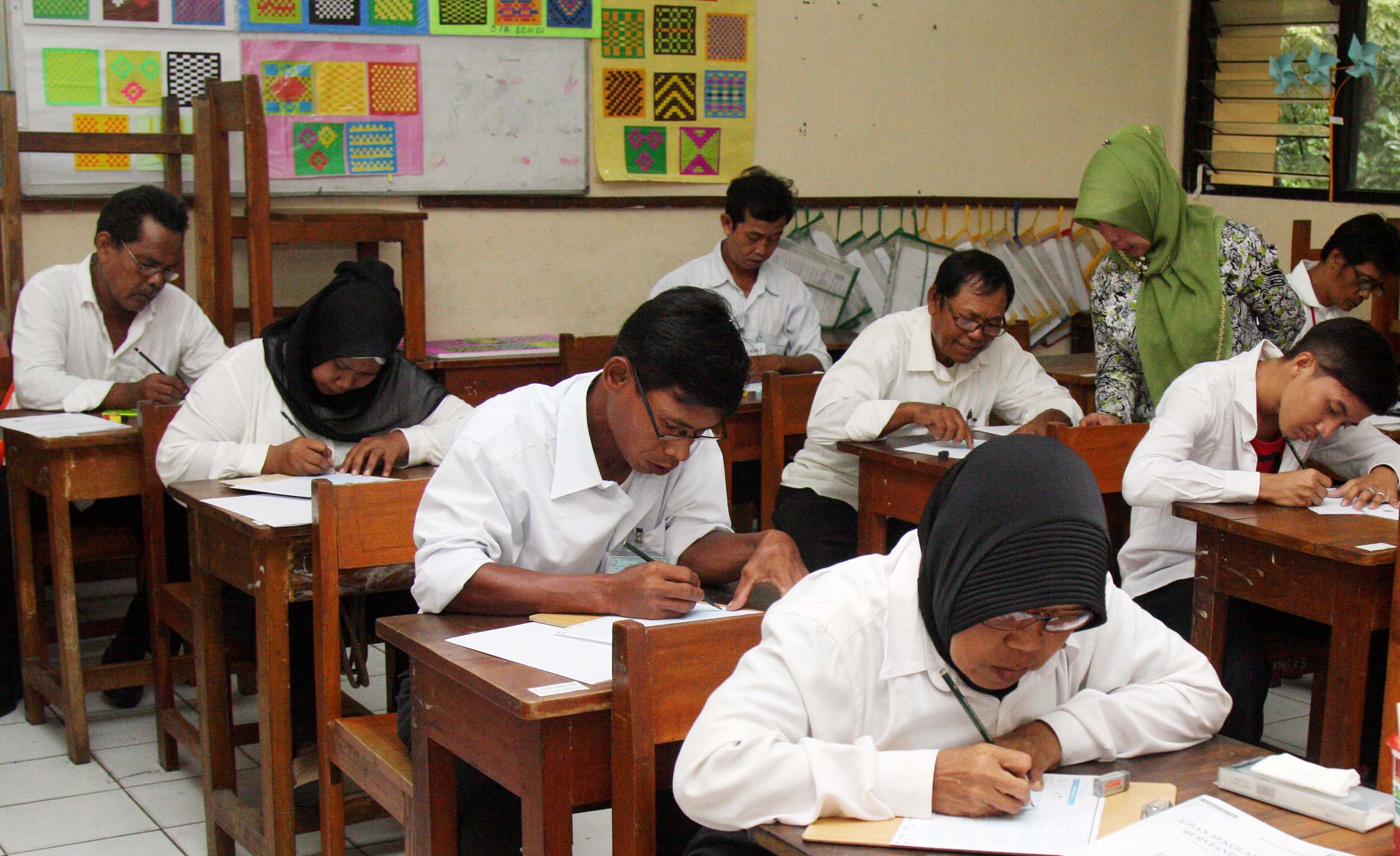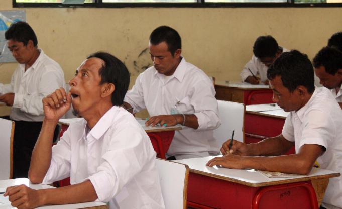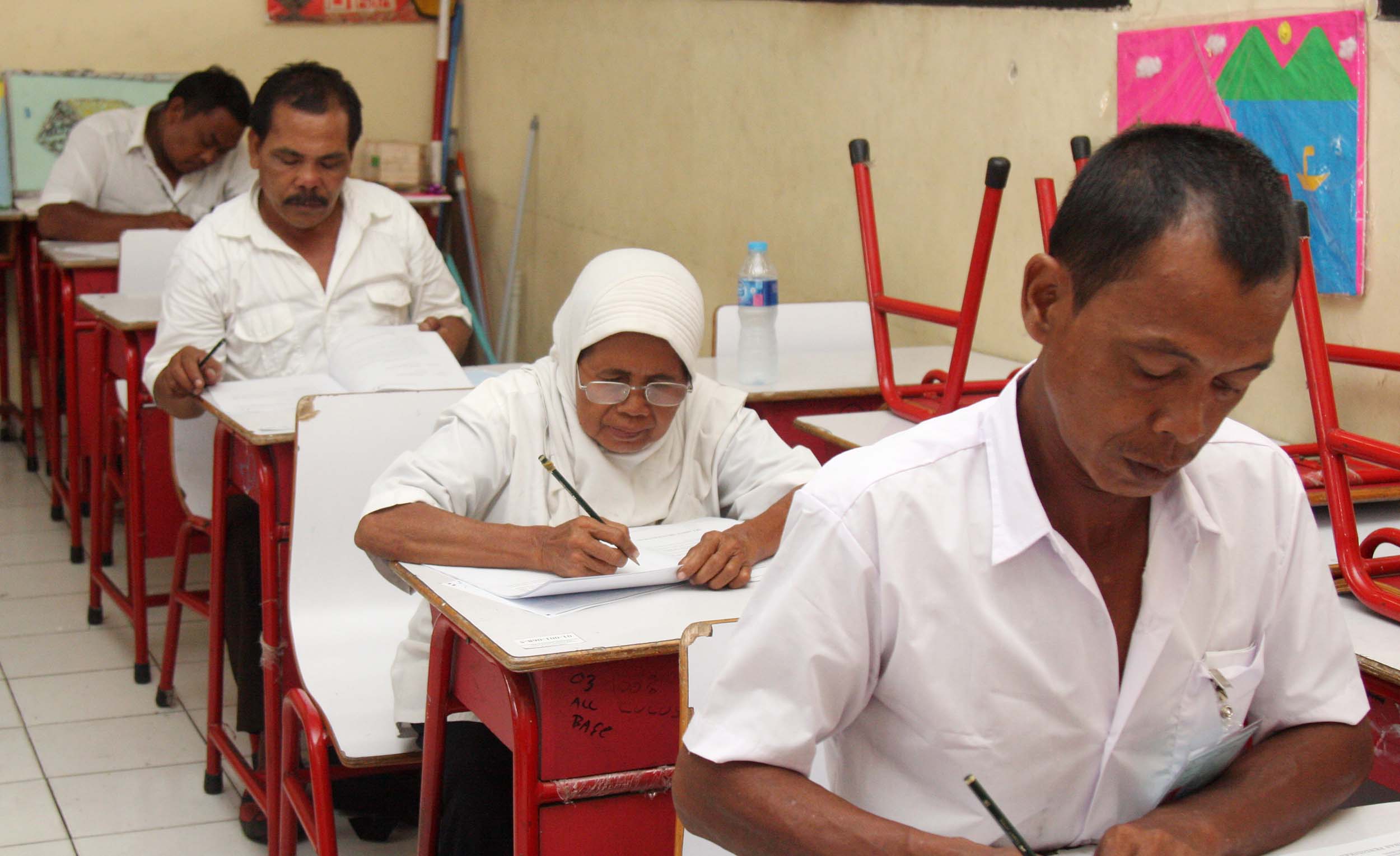 Hari Ini peserta ujian Paket A mengerjakan dua Mata Ujian, yaitu Bahasa Indonesia dan Pendidikan Kewarganegaraan di Jakarta, Senin (16/5/2016). Para peserta ujian berasal dari berbagai kalangan, usia dan ujian akan melaksanakan ujian hingga tanggal 18 Mei 2016.