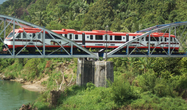 Railbus melewati jembatan kereta api saat ujicoba rute Padang-Kayutanam, di Pasar Usang, Kabupaten Padangpariaman, Sumatra Barat, Selasa (12/7). PT Kereta Api Indonesia (Persero) Divre II Sumbar melakukan ujicoba railbus untuk rute transit Lubuk Alung-Kayutanam yang rencana akan dioperasikan pada Agustus 2016 mendatang. Uji rute pertama tidak sampai tujuan karena atap railbus tidak bisa melewati jembatan di kawasan Parik Malintang, Padangpariaman. ANTARA FOTO/Iggoy el Fitra/kye/16