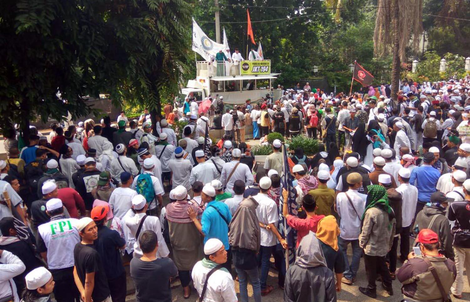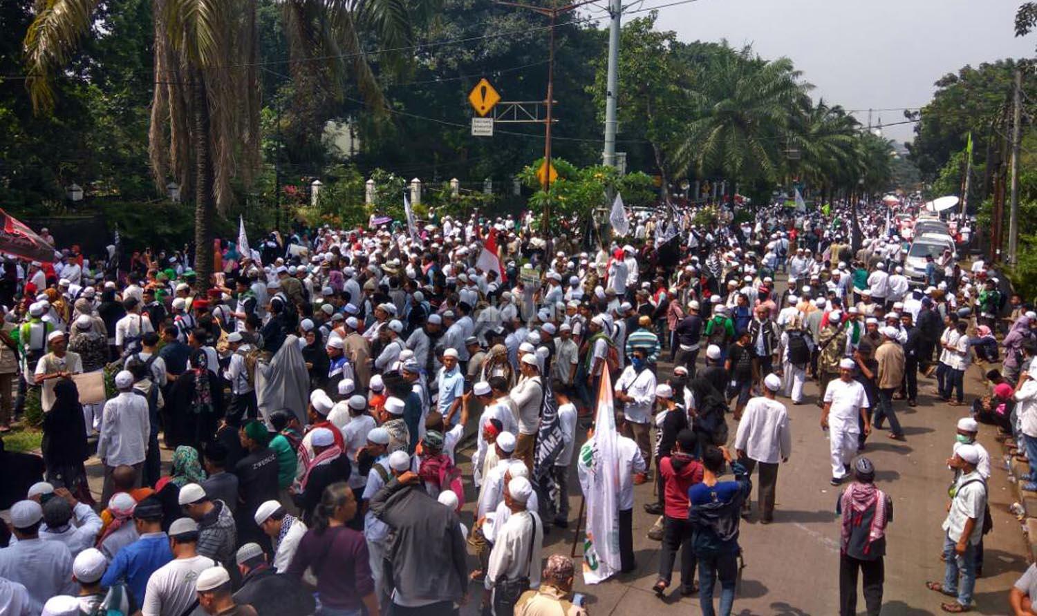 Ratusan massa kontra Basuki Tjahaja Purnama melakukan aksi unjuk rasa di Jalan RM Harsono, Jakarta Selatan, Selasa (25/4/2017). Dalam aksinya massa kontra ahok meminta majelis hakim memutuskan ahok bersalah karena sudah terbukti menodakan agama Islam. Sambil membacakan takbir dan shalawat massa meramaikan sidang pembacaan pleidoi di auditorium Kementan, Jakarta yang dijaga ketat oleh pihak kepolisian. AKTUAL/Tri Wahyudhi