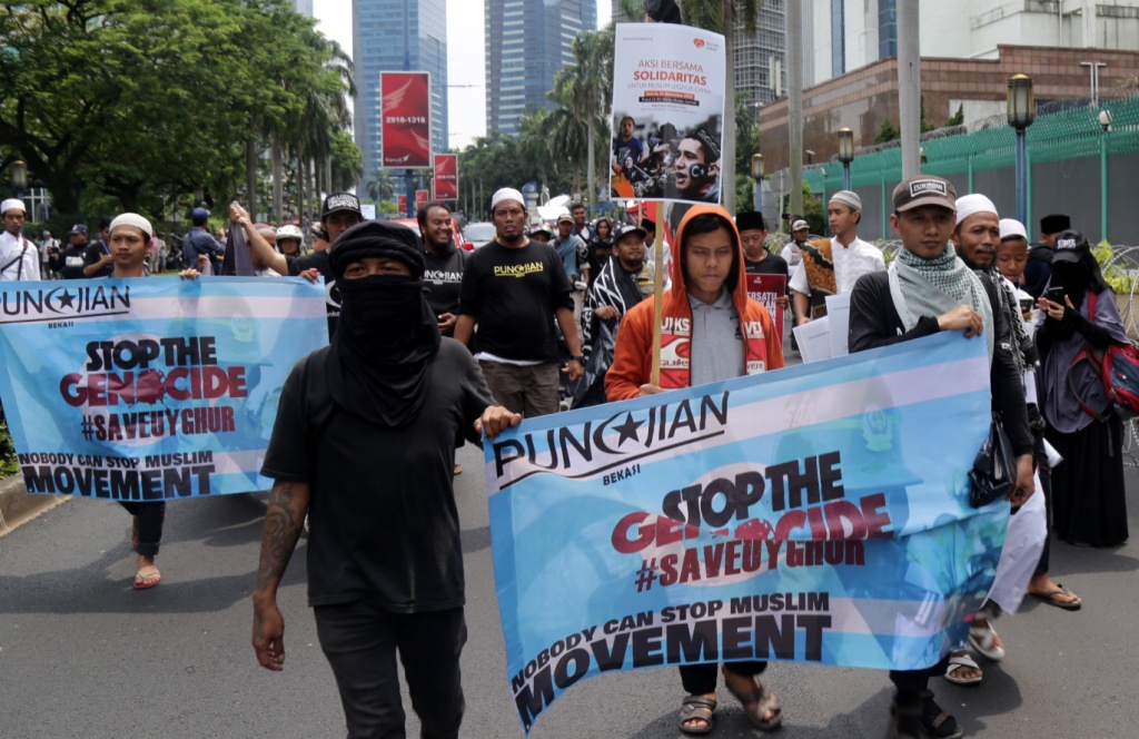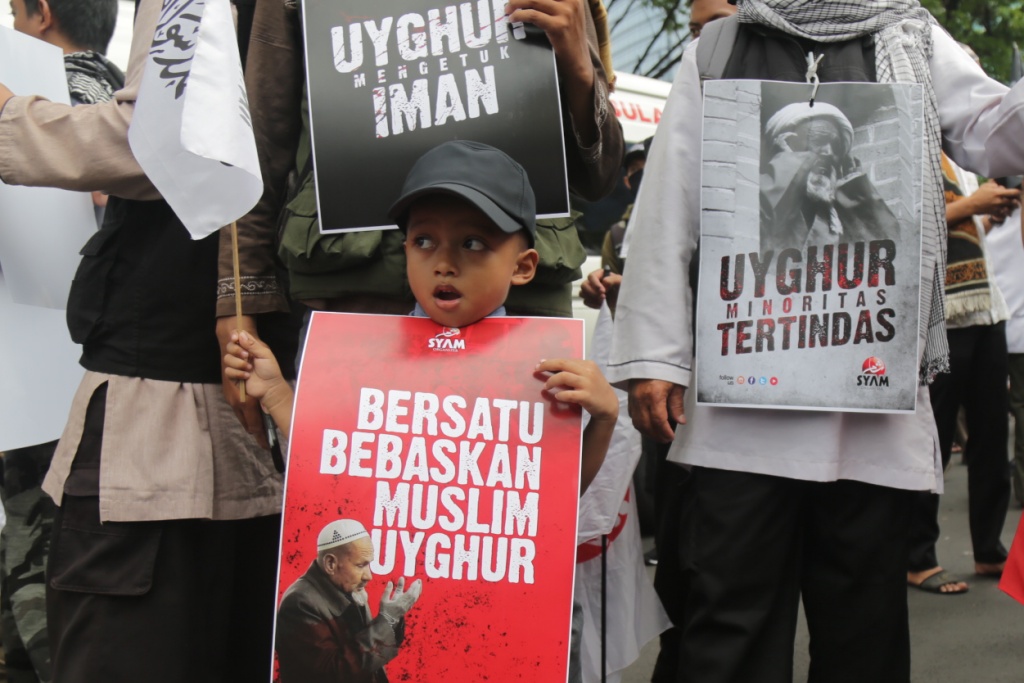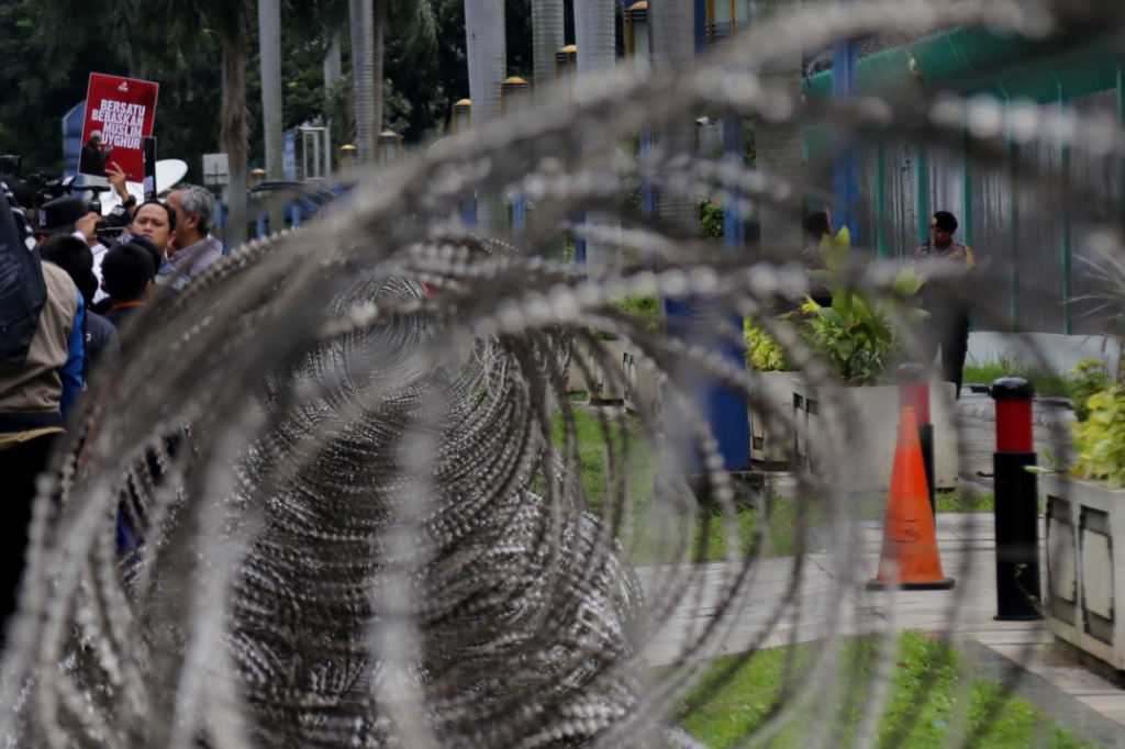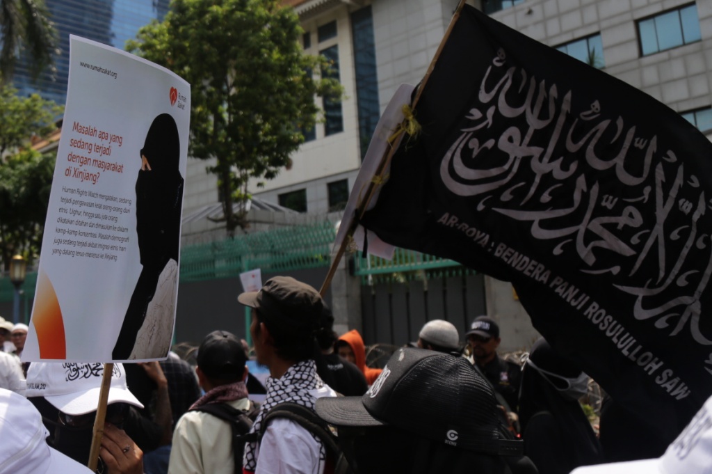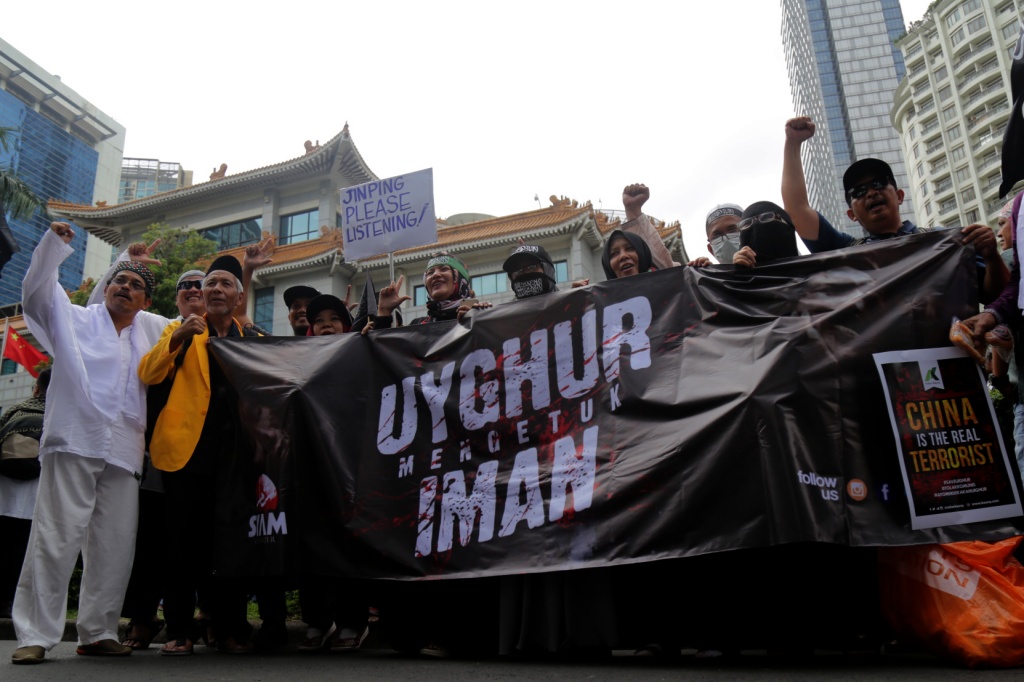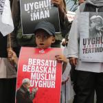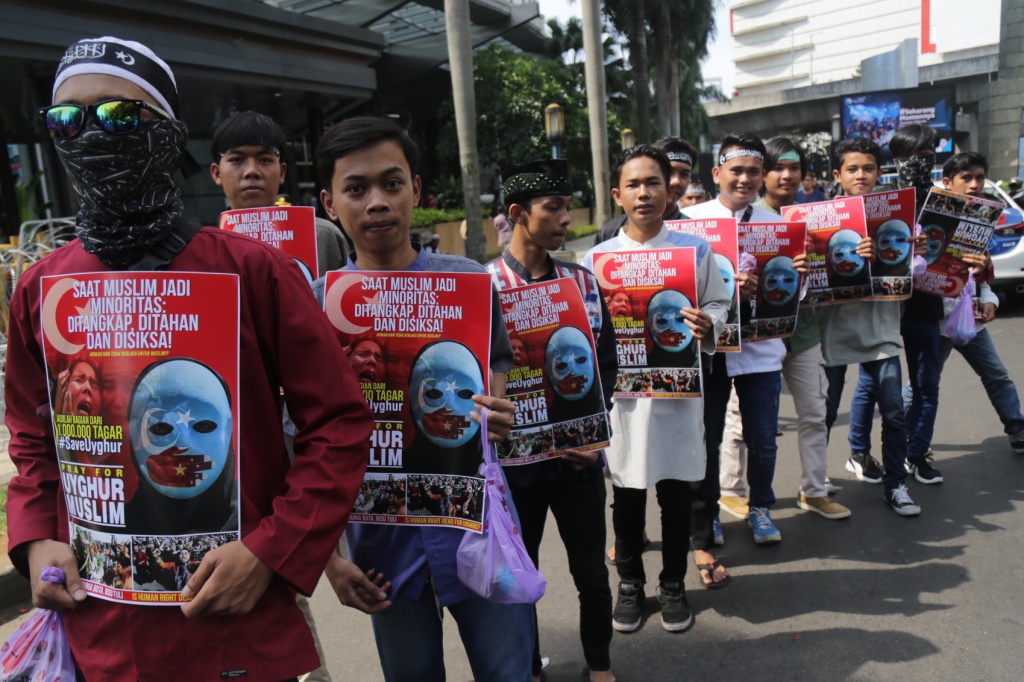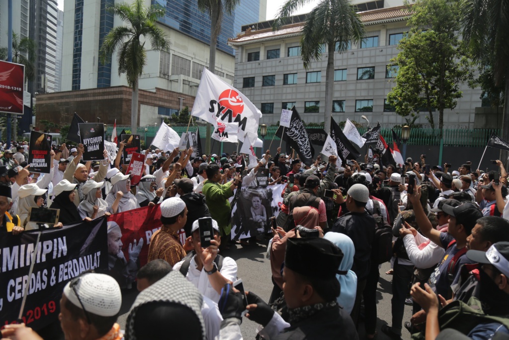Ribuan Umat Muslim menggelar aksi mengutuk keras terhadap aksi penindasan Muslim Uighur di Provinsi Xinjiang, Republik Rakyat China (RRC) di depan Kedutaan Besar China, di Jalan Mega Kuningan, Setiabudi, Jakarta Selatan, Jumat (21/12/2018). Mereka menyikapi konflik yang terjadi pada muslim Uighur mengalami penyiksaan, intimidasi, diskriminasi, hingga larangan menjalankan agama sesuai syariat Islam. Dalam aksi tersebut mereka menyerukan untuk mengusir Dubes China dari Indonesia, atas perlakuan terhadap Muslim Uighur di negaranya. AKTUAL/Tino Oktaviano
