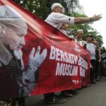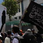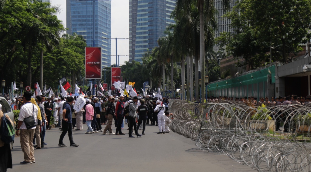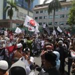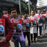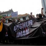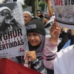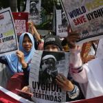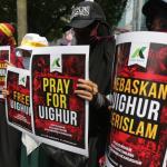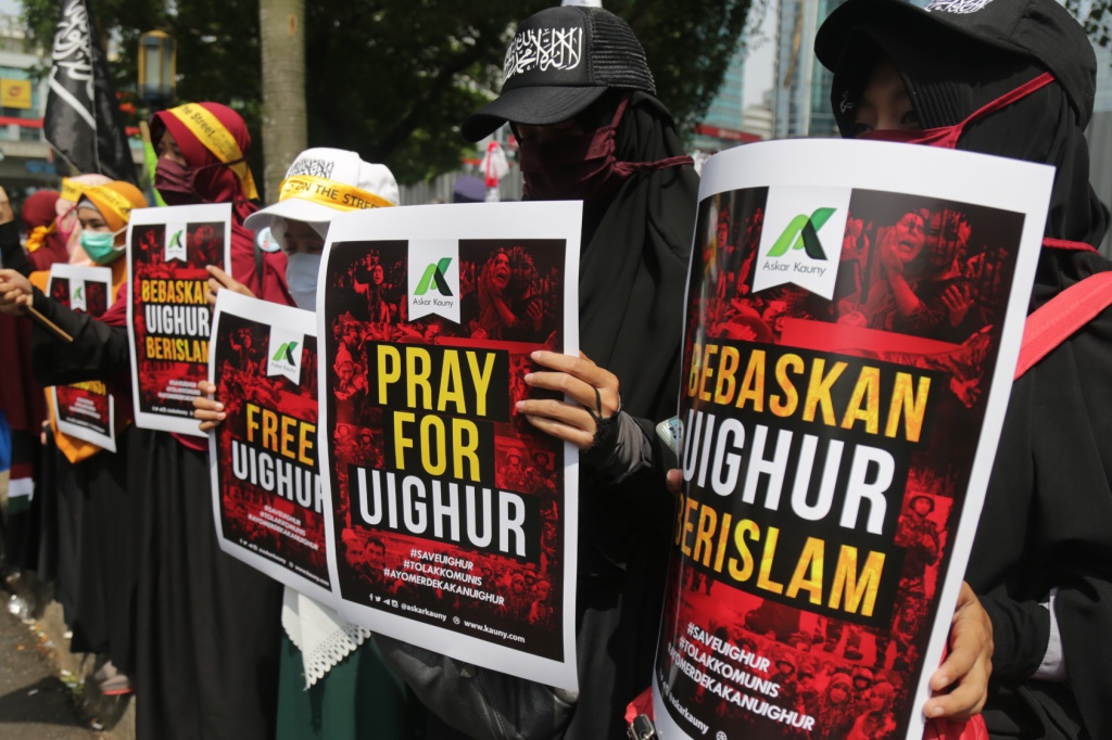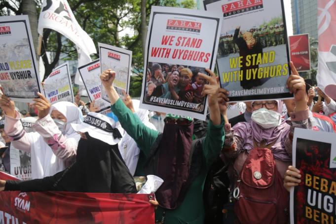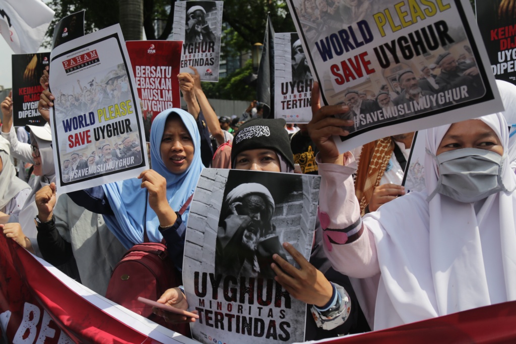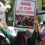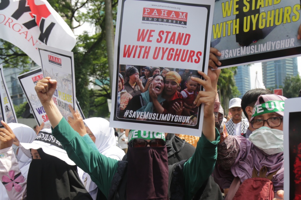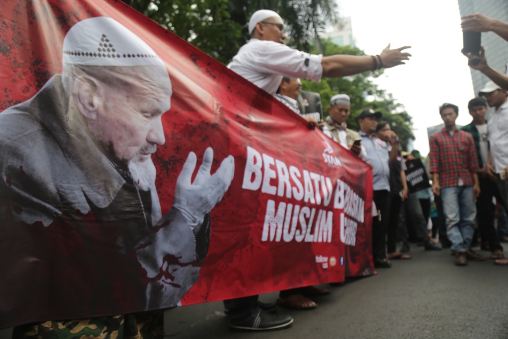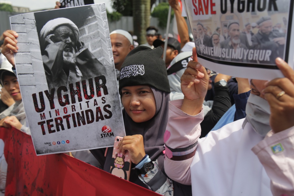 Ribuan Umat Muslim menggelar aksi mengutuk keras terhadap aksi penindasan Muslim Uighur di Provinsi Xinjiang, Republik Rakyat China (RRC) di depan Kedutaan Besar China, di Jalan Mega Kuningan, Setiabudi, Jakarta Selatan, Jumat (21/12/2018). Mereka menyikapi konflik yang terjadi pada muslim Uighur mengalami penyiksaan, intimidasi, diskriminasi, hingga larangan menjalankan agama sesuai syariat Islam. Dalam aksi tersebut mereka menyerukan untuk mengusir Dubes China dari Indonesia, atas perlakuan terhadap Muslim Uighur di negaranya. AKTUAL/Tino Oktaviano