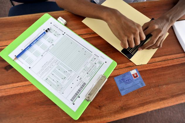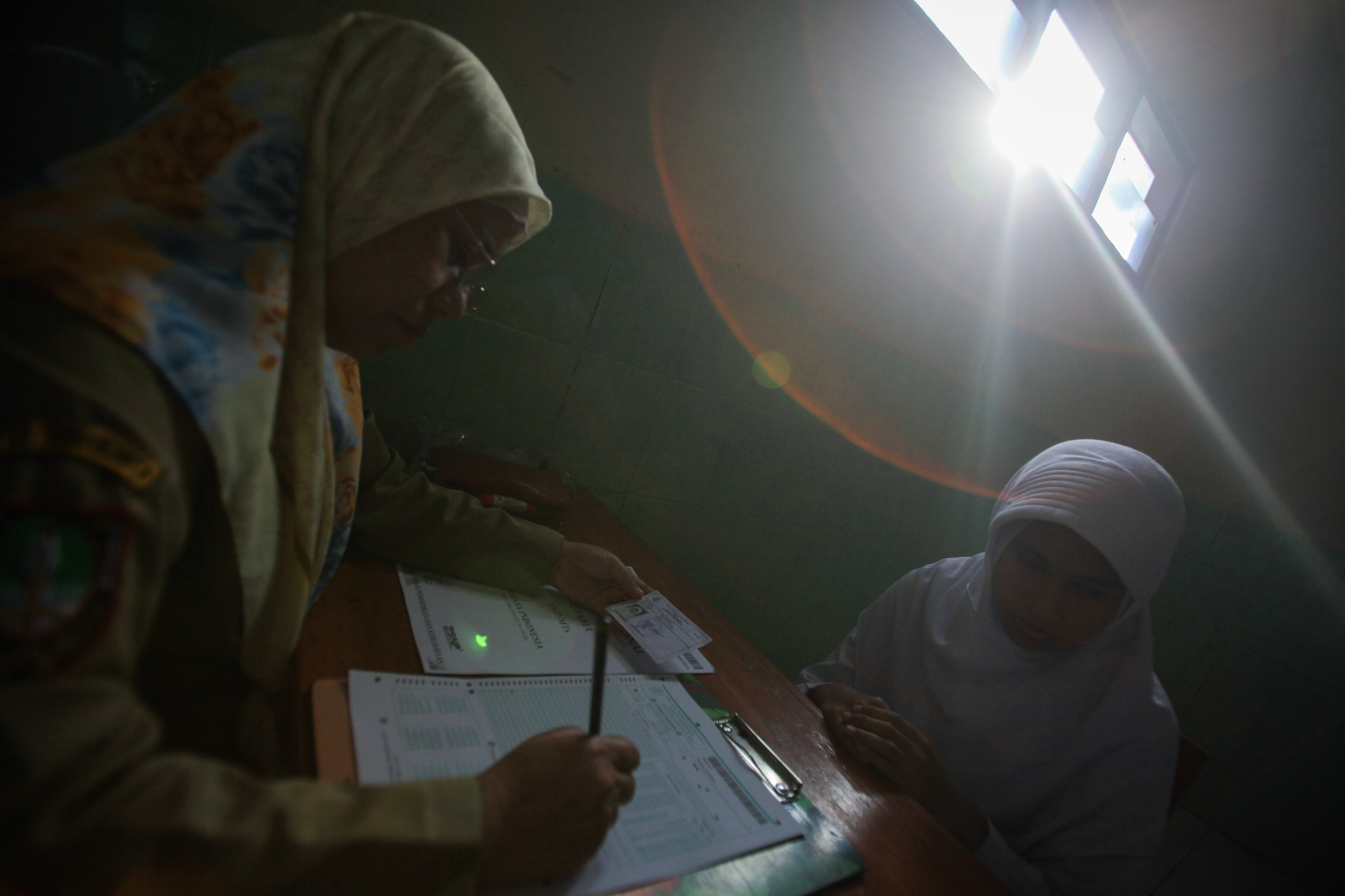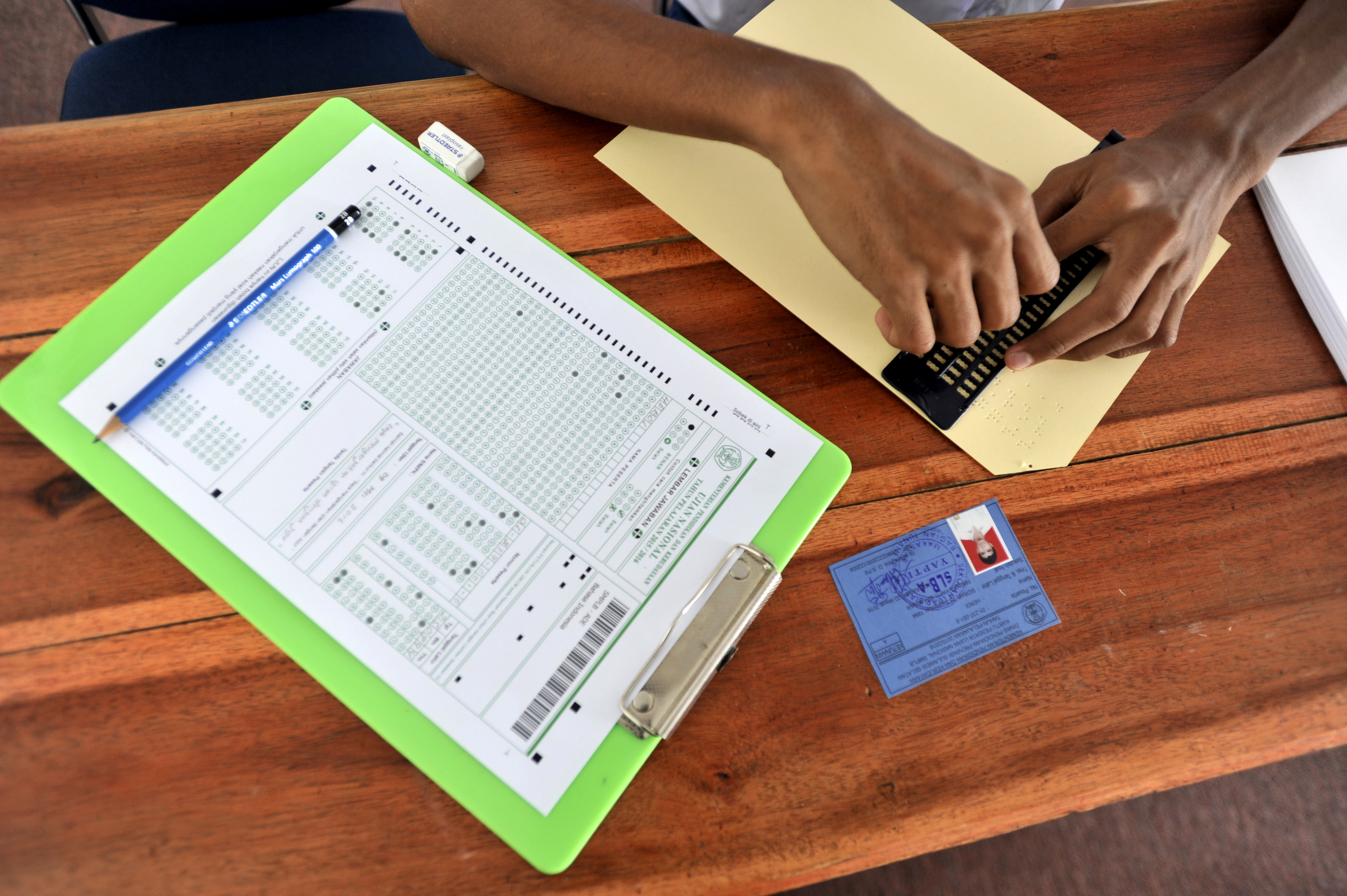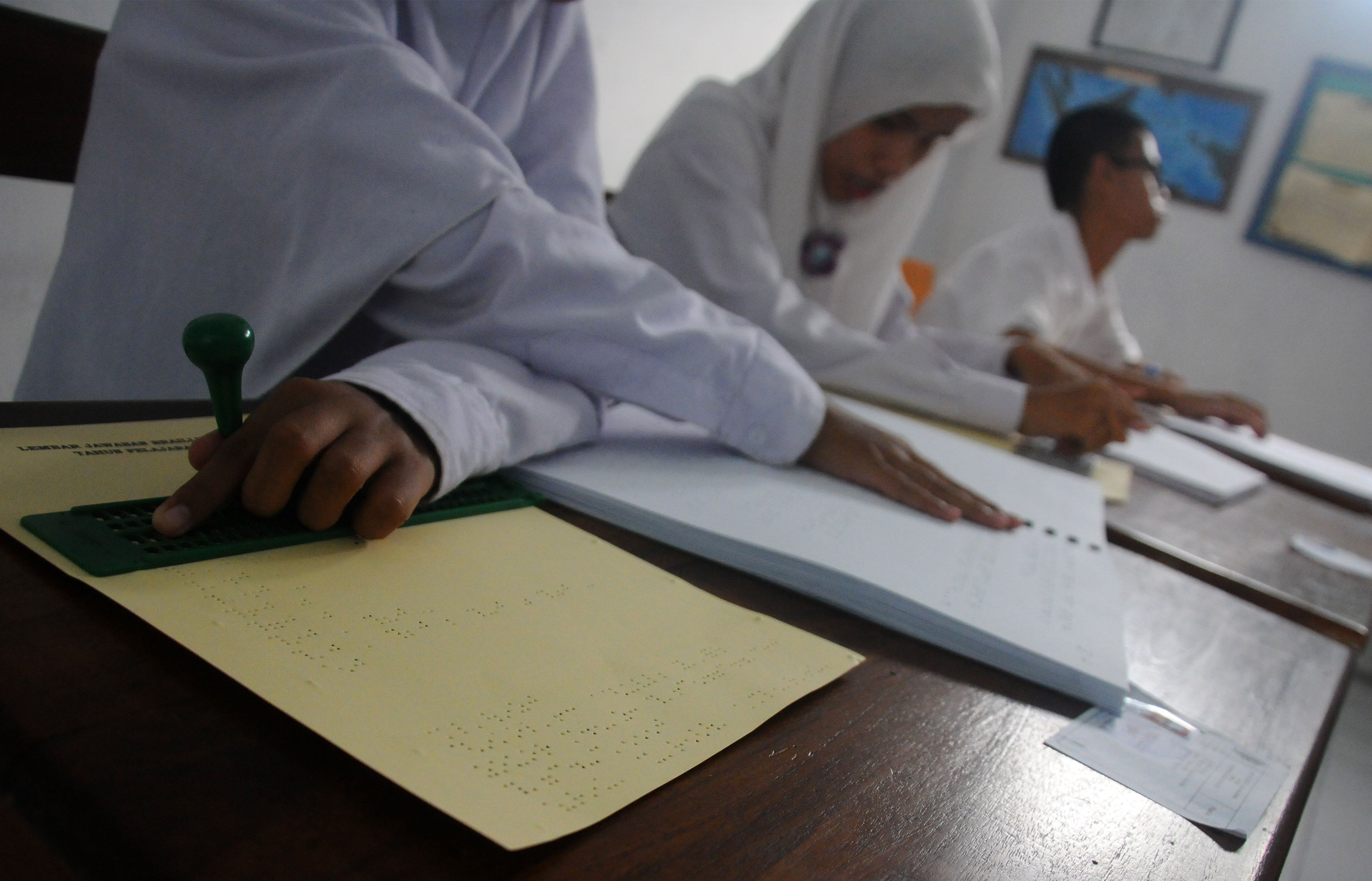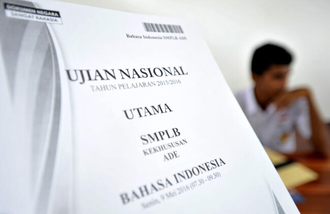 Sejumlah siswa tuna netra mengerjakan soal Ujian Nasional (UN) 2916 dengan huruf braile di Sekolah Luar Biasa Yayasan Anak-anak Tuna (SLB-B YAAT) Klaten, Jawa Tengah, Senin (9/5). Ujian Nasional tingkat SMP atau sederajat serentak diselenggarakan secara nasional mulai 9 Mei 2016, dengan jumlah peserta UN seluruh Indonesia sebanyak 4.052.068 siswa, termasuk 18.004 siswa peserta UN SMP di Kabupaten Klaten. ANTARA FOTO/Aloysius Jarot Nugroho/foc/16.
