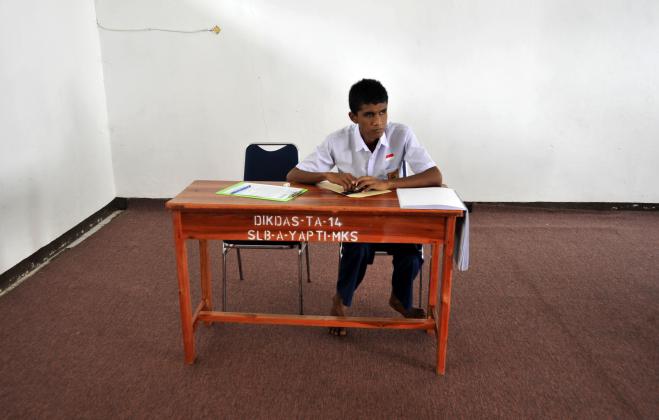 Siswa tuna netra menjawab pertanyaan saat mengikuti Ujian Nasional (UN) tingkat SMP di SLBA Yapti Makassar, Sulawesi Selatan, Senin (9/5). Sebanyak 23.218 pelajar Sekolah Menengah Pertama (SMP) dan sederajat mengikuti UN di Makassar. ANTARA FOTO/Yusran Uccang/foc/16.