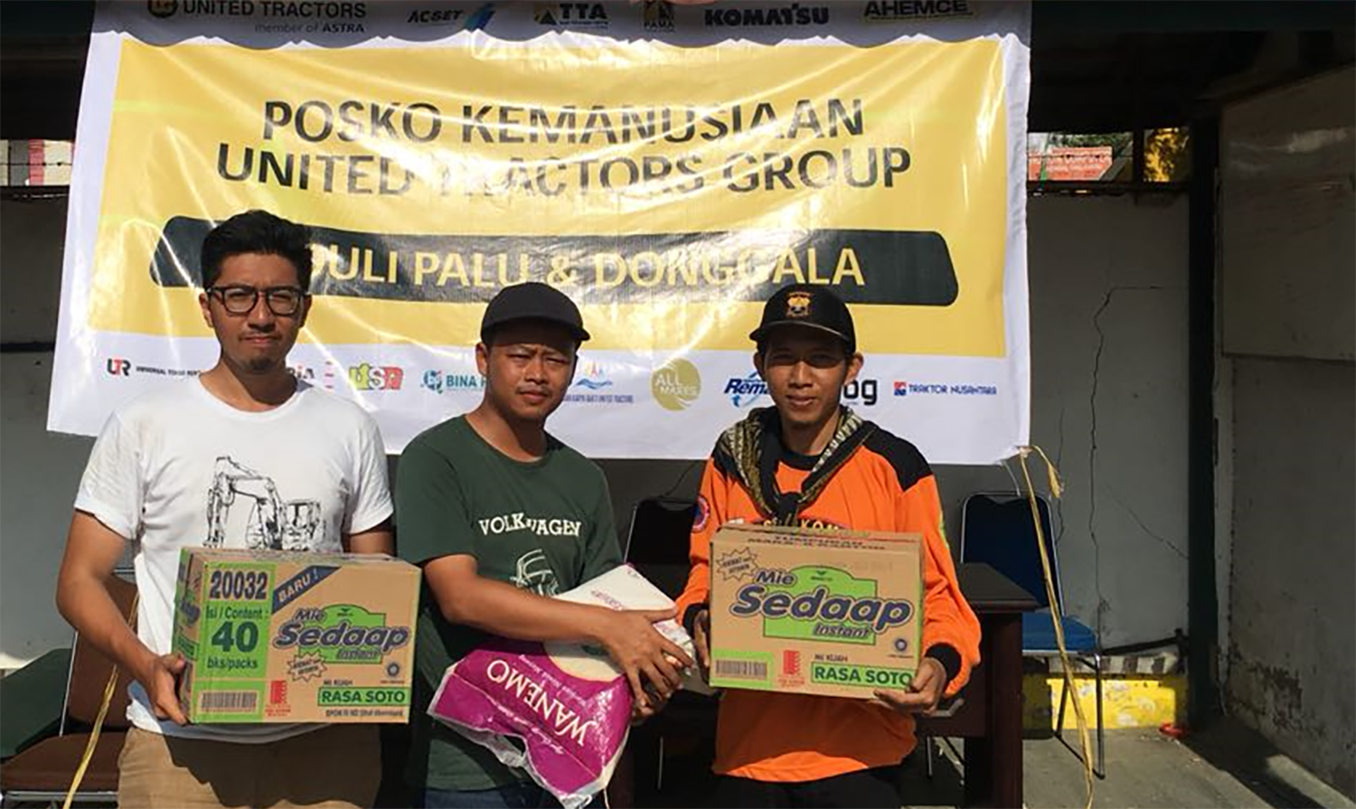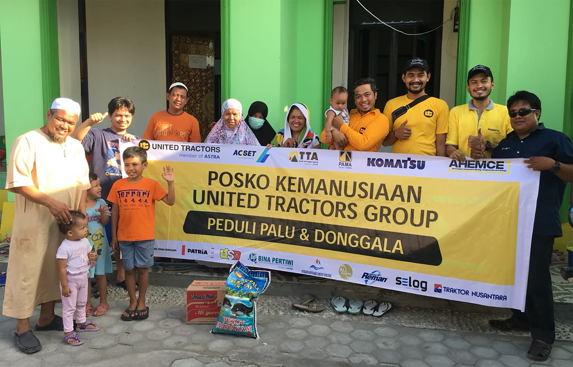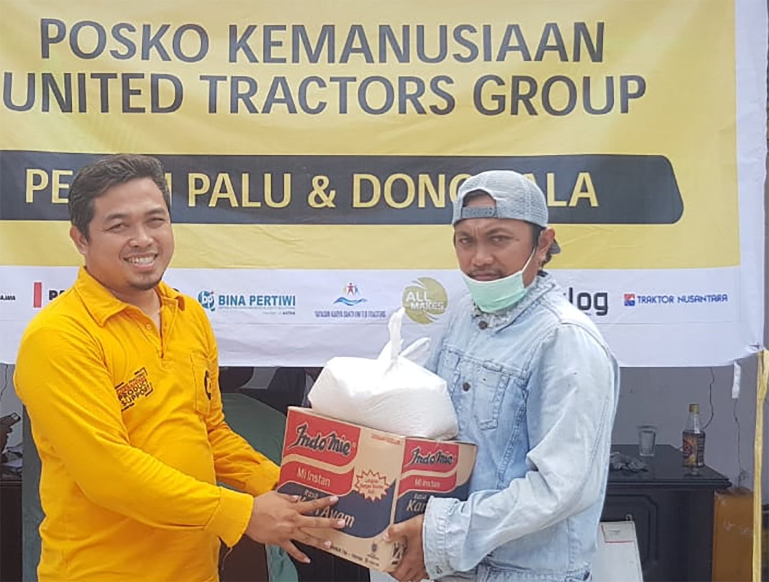 Sejumlah karyawan United Tractors memberikan bantua sembako kepada korban gempa dan tsunami di Palu dan Donggala Pekan lalu. Dalam penanganan bencana gempa dan tsunami di Palu dan Donggala, United Tractors Group bergerak cepat mengerahkan alat berat sekaligus menyalurkan bantuan bagi korban bencana. UT Group memulai pada tahap evakuasi dengan mendatangkan sejumlah alat berat berupa 4 unit excavator, 1 unit bulldozer dan 1 unit lowboy yang beroperasi di Kelurahan Balaroa, Palu, Sulawesi Tengah. AKTUAL/Dok United Tractors