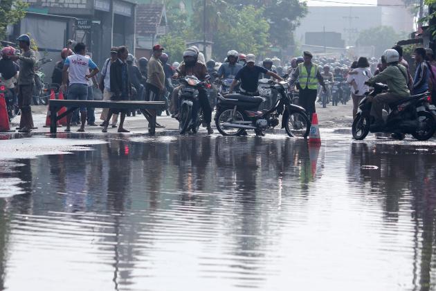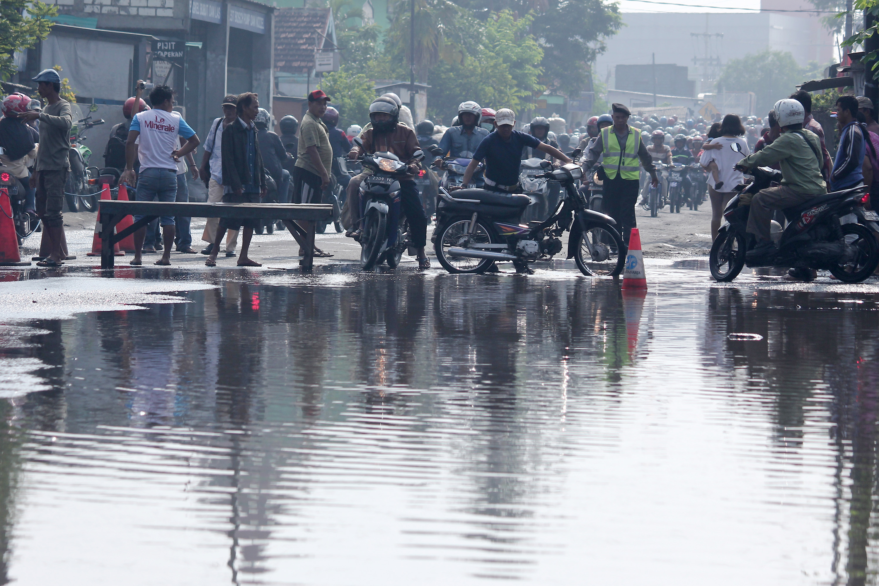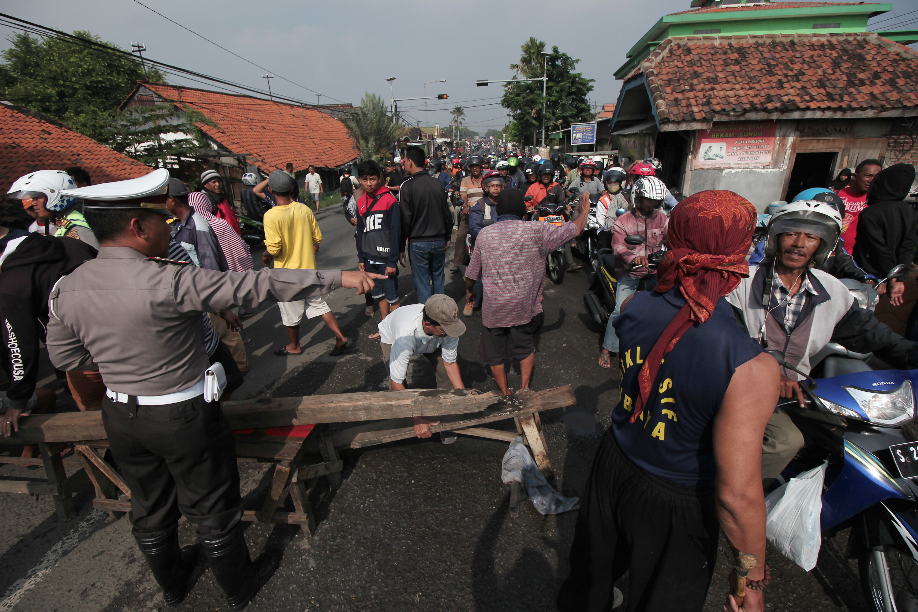 Warga memblokir jalan saat unjuk rasa di jalan Kalianak, Surabaya, Jawa Timur, Senin (22/2). Unjuk rasa menuntut perbaikan jalan Kalianak yang rusak parah dan telah menelan korban jiwa tersebut berujung ricuh. ANTARA FOTO/Didik Suhartono/pd/16