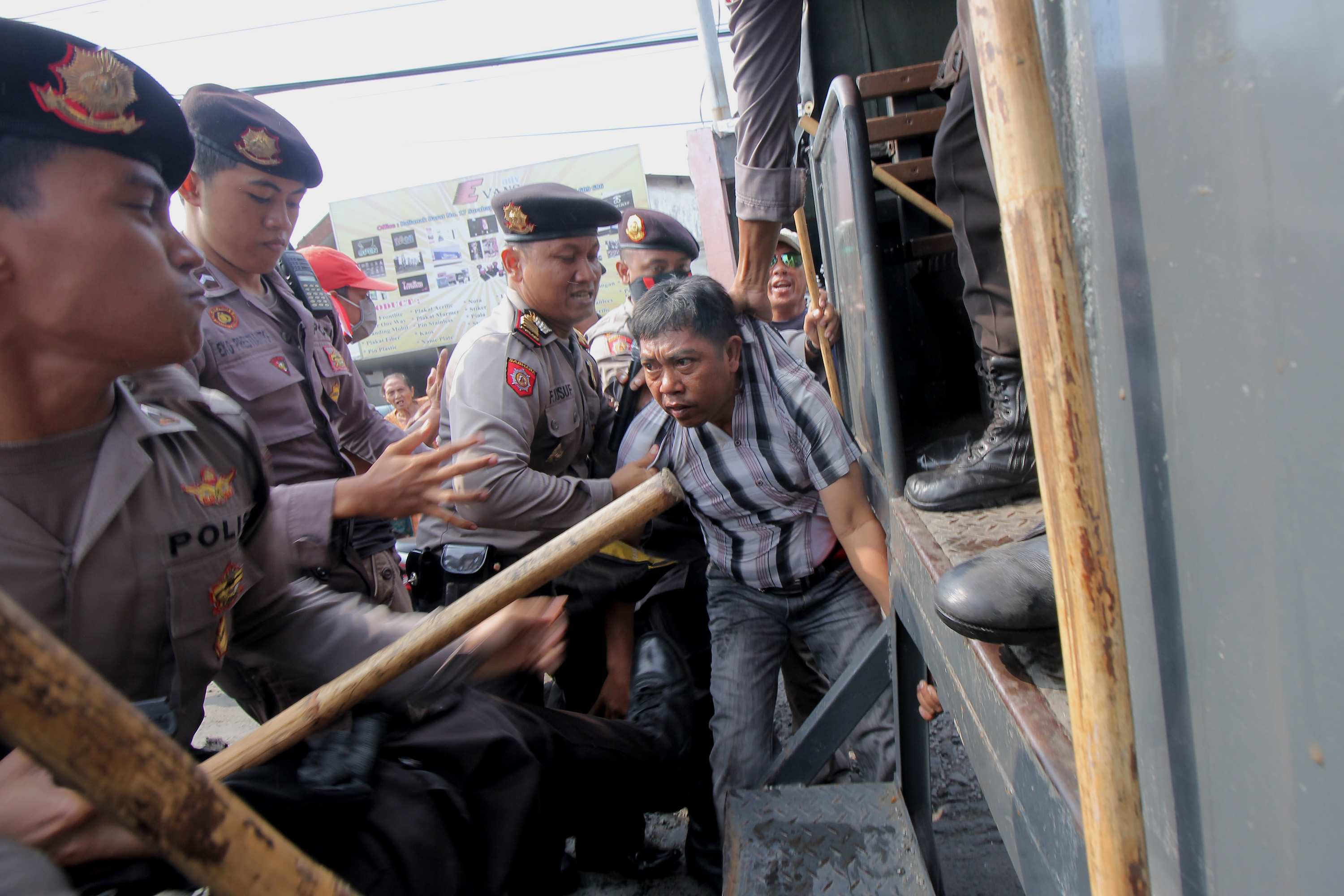 Polisi mengamankan warga yang diduga sebagai provokator saat unjuk rasa di jalan Kalianak, Surabaya, Jawa Timur, Senin (22/2). Unjuk rasa menuntut perbaikan jalan Kalianak yang rusak parah dan telah menelan korban jiwa tersebut dibubarkan paksa oleh polisi dan berujung ricuh. ANTARA FOTO/Didik Suhartono/pd/16
