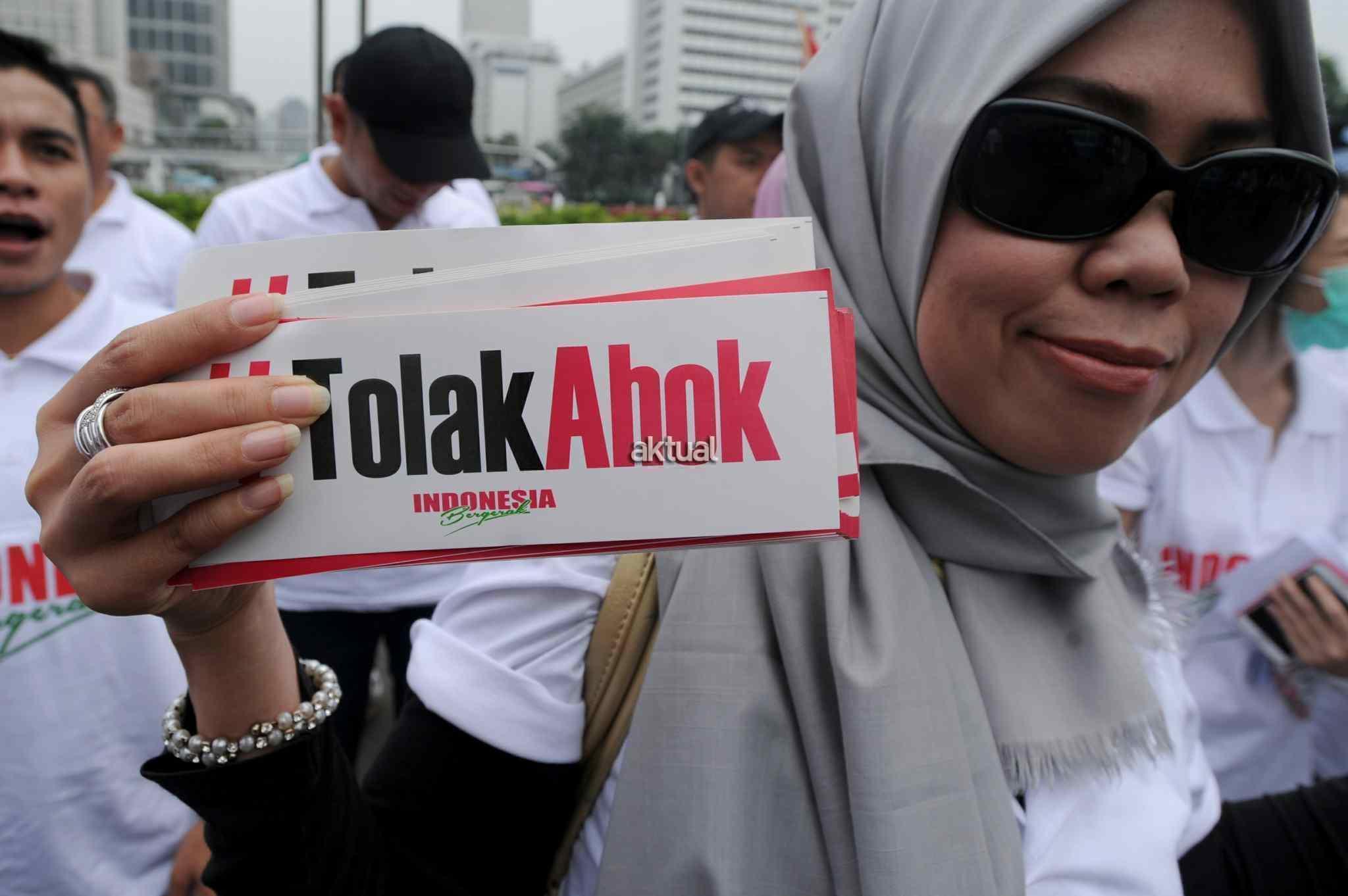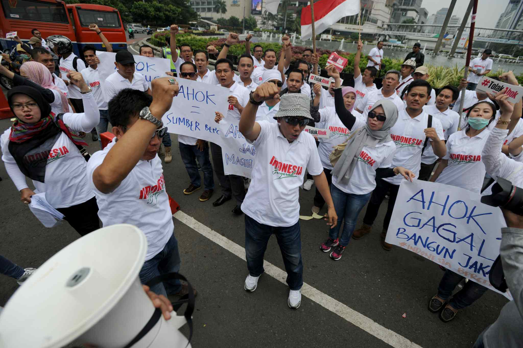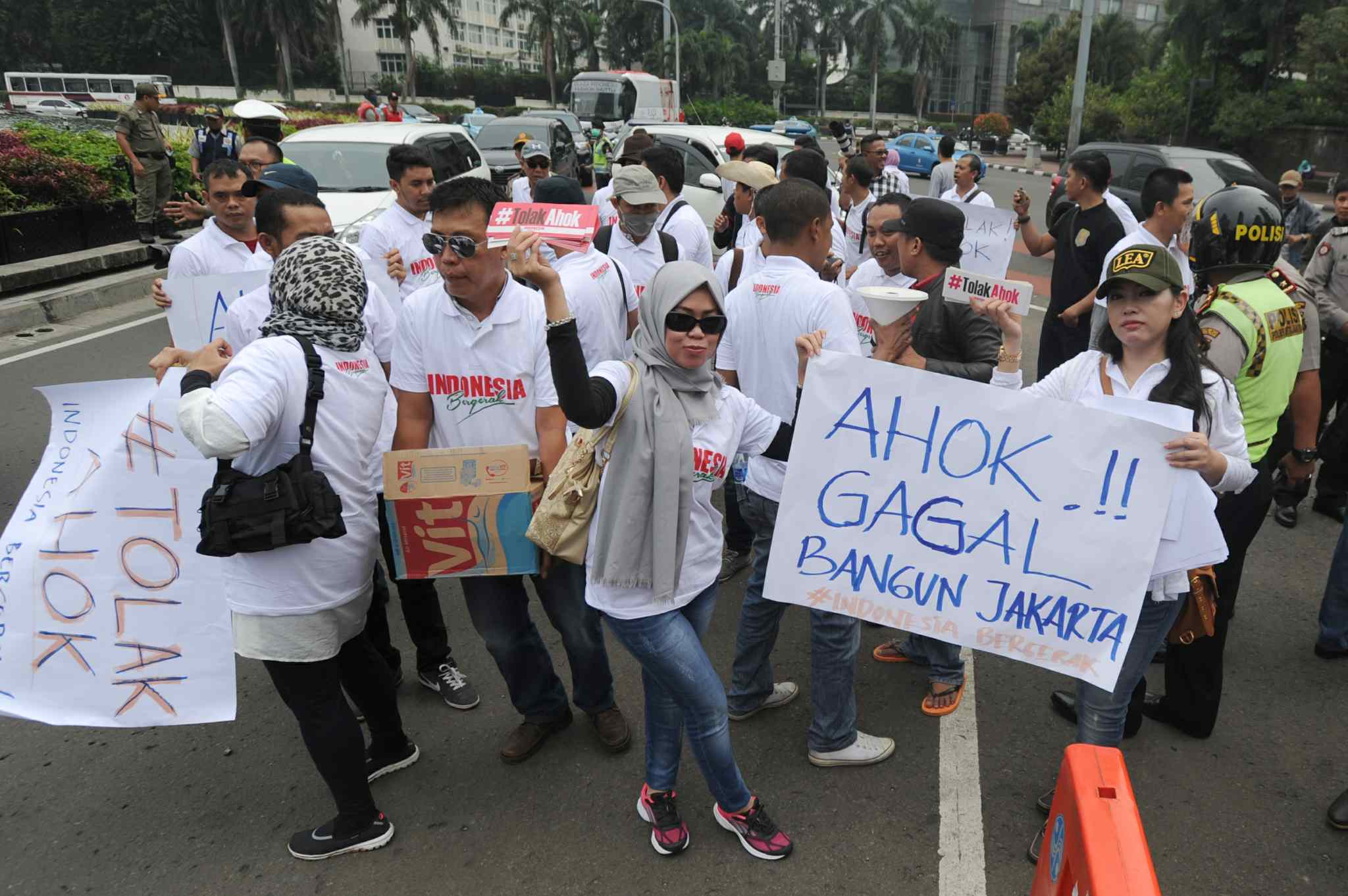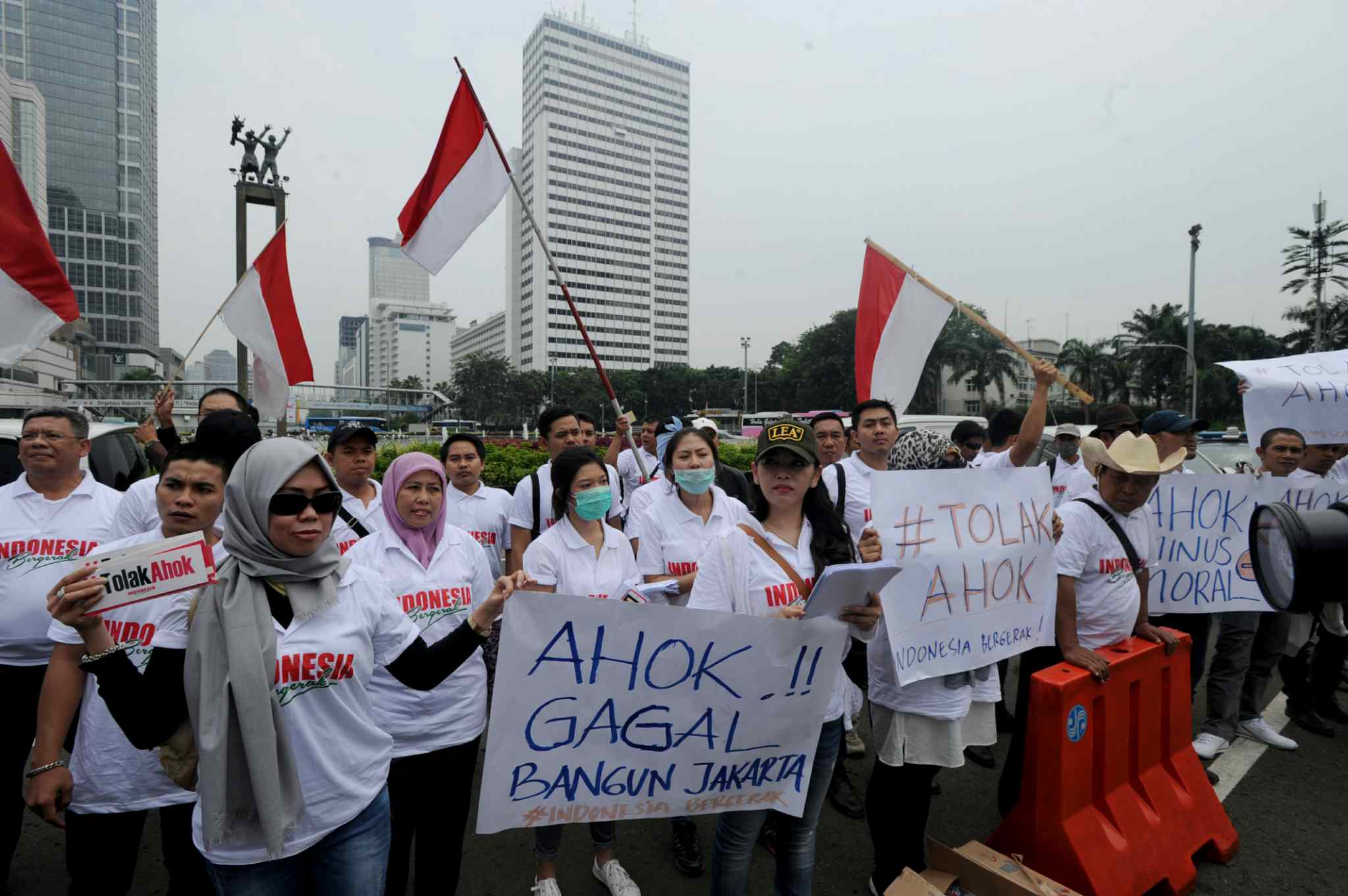 Massa dari Indonesia Bergerak menggelar aksi unjuk rasa menolak pencalonan Basuki Tjahaja Purnama alias Ahok dalam Pilkada DKI Jakarta 2017 di Bunderan HI, Jakarta, Kamis (8/9). Aksi unjuk rasa tersebut tak berlangsung lama. Baru sepuluh menit berjalan, petugas kepolisian kemudian mendatangi dan mengusir mereka. AKTUAL/TINO OKTAVIANO
