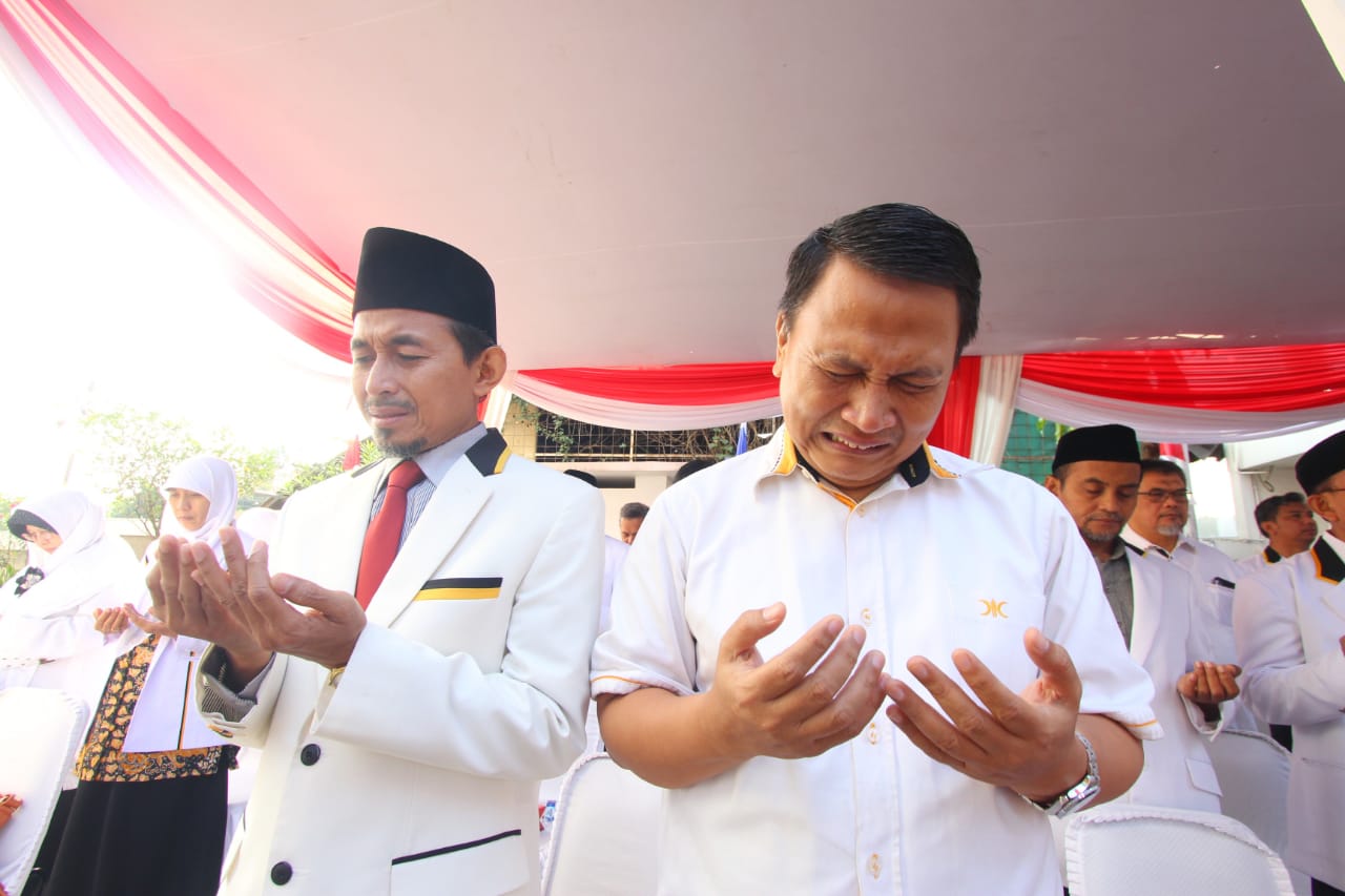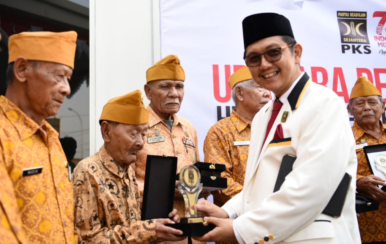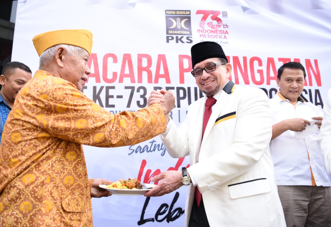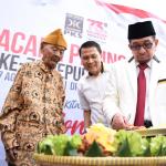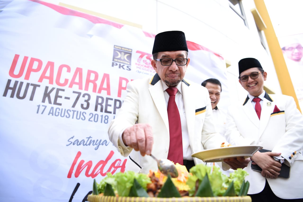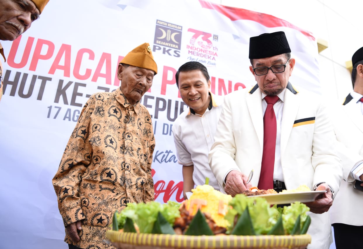 Ketua Majelis Syuro Partai Keadilan Sejahtera (PKS) Habib Salim Segaf Aljufri memotong tumpeng didampingi Sekretaris Jenderal PKS Mustafa Kamal dan Ketua DPP PKS Mardani Ali Sera usai upacara memperingati HUT RI ke-73, di DPP, PKS, Jalan TB Simatupang, Jakarta, Jumat (17/8/2018).  Dalam pesannya, Mustafa mengingatkan tentang pentingnya berkolaborasi dengan pihak manapun untuk mencapai tujuan kemerdekaan yang hakiki. AKTUAL/Dok PKS