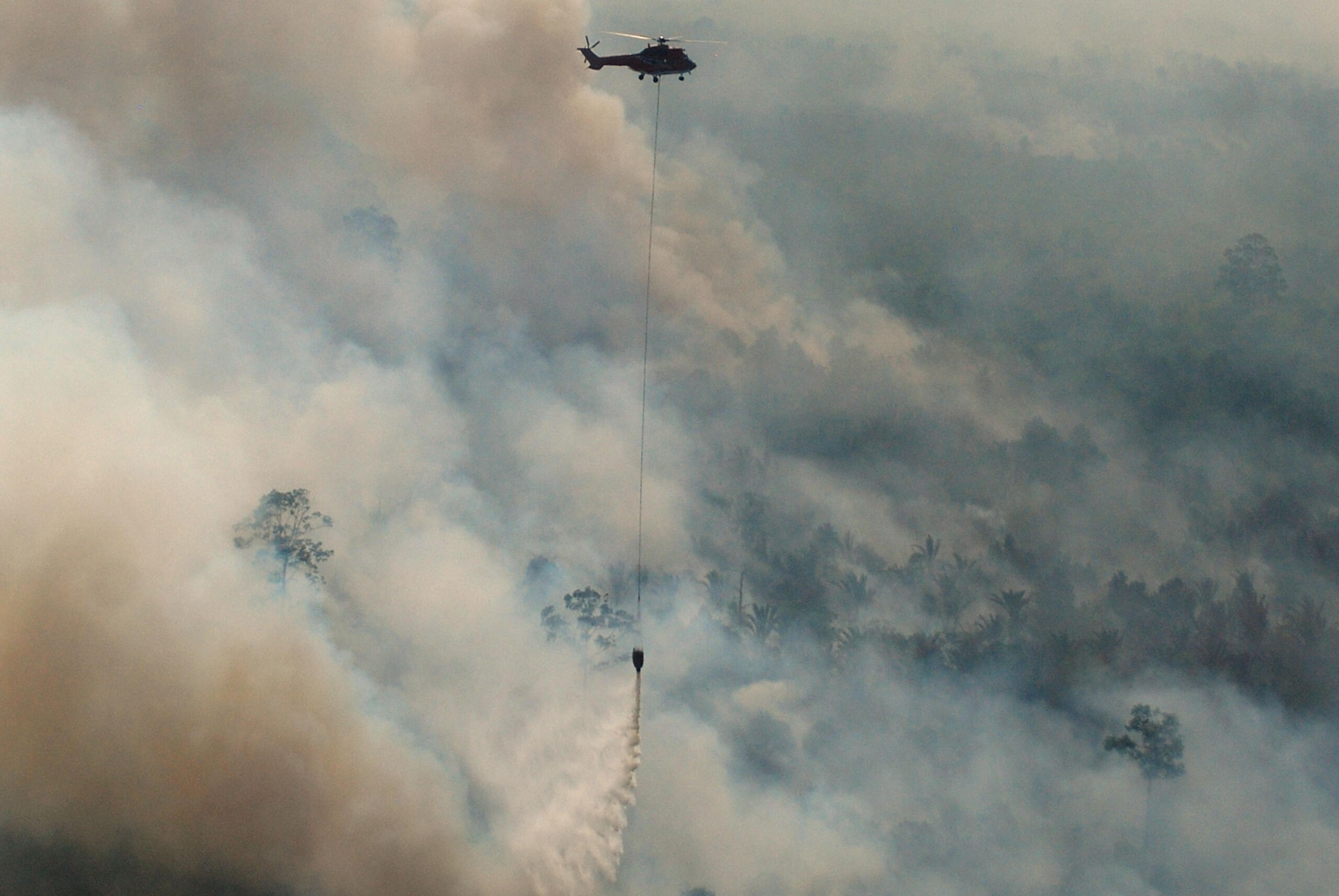 Helikopter Superpuma Sinar Mas Forestry melakukan pengeboman air (water boombing) di atas hutan yang terbakar di Desa Bokor, Kabupaten Kepulauan Meranti, Riau, Selasa (15/3). Dua Helikopter Sinar Mas Forestry berjenis Superpuma PK-DAN dan Eurocopter PK-DAM dikerahkan untuk membantu proses pemadaman kebakaran lahan dan hutan di kawasan tersebut. ANTARA FOTO/Rony Muharrman/kye/16