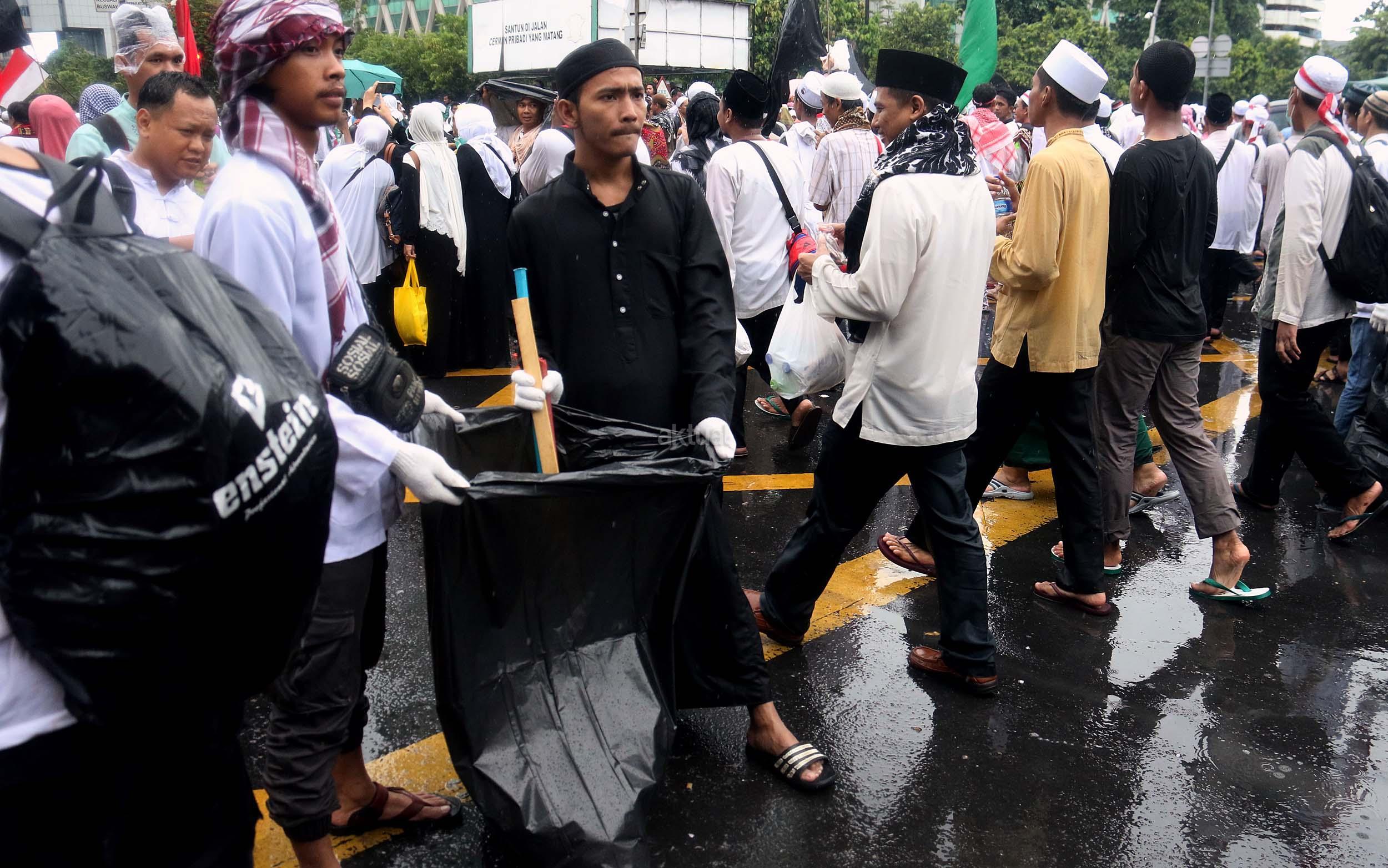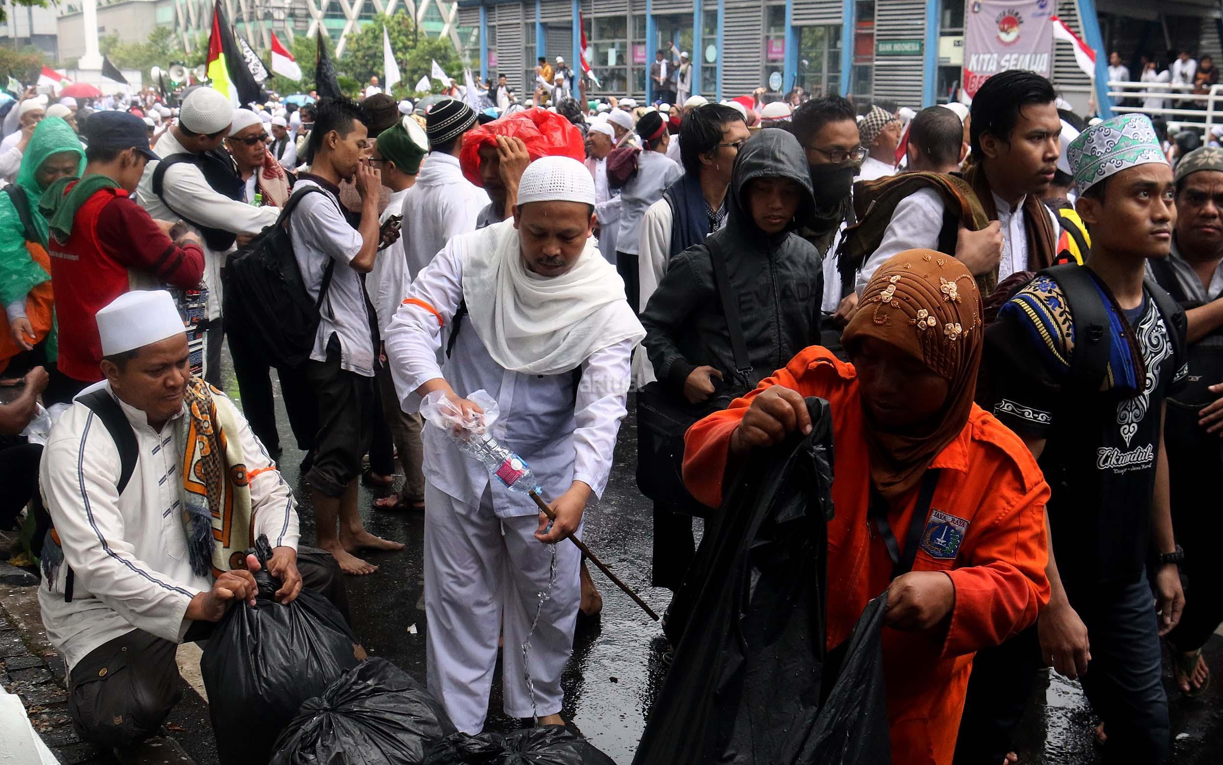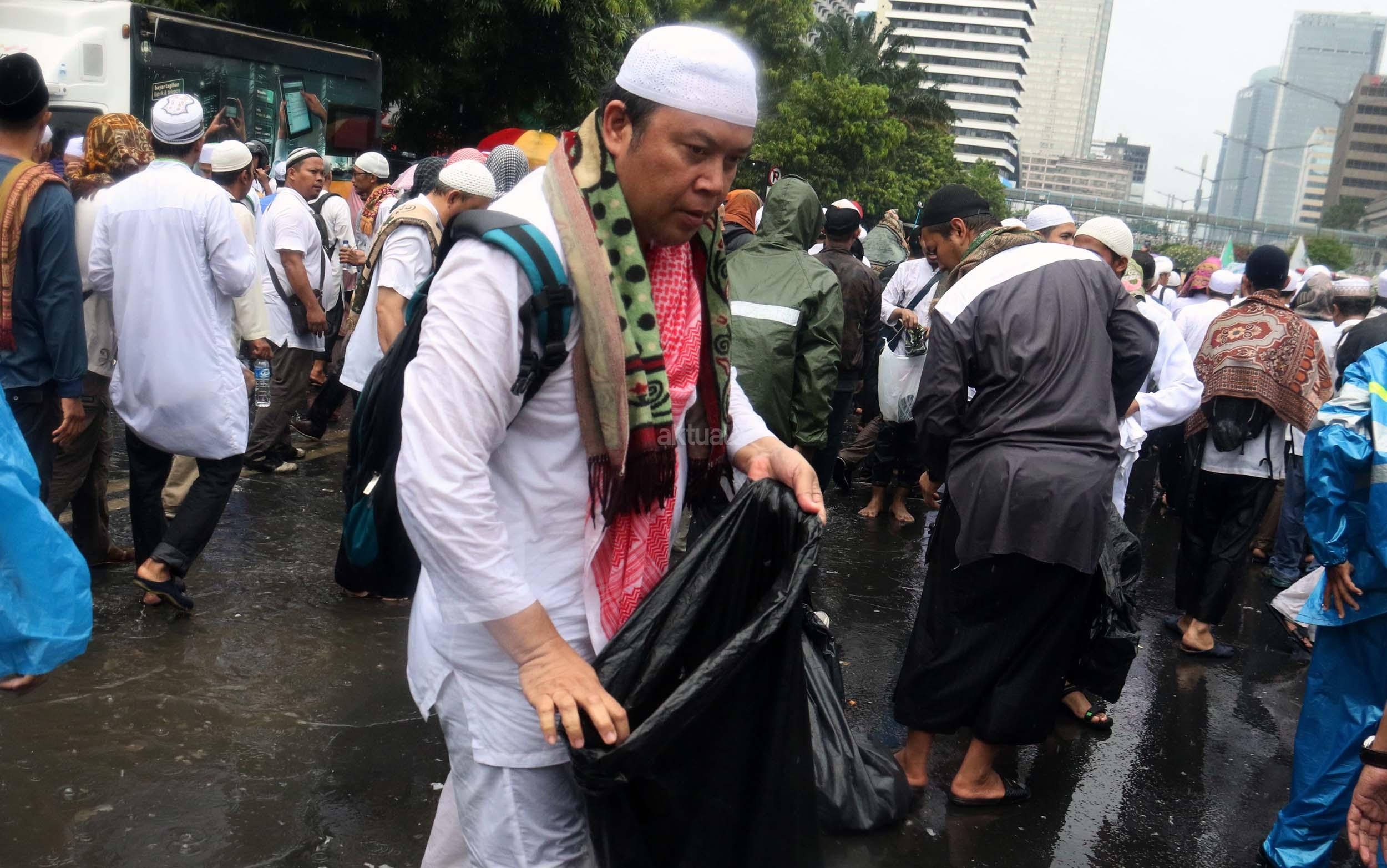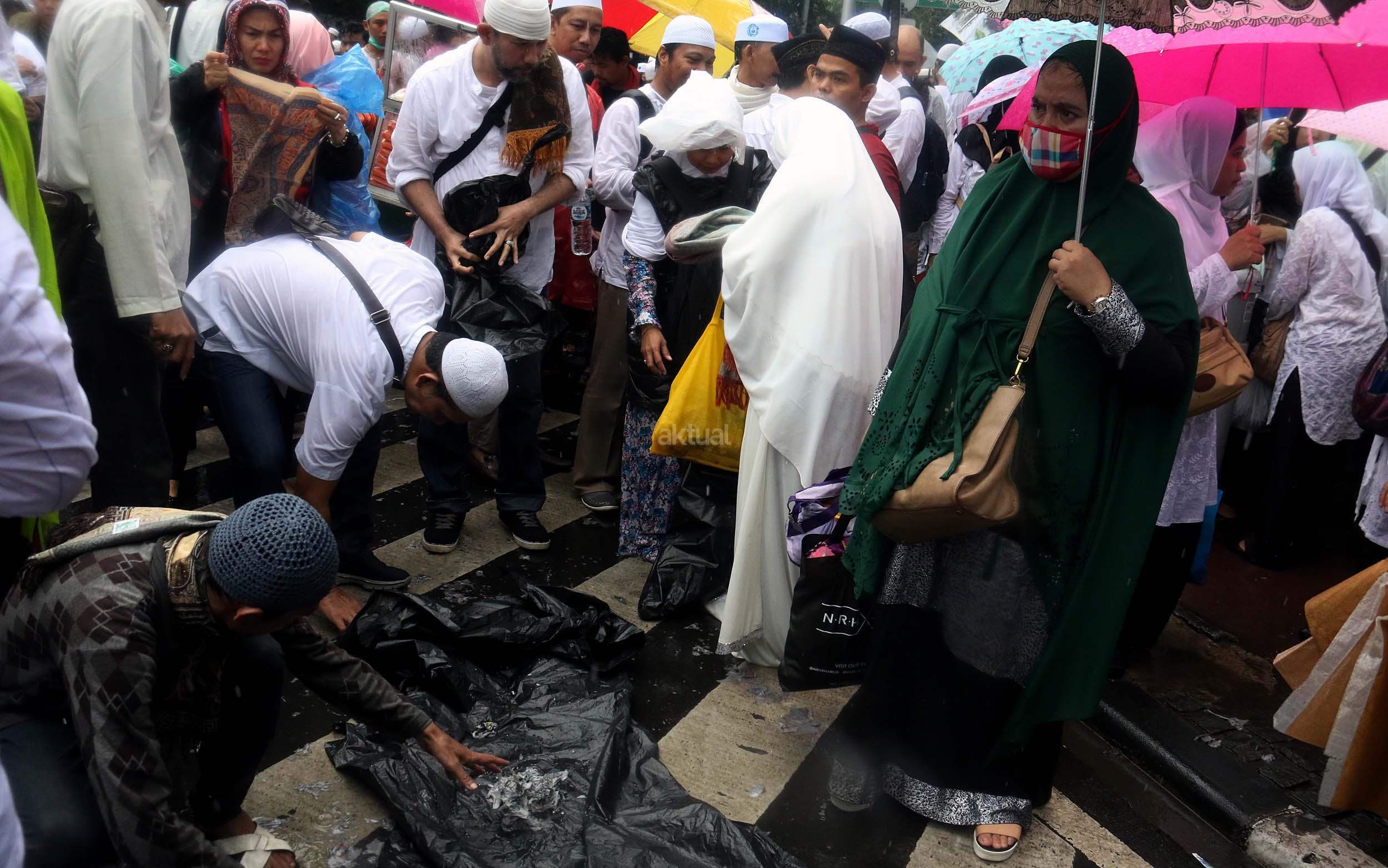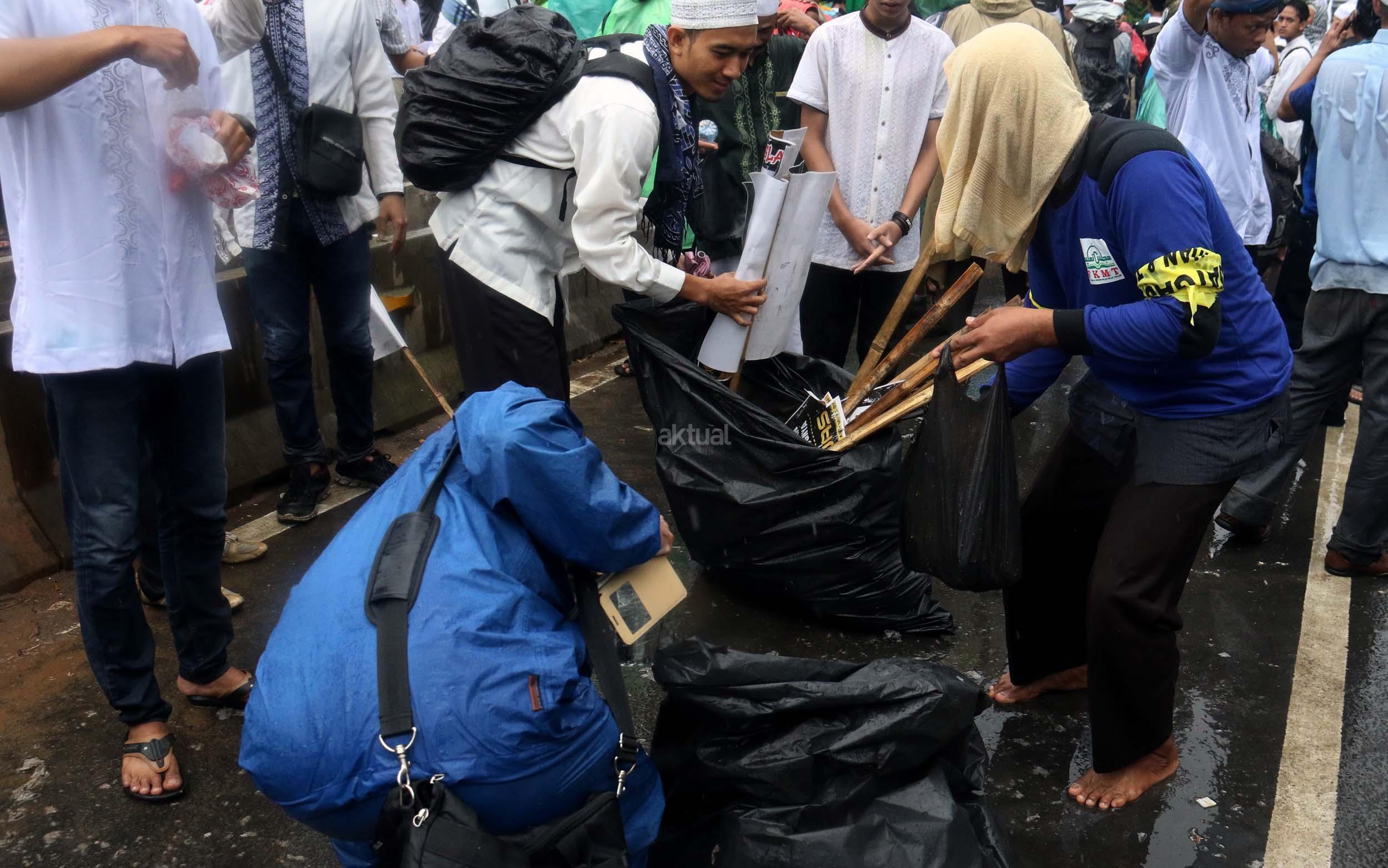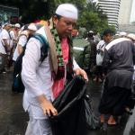Para peserta aksi mengumpulkan sampah usai melakukan shalat Jumat berjama'ah di Jalan MH Thamrin, Jakarta, Jumat (2/12/2016).Jutaan pendemo berbondong-bondong berjalan menuju lapangan silang Monas untuk melakukan doa dan salat Jumat bersama dengan mengusung tema "Tangkap Ahok Si Penista Al Quran. AKTUAL/Munzir