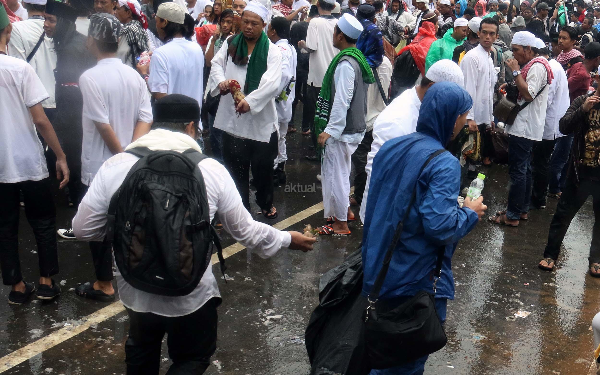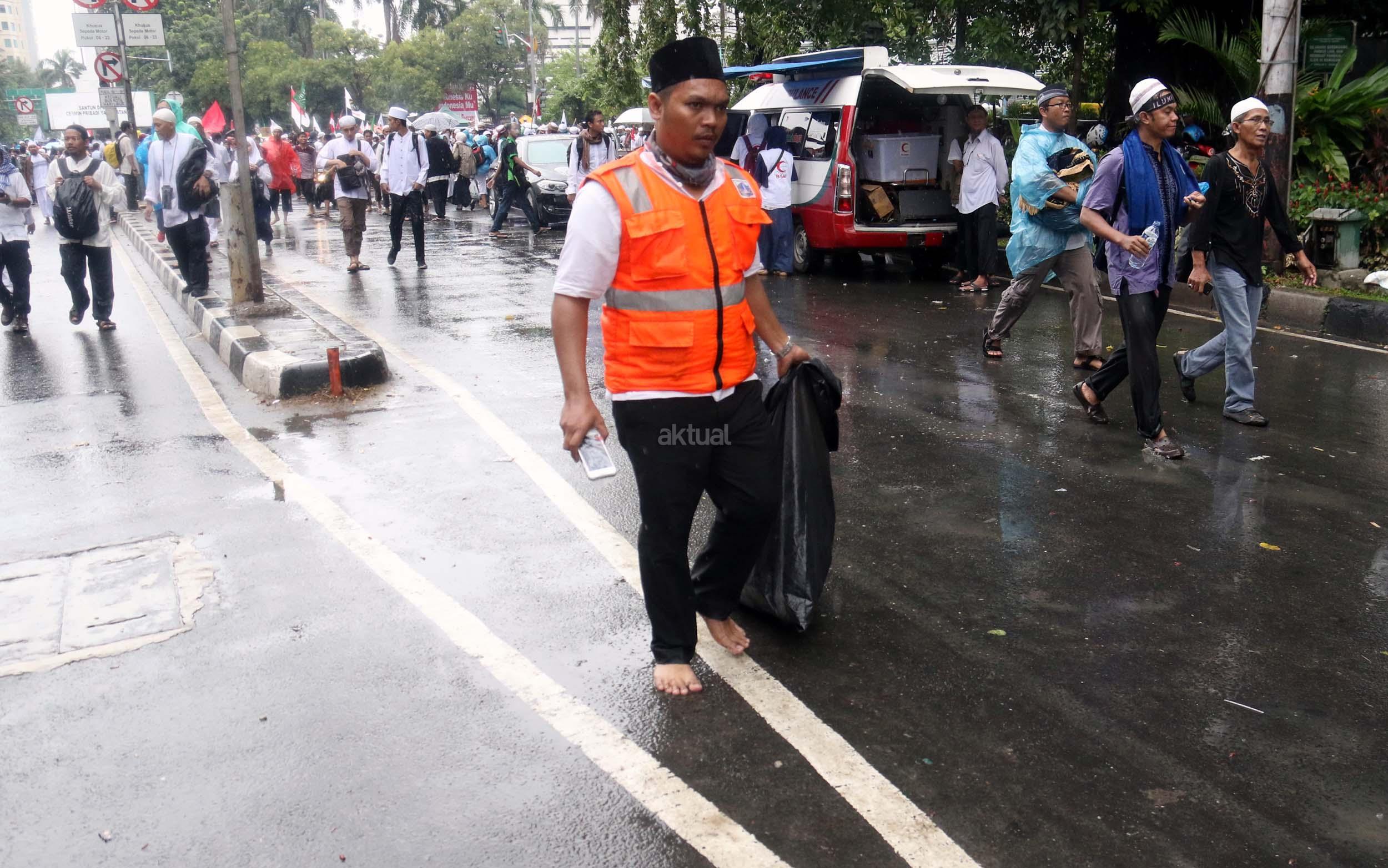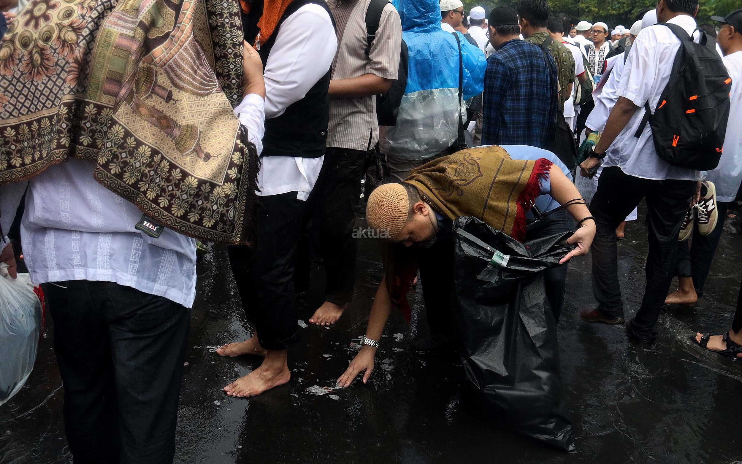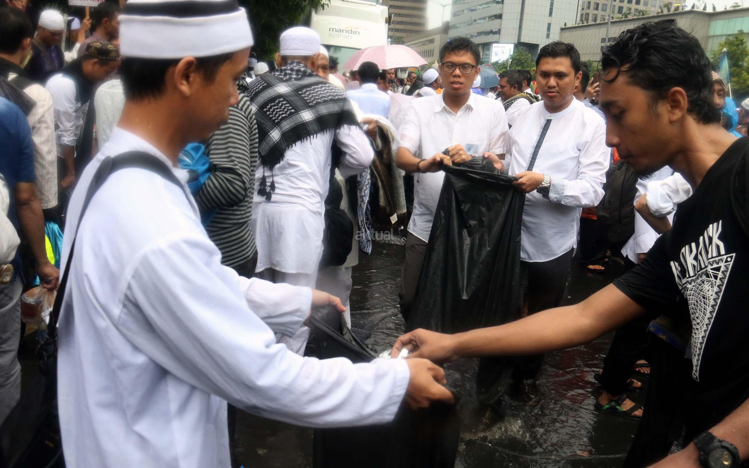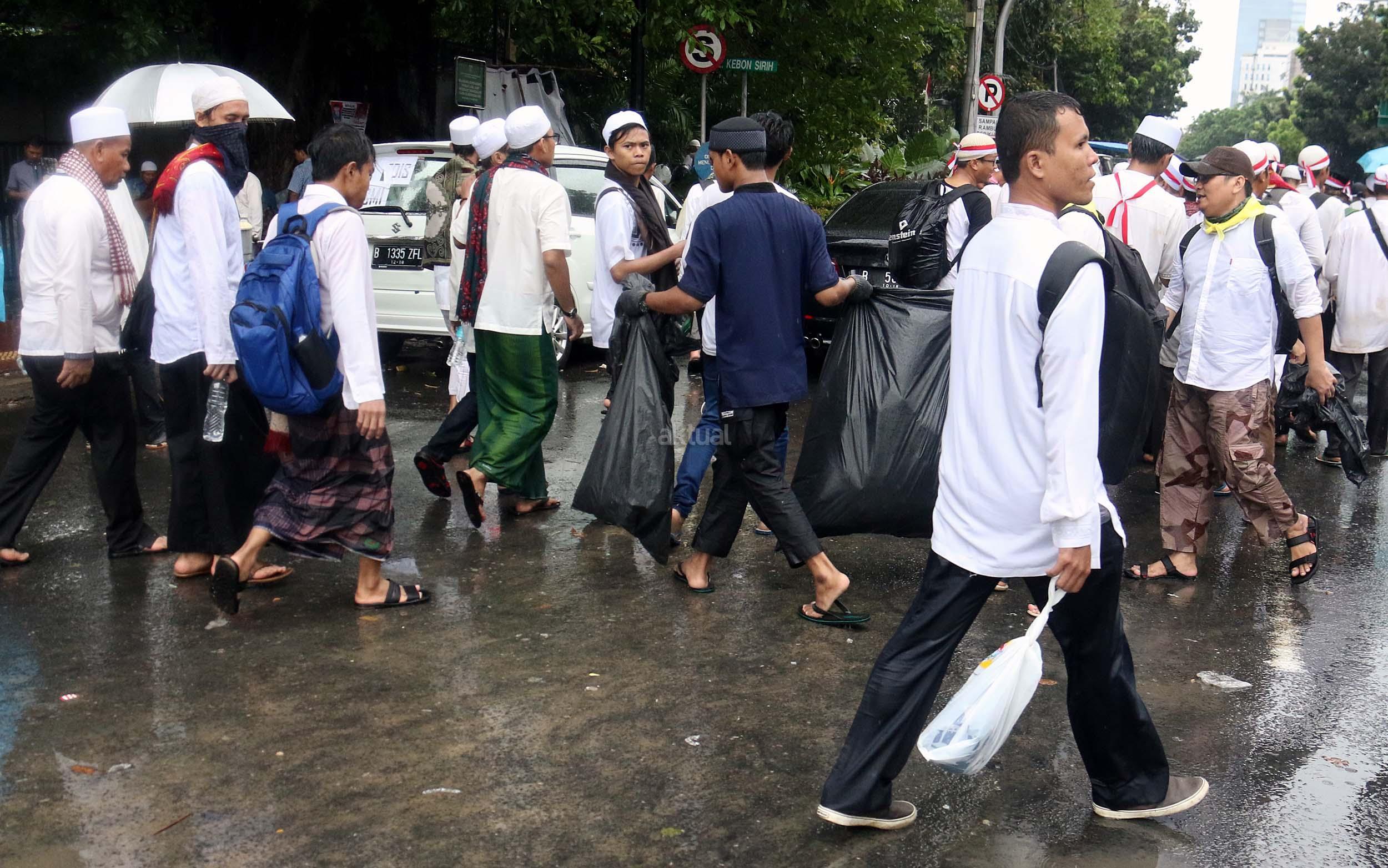 Para peserta aksi mengumpulkan sampah usai melakukan shalat Jumat berjama'ah di Jalan MH Thamrin, Jakarta, Jumat (2/12/2016).Jutaan pendemo berbondong-bondong berjalan menuju lapangan silang Monas untuk melakukan doa dan salat Jumat bersama dengan mengusung tema "Tangkap Ahok Si Penista Al Quran. AKTUAL/Munzir