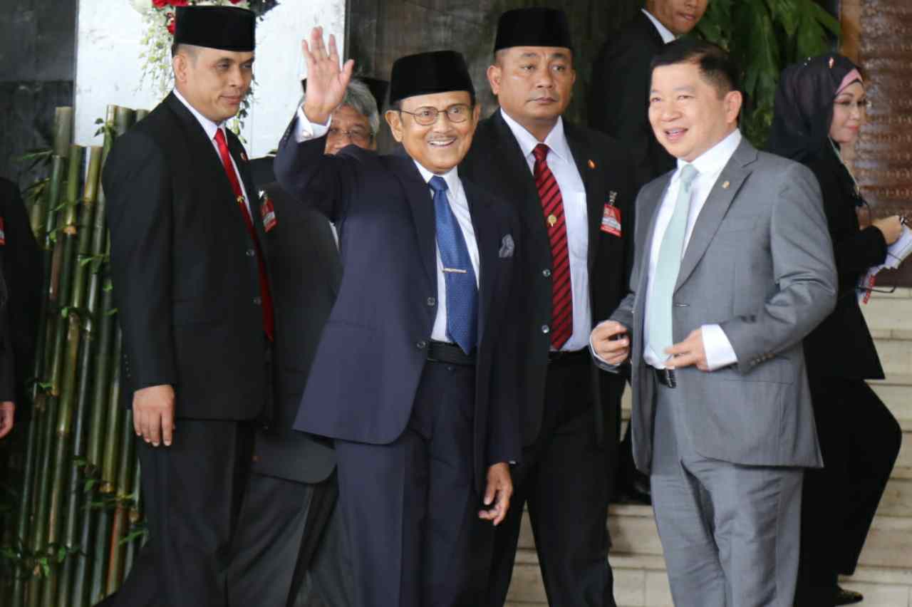 Presiden ke 3 BJ Habibie keluar dari ruangan sidang usai menghadiri sidang Tahunan MPR, DPR dan DPD di gedung Perlemen, Jakarta, Selasa (16/8).