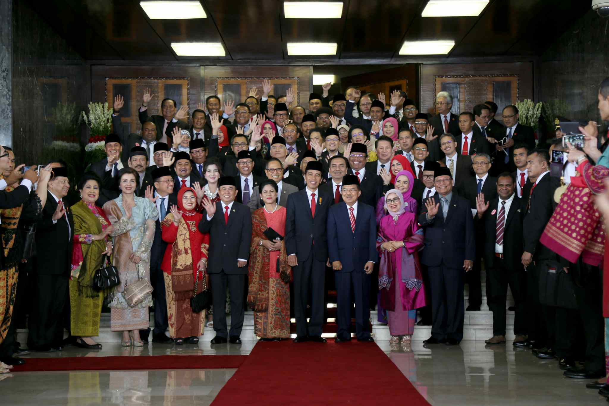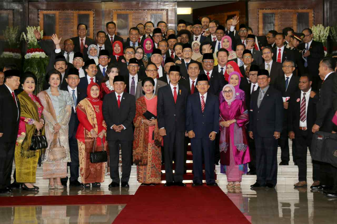 Presiden Joko Widodo dan Wapres Jusuf Kalla didampingi Istri berfoto bersama dengan pimpinan MPR, DPR dan DPD usai sidang Tahunan MPR, DPR dan DPD di gedung Perlemen, Jakarta, Selasa (16/8). Rangkaian sidang tahunan ini digelar oleh MPR, DPR, dan DPD. Presiden Joko Widodo berpidato 3 kali di 3 sidang. Selain dihadiri oleh Presiden Jokowi dan Wapres Jusuf Kalla serta para menteri, Sidang Tahunan MPR juga dihadiri oleh mantan presiden dan wakil presiden. Tamu duta besar, ketua umum parpol, dan pejabat lainnya yang turut diundang. AKTUA/TINO OKTAVIANO