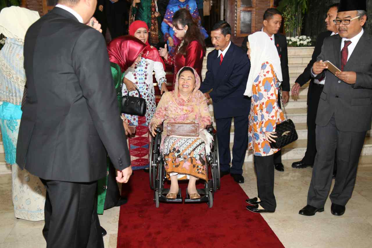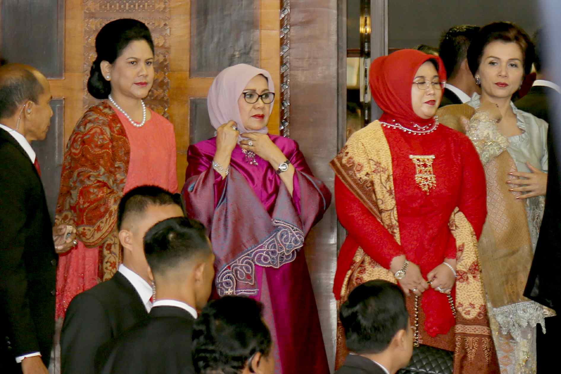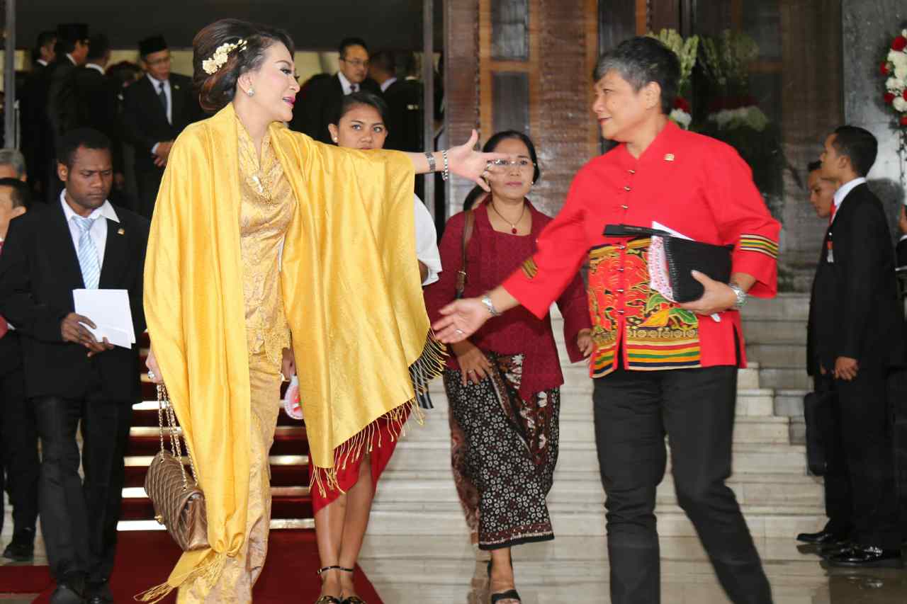 Istri Presiden Iriana dan Ibu Wapres Mufidah saat menunggu dipintu gedung Parlemen, Jakarta, Sabtu (16/8).