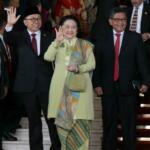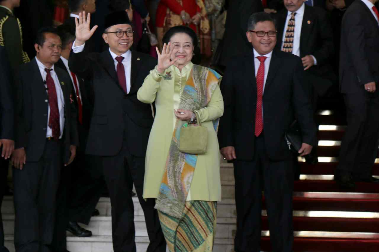 Presiden ke 4 Megawati Soekarnoputri keluar dari ruangan sidang usai menghadiri sidang Tahunan MPR, DPR dan DPD di gedung Perlemen, Jakarta, Selasa (16/8).