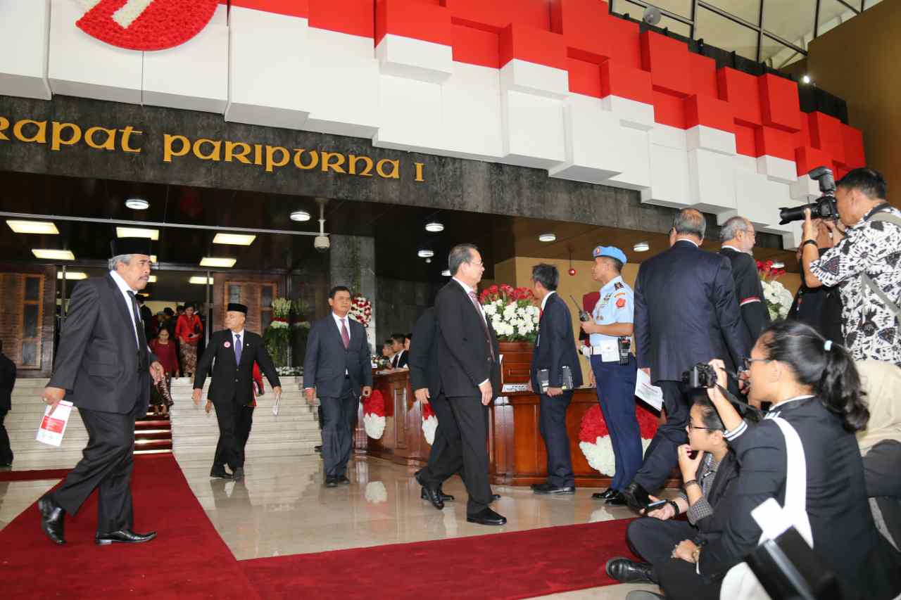 Sejum!ah anggota DPR keuar dari ruangan sidang usai menghadiri sidang Tahunan MPR, DPR dan DPD di gedung Perlemen, Jakarta, Selasa (16/8).