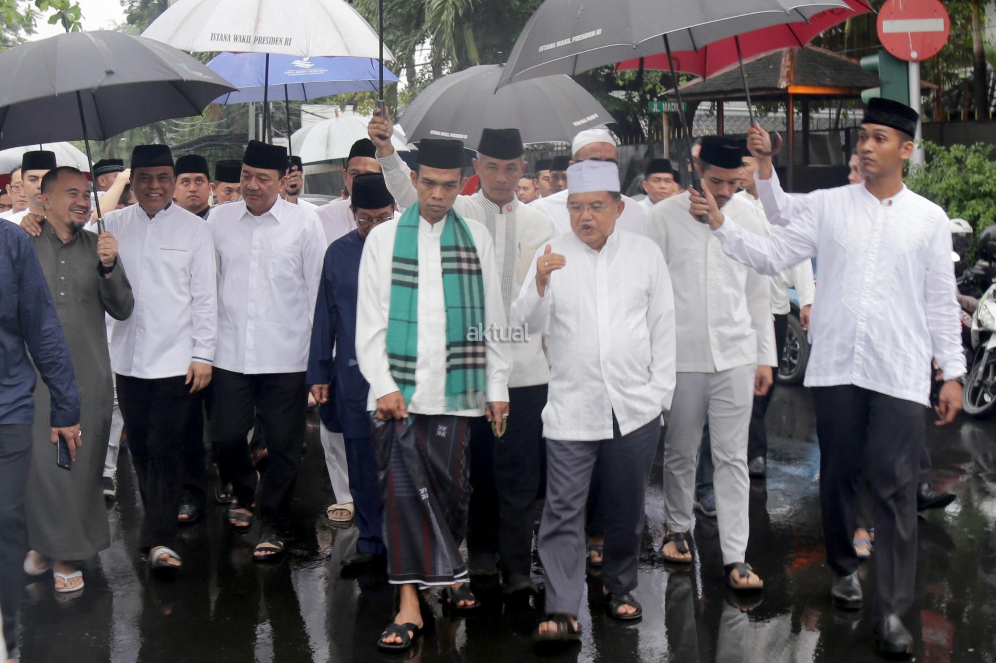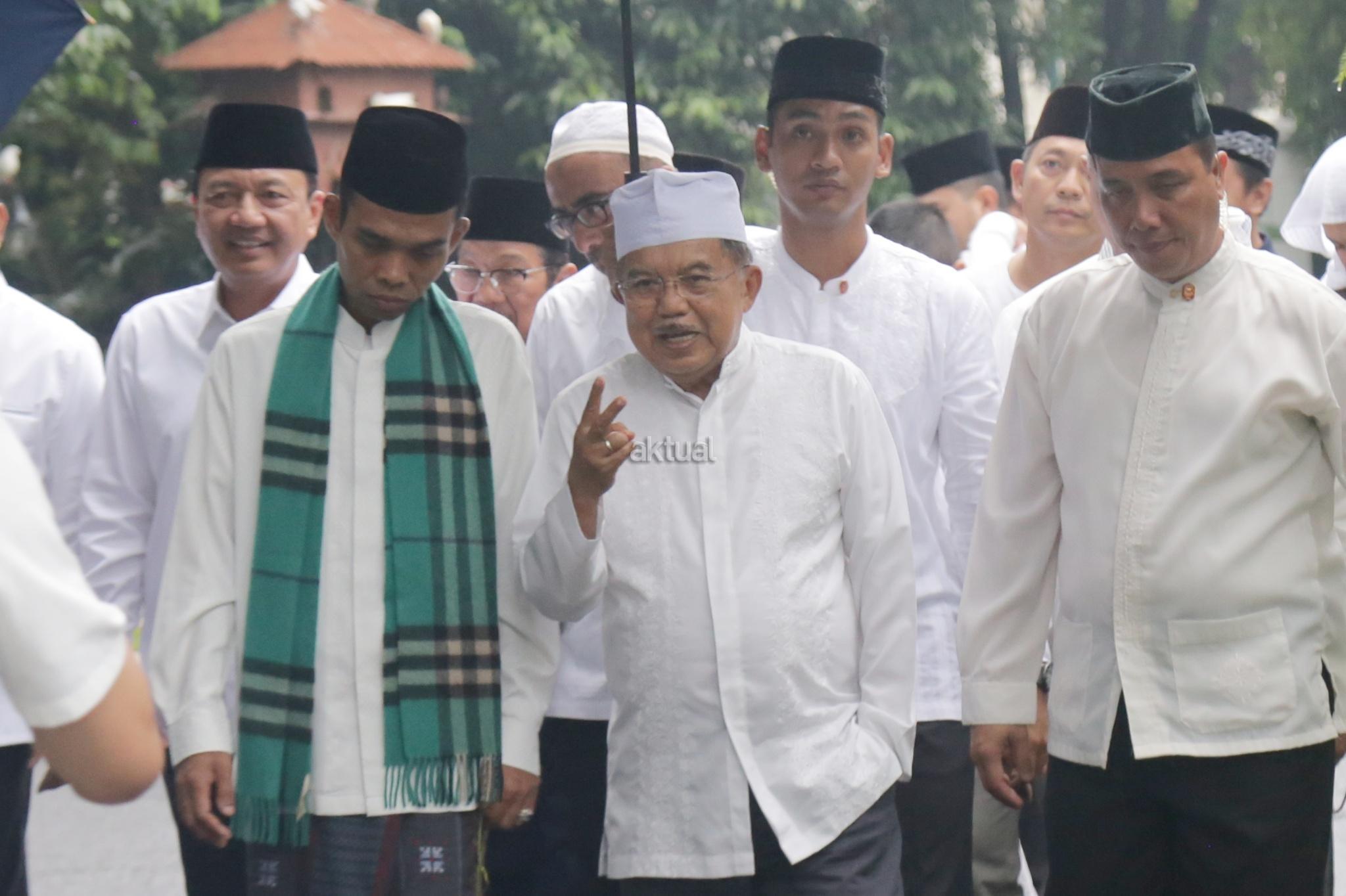 Wakil Presiden Jusuf Kalla (JK) bersama Ustaz Abdul Somad, Wakil Ketua Majelis Pakar Dewan Masjid Indonesia (DMI) Budi Gunawan, Pengurus DMI Wakapolri Komjen Pol M Syafruddin dan Aksa Mahmud berjalan menuju Masjid Sunda Kelapa, Jakarta, Minggu (4/2/2018). Kehadiran Ustad Somad menjadi ditunggu tunggu jamaah di Jakarta setelah sebelumnya jadwal ceramah di PLN Disjaya yang dihadiri 2000-an jamaah batal digelar. Walaupun jadwal ustaz Somad di Jakarta hari ini bukan kali pertama, tapi tampak antusias jamaah sangat terlihat. AKTUAL/Tino Oktaviano