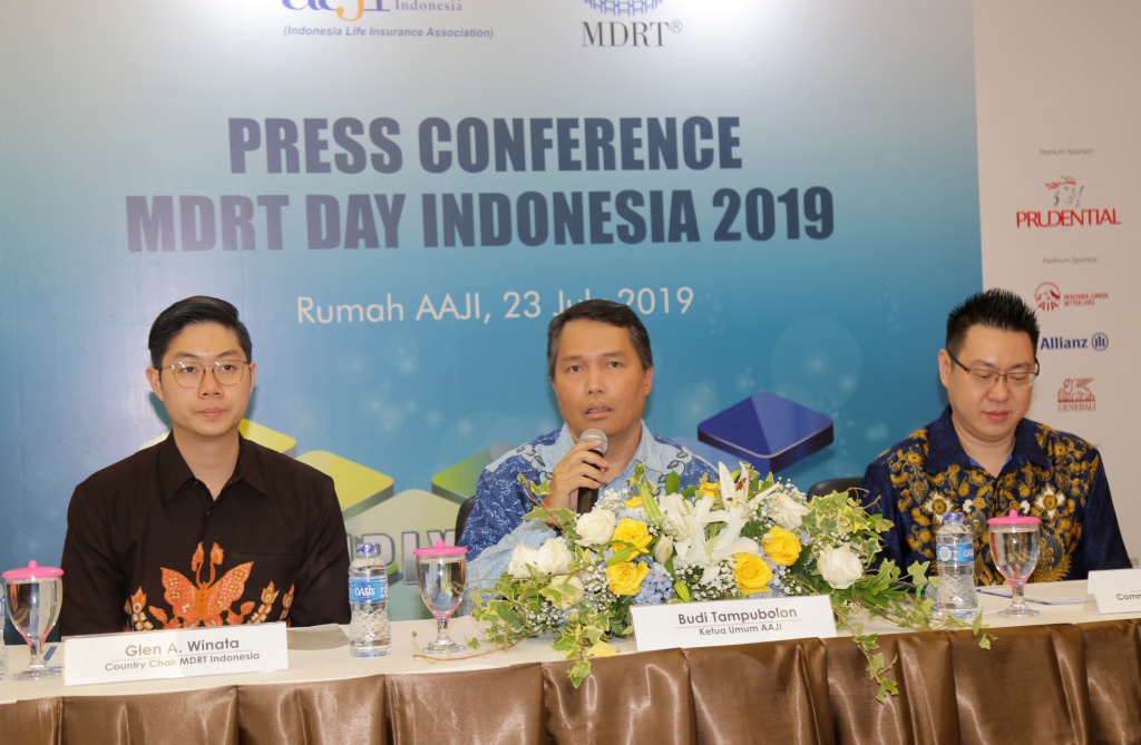 Ketua Asosiasi Asuransi Jiwa Indonesia (AAJI) Budi Tampubolon (tengah) bersama Country Chair Million Dollar Round Table (MDRT) Glen Alexander Winata (kiri) dan Committee Chair of MDRT Day Indonesia 2019 Dedy Setio (kanan) saat konfrerensi pers di Jakarta, Selasa (23/7/2019). AKTUAL/Tino Oktaviano