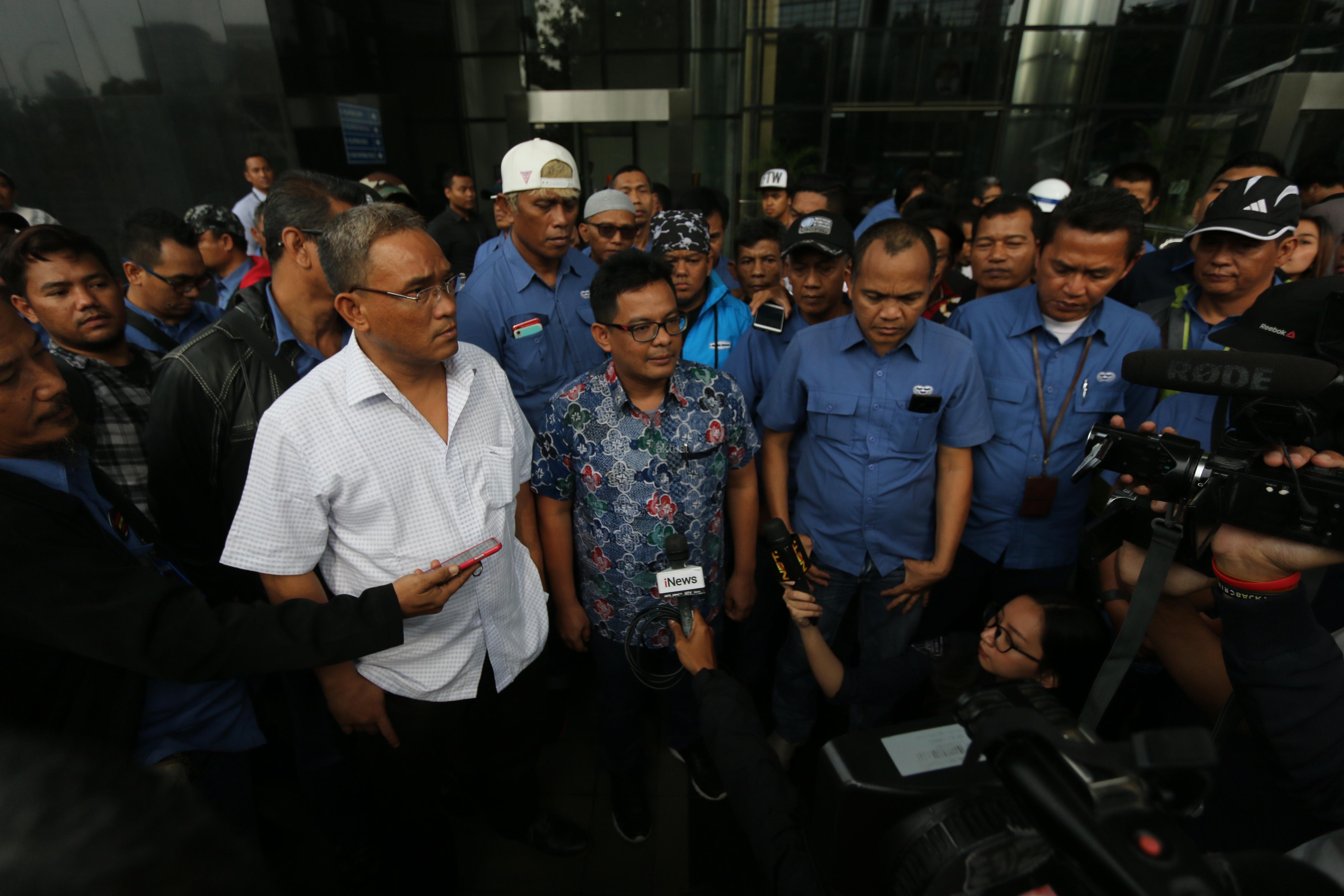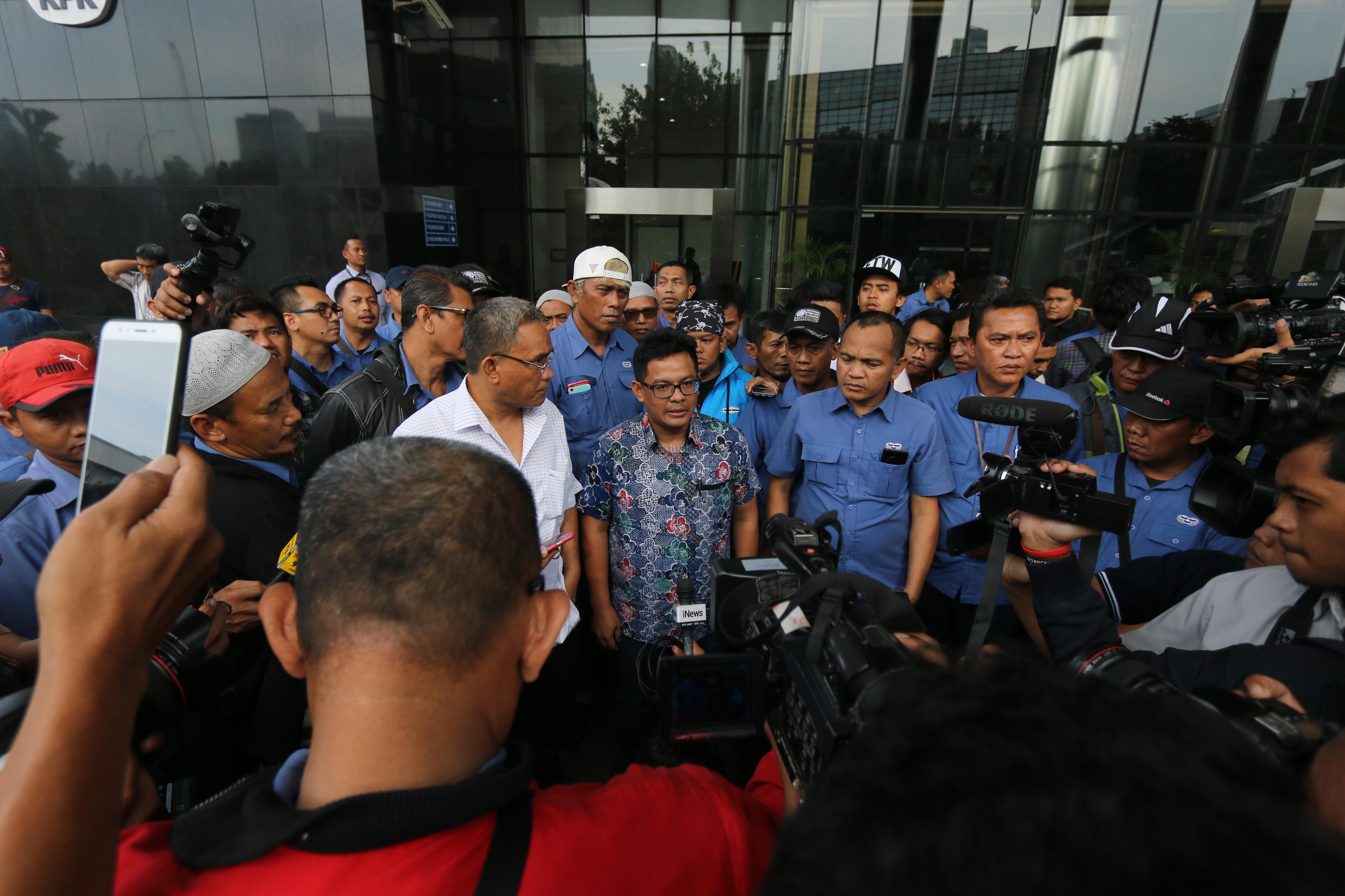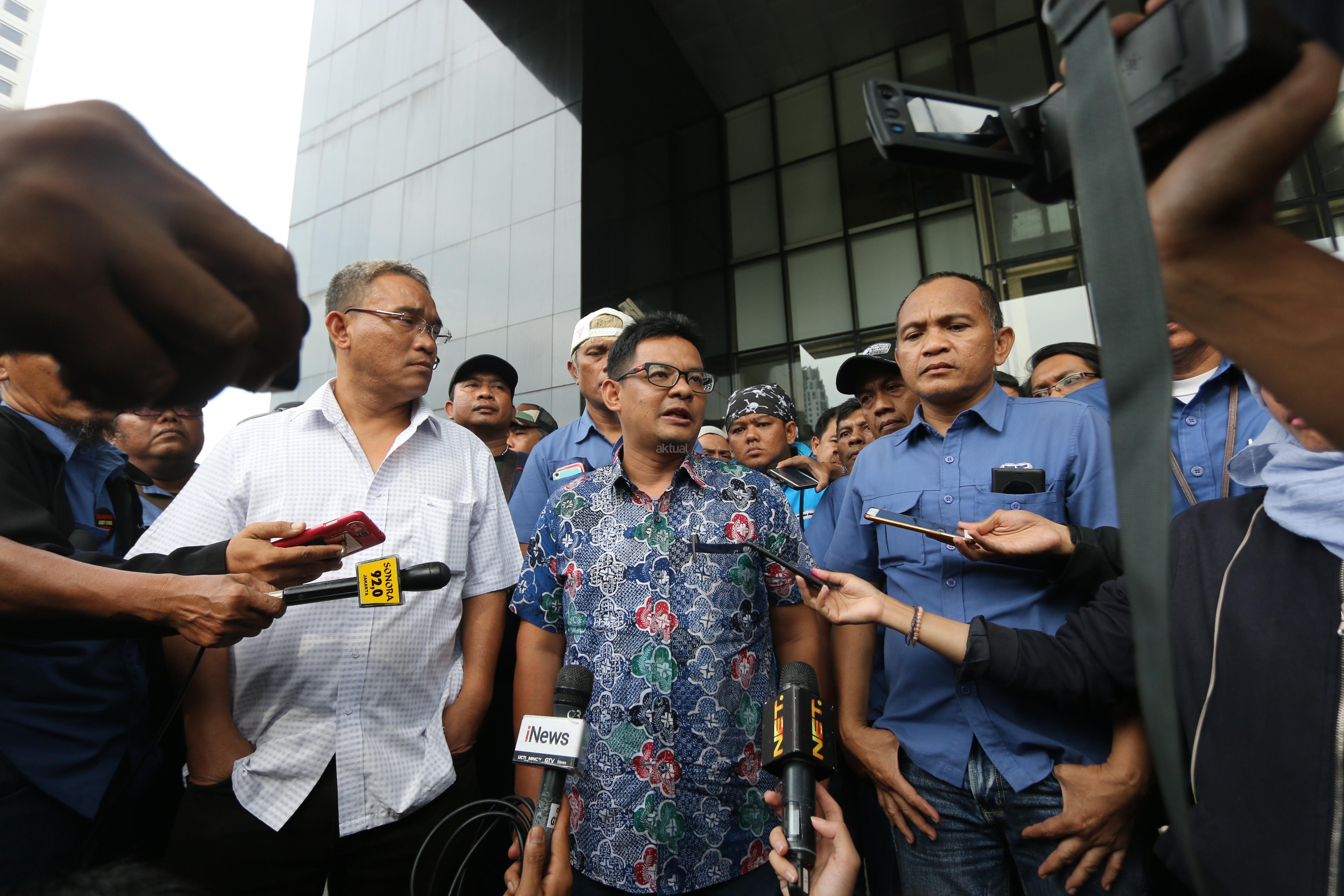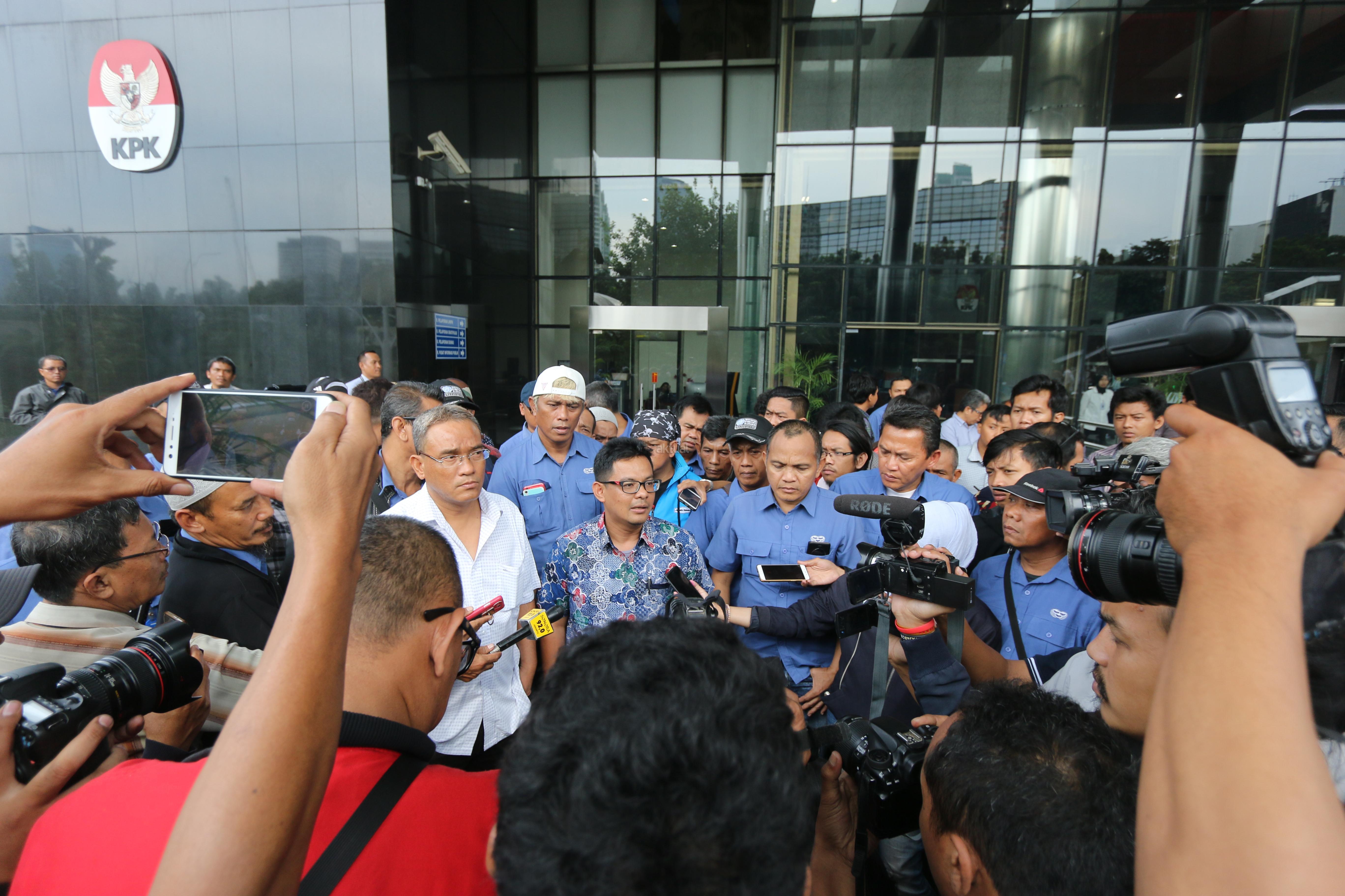 Ketua Serikat Pekerja JICT Hazris Malsyah (kiri) didampingi Sekretaris Jenderal Firmansyah (tengah) beserta anggota Serikat pekerja Jakarta International Container Terminal lainnya memberikan keterangan kepada wartawan usai menyambangi Komisi Pemberantasan Korupsi (KPK) di Jakarta, Kamis (22/2). Kedatangan mereka untuk mempertanyakan perkembangan kasus dugaan tindak pidana korupsi perpanjangan kontrak terminal pelabuhan Jakarta International Container Terminal (JICT) dan terminal peti kemas koja Tanjung Priok. AKTUAL/Tino Oktaviano