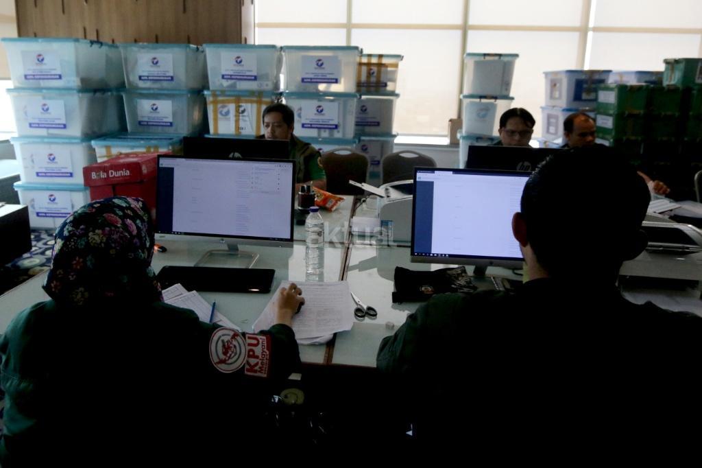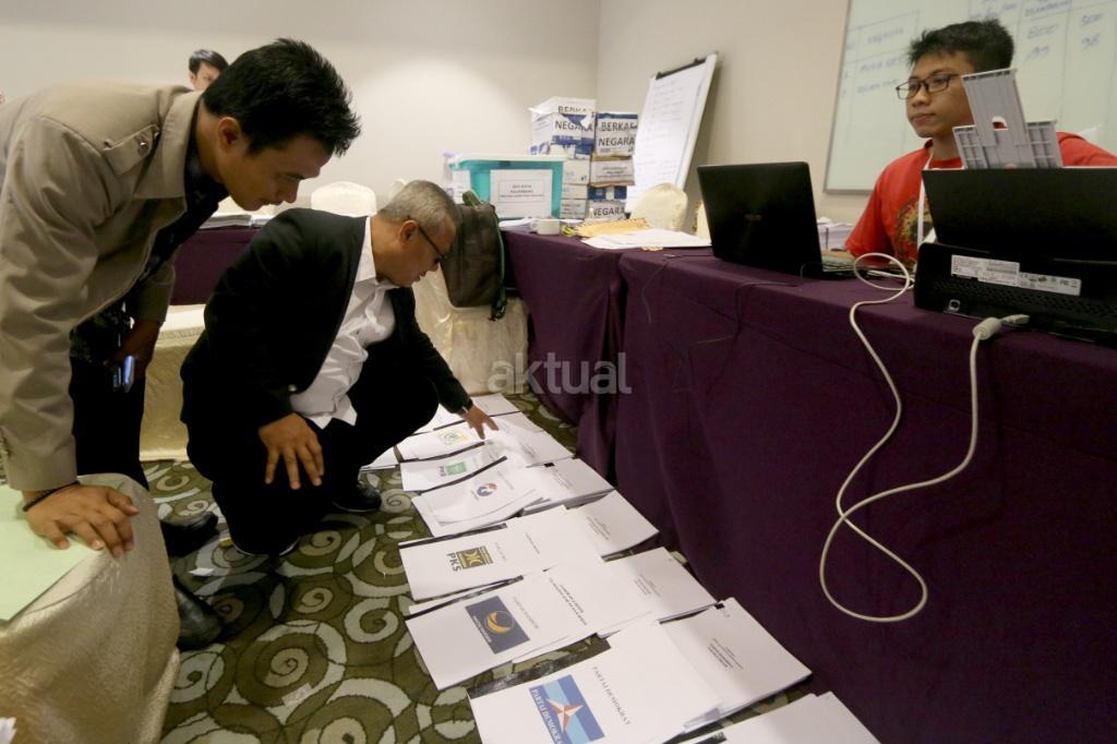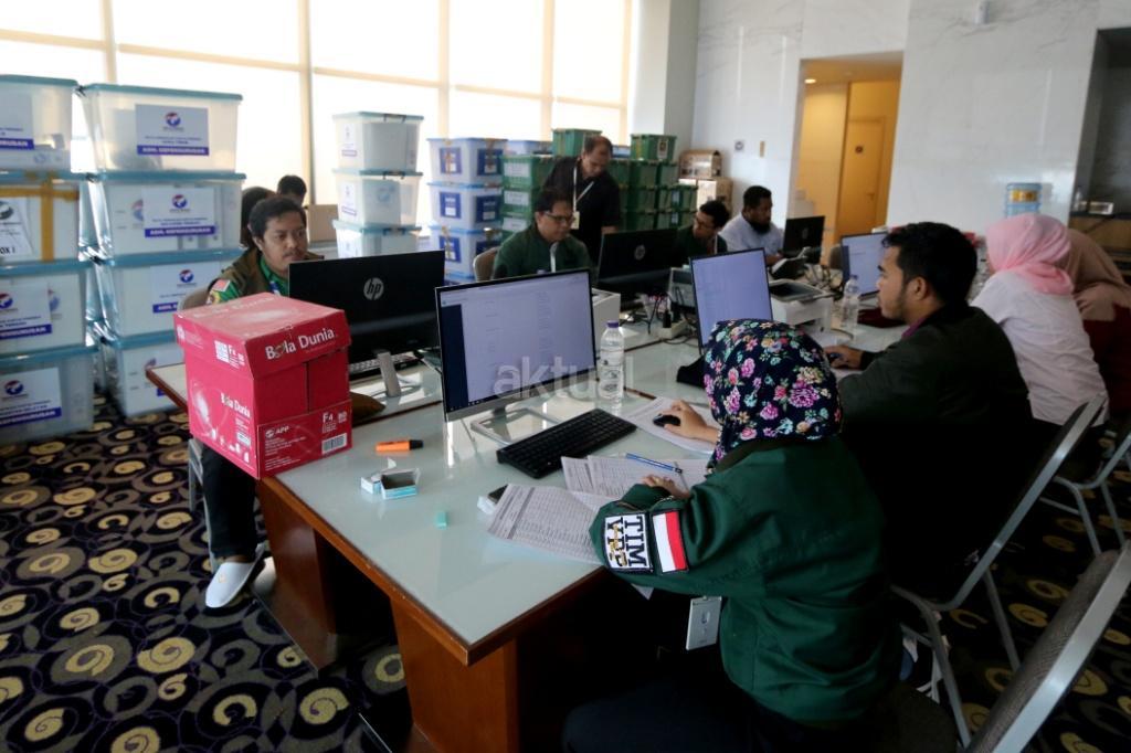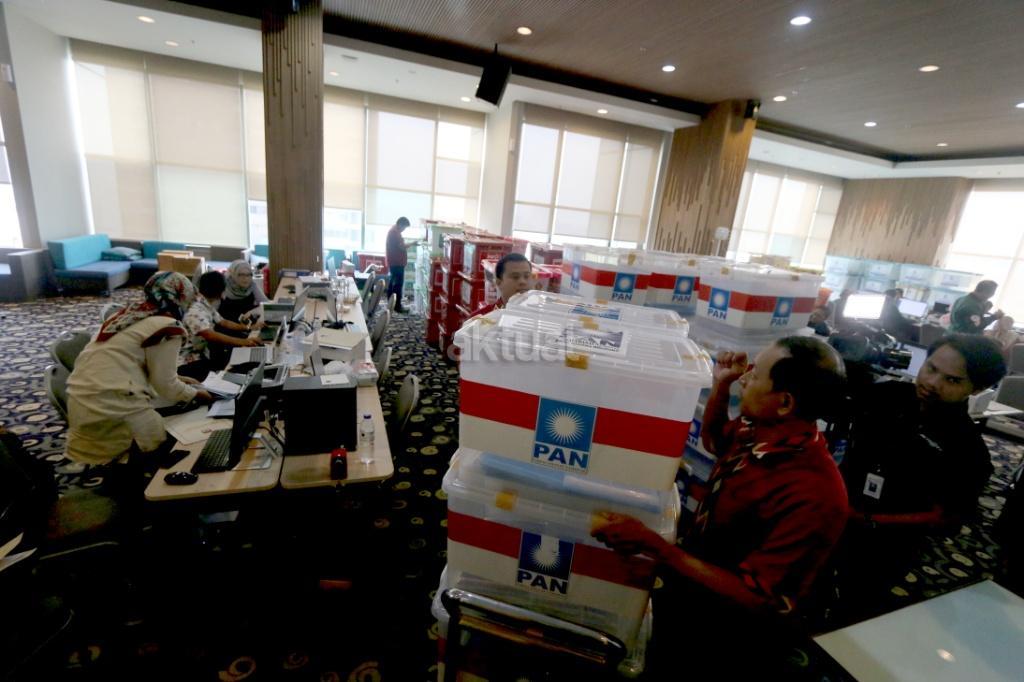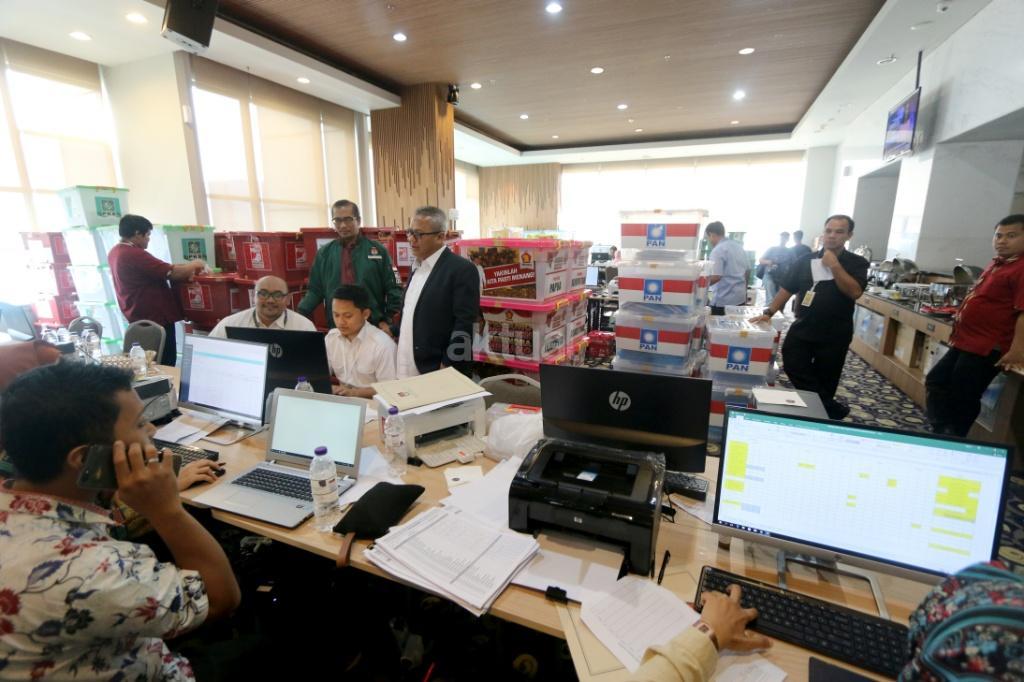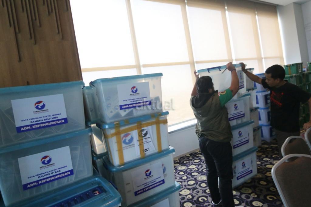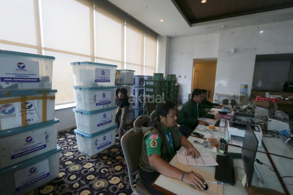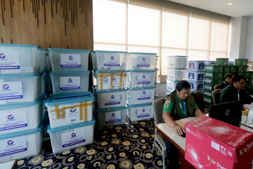 Petugas merapikan berkas-berkas untuk verifikasi administrasi kelengkapan pendaftaran partai peserta pemilu di Hotel Mercure, Harmoni, Jakarta, Kamis (16/11). KPU melakukan verifikasi dalam proses penelitian administrasi parpol peserta Pemilu 2019 untuk mendeteksi adanya kegandaan identitas anggota serta untuk memeriksa status anggota partai masing-masing. AKTUAL/Tino Oktaviano