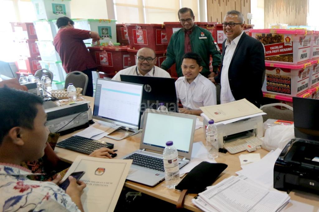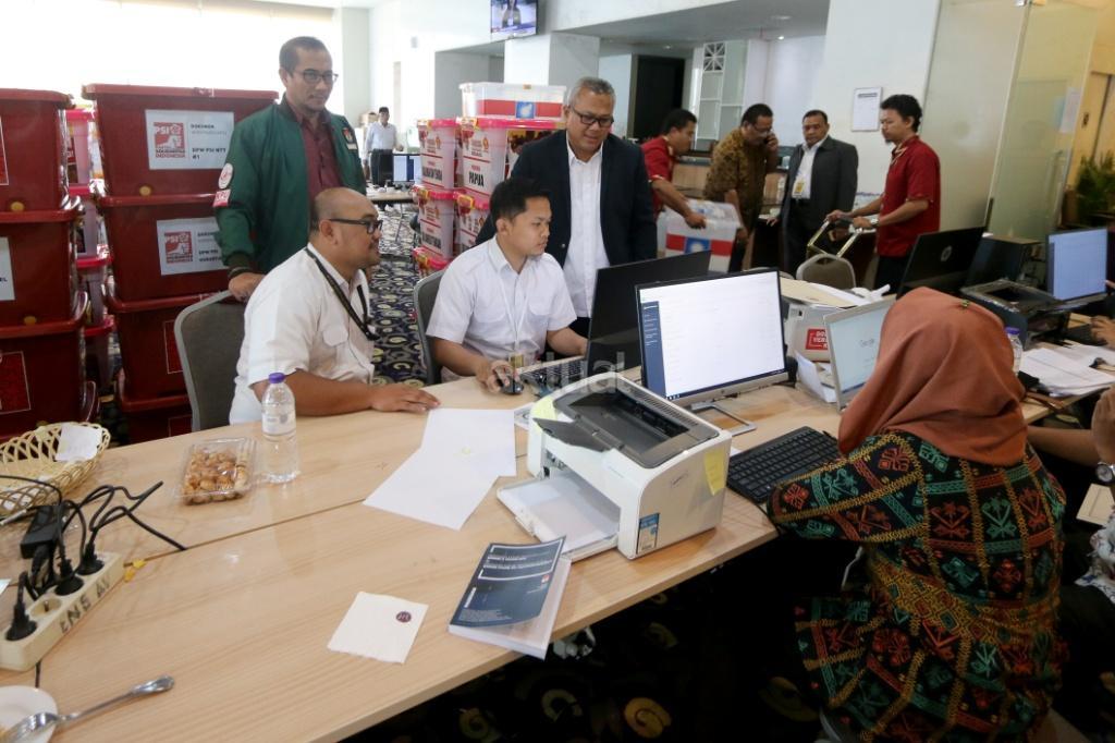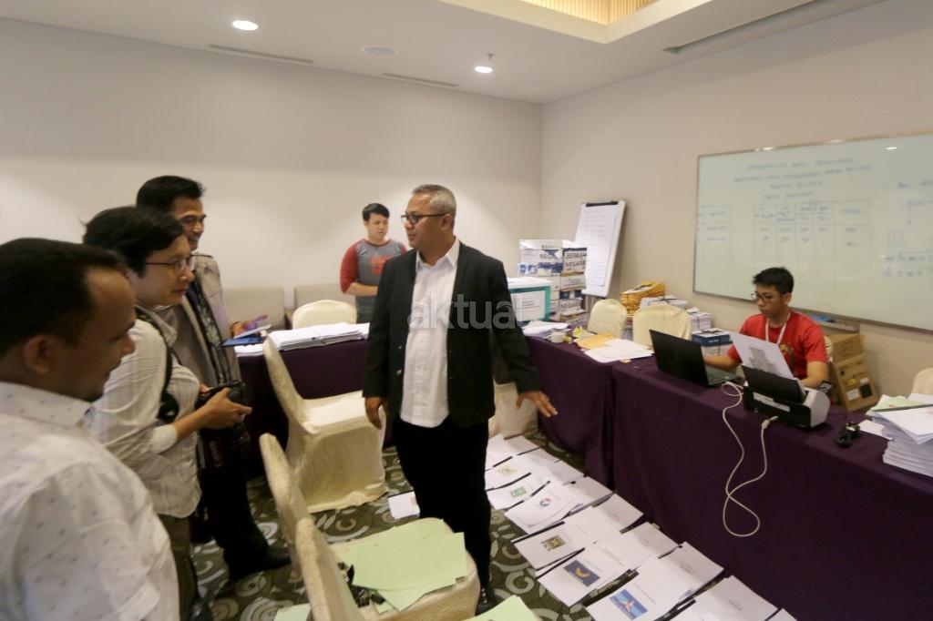 Ketua KPU Arief Budiman meninjau verifikasi administrasi kelengkapan pendaftaran partai peserta pemilu di Hotel Mercure, Harmoni, Jakarta, Kamis (16/11). KPU melakukan verifikasi dalam proses penelitian administrasi parpol peserta Pemilu 2019 untuk mendeteksi adanya kegandaan identitas anggota serta untuk memeriksa status anggota partai masing-masing. AKTUAL/Tino Oktaviano