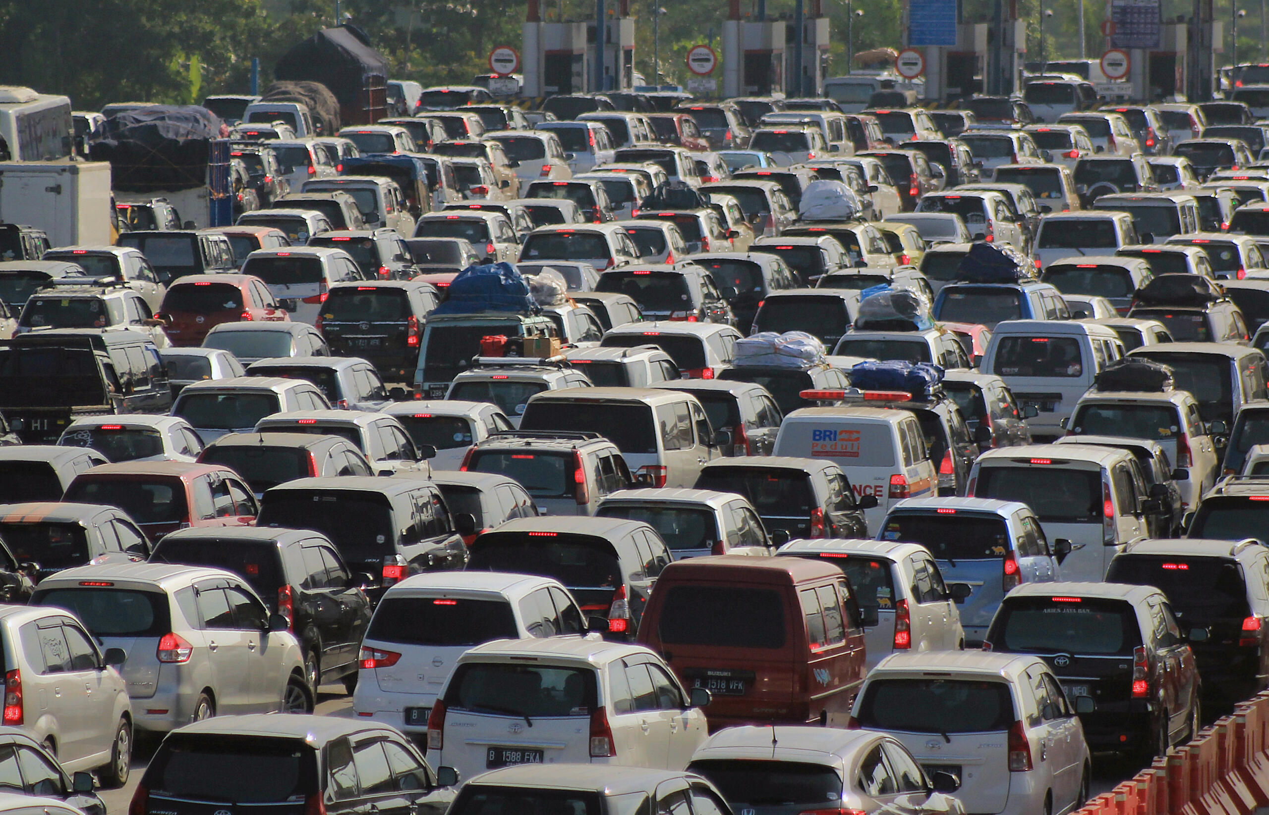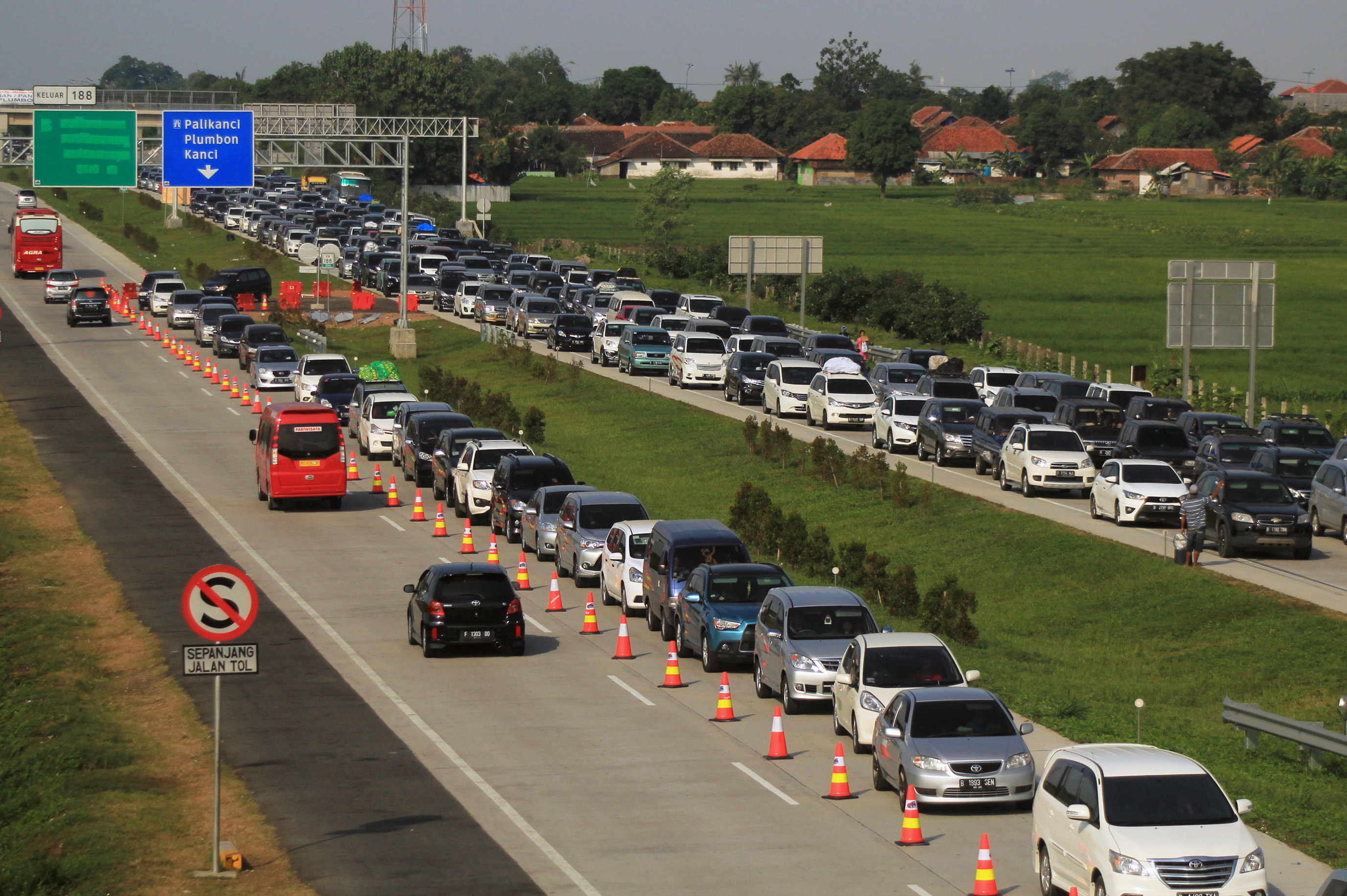 Kendaraan pemudik berjalan pelan di jalur Pantura, Tegal, Jawa Tengah, Minggu (10/7). Pada H+4 volume kendaraan arus balik dari Jawa Tengah menuju Jakarta meningkat drastis dibandingkan H+3, menyebabkan jalur Pantura padat merayap. Diperkirakan puncak arus balik pada Minggu (10/7) malam. ANTARA FOTO/Oky Lukmansyah/foc/16.
