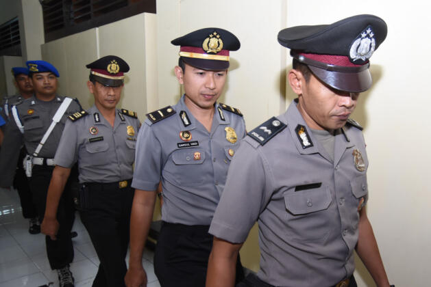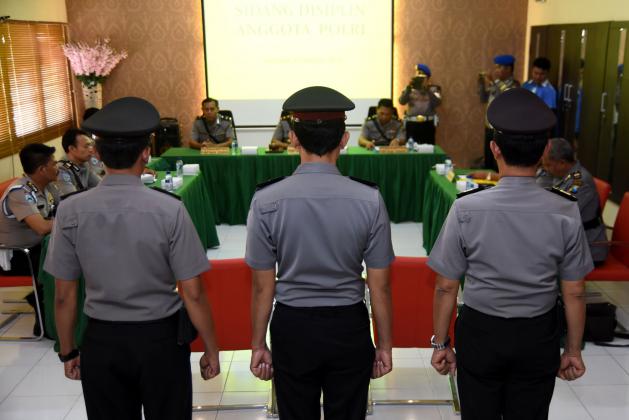 Tiga anggota Polres Lumajang terperiksa, Aipda Sigit Pramono (kanan), Aipda Sigit Pramono (kedua kanan) dan AKP Sudarminto (ketiga kanan) memasuki ruang sidang disiplin terbuka di Mapolda Jawa Timur, Surabaya, Senin (19/10). Sidang dengan agenda pembacaan vonis atas dugaan keterlibatan dalam tambang pasir ilegal di Lumajang tersebut, ketiga terperiksa divonis hukuman teguran tertulis, mutasi yang bersifat demosi, dan penempatan di tempat khusus selama 21 hari. ANTARA FOTO/M Risyal Hidayat/ama/15