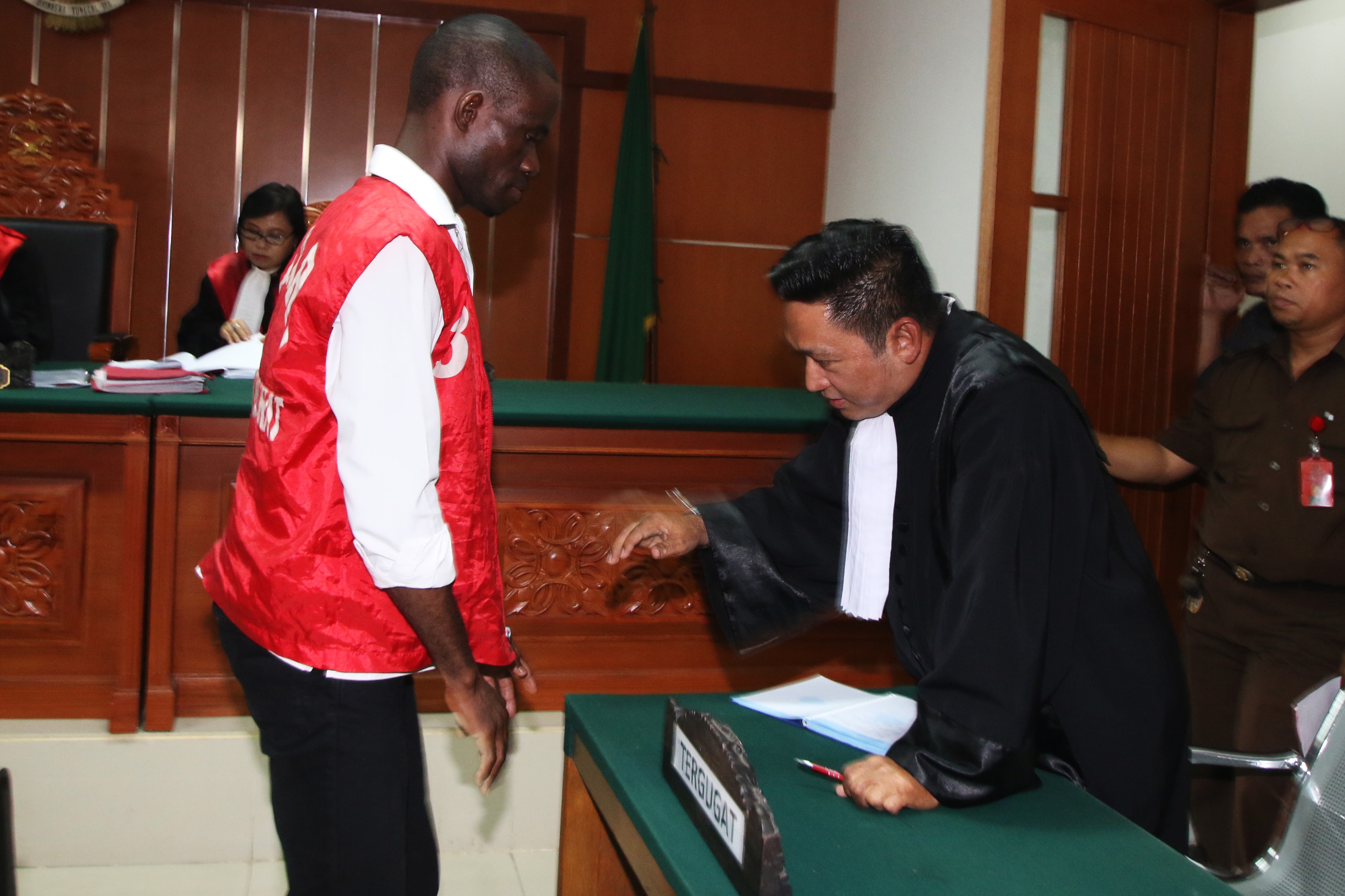 Terdakwa kasus narkotika sabu seberat 6,3 kg Arinze Petrus Eneh berdiskusi dengan penasehat hukum saat menjalani sidang vonis di PN Jakarta Barat, Jakarta, Rabu (18/5). Majelis Hakim Pengadilan Negeri Jakarta Barat menjatuhkan vonis 20 tahun penjara kepada Arinze Petrus yang sebelumnya dituntut hukuman mati oleh Jaksa Penuntut Umum. ANTARA FOTO/Rivan Awal Lingga/kye/16