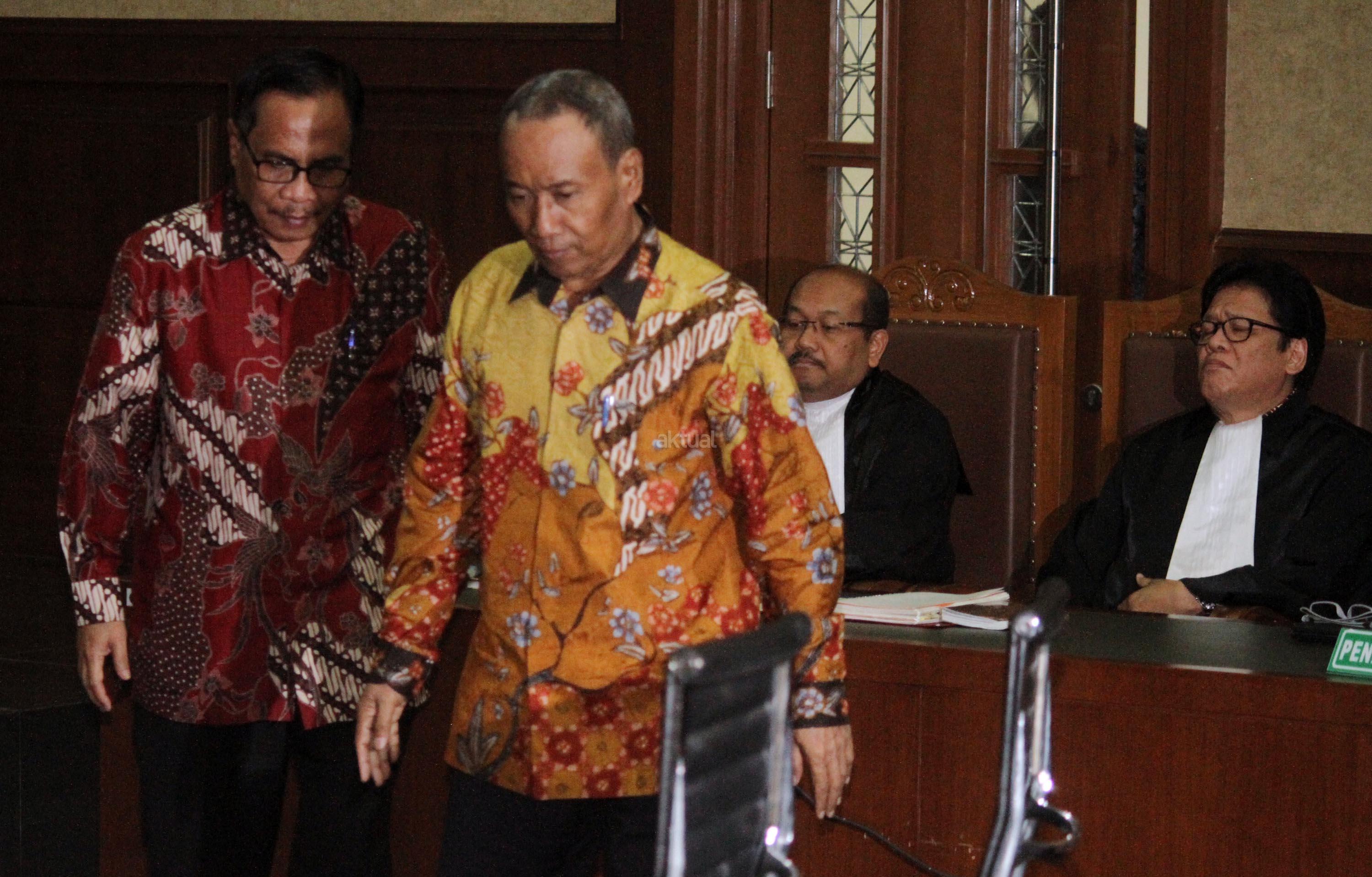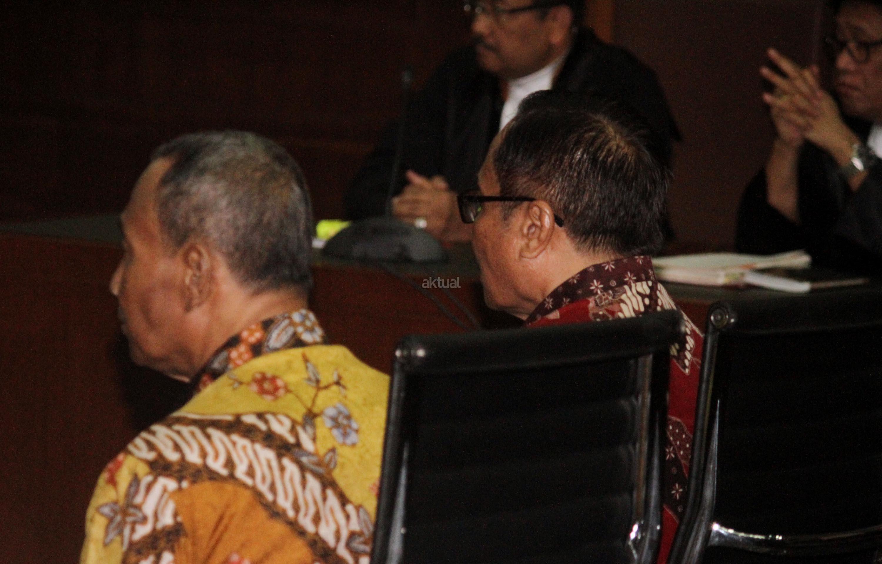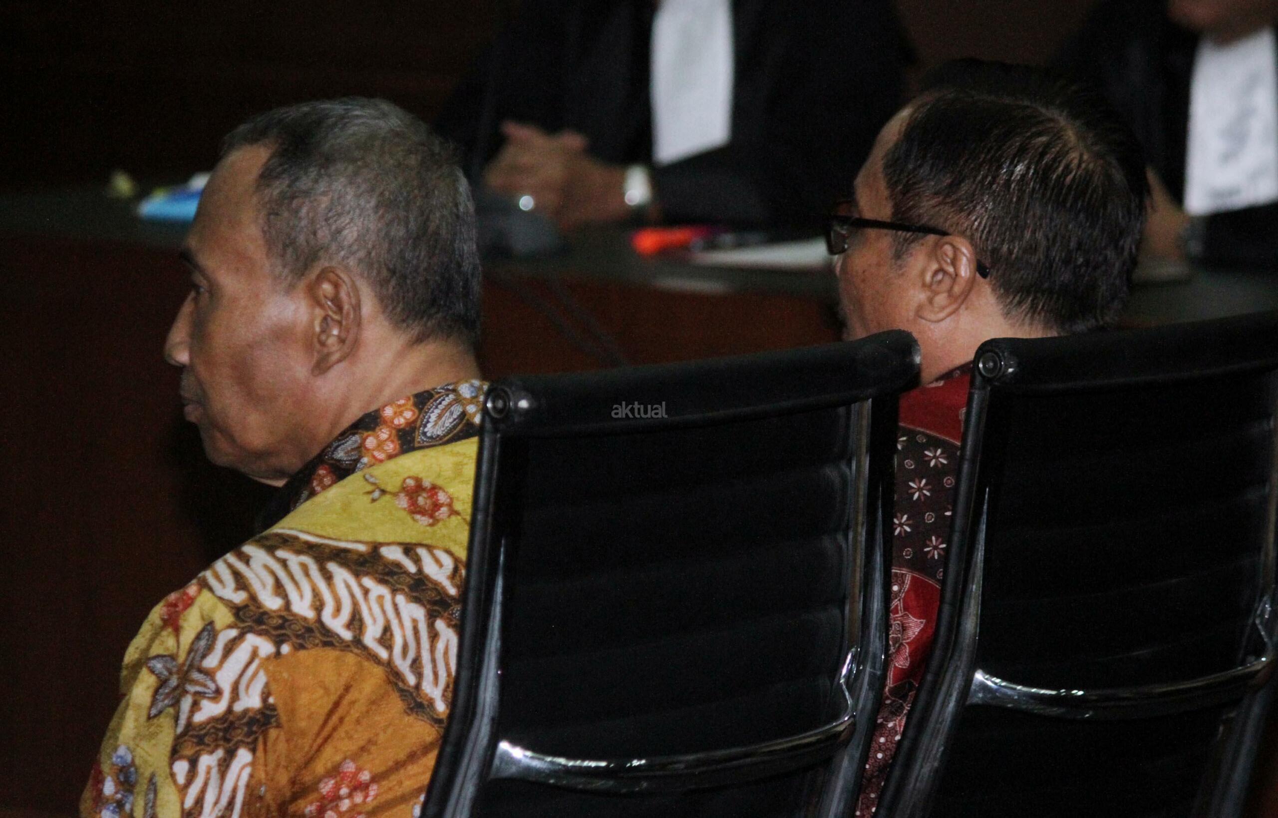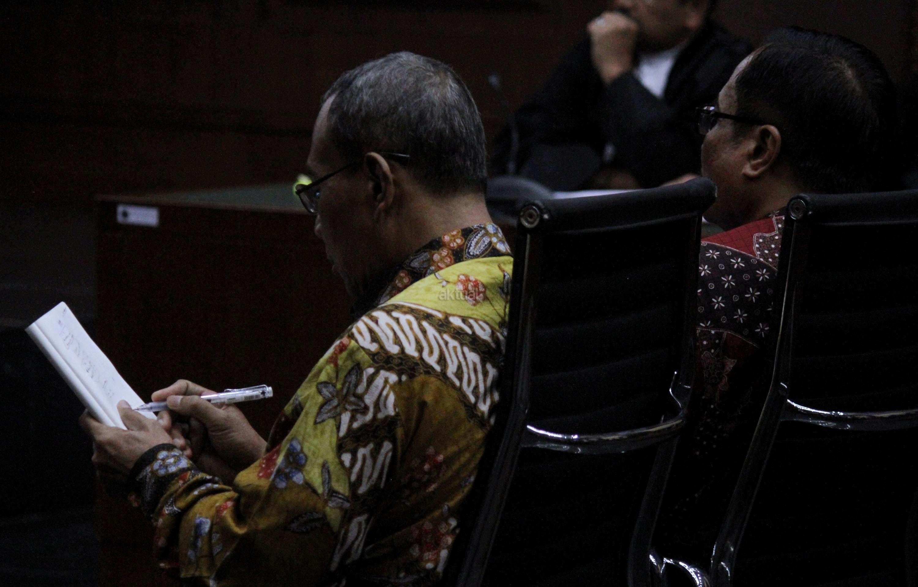 Terdakwa kasus pengadaan KTP Elektronik (KTP-el) Irman (kanan) dan Sugiharto (kiri) mendengarkan pembacaan putusan saat menjalani persidangan di Pengadilan Tipikor, Jakarta, Kamis (20/7/2017). Majelis hakim menjatuhkan vonis tujuh tahun penjara dan denda Rp500 juta subsider enam bulan kurungan untuk Irman, sedangkan Sugiharto dijatuhi hukuman lima tahun penjara dan denda Rp400 juta subsider enam bulan kurungan karena keduanya terbukti menyalahgunakan kewenangan dalam proyek KTP-elektronik. AKTUAL/Munzir