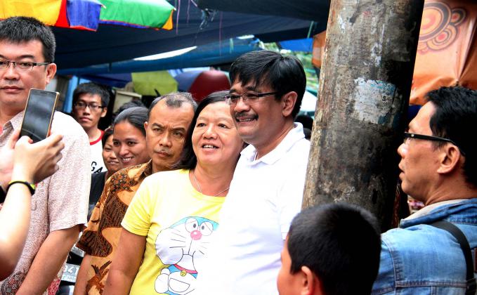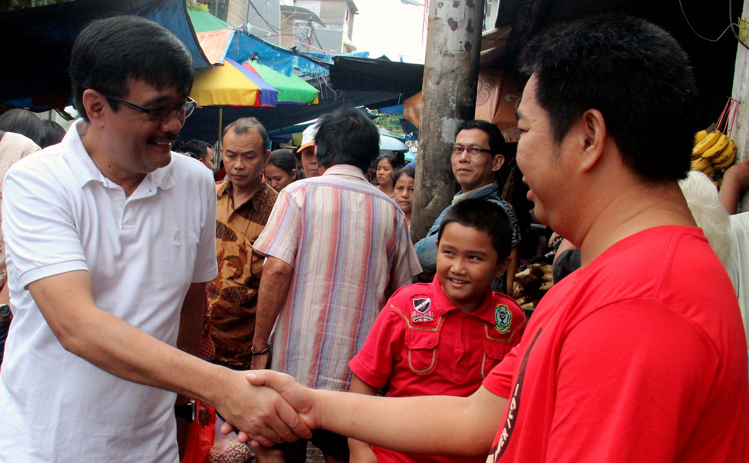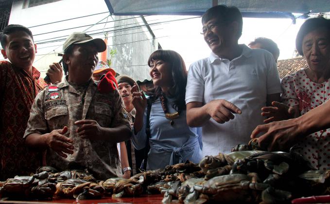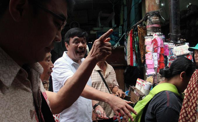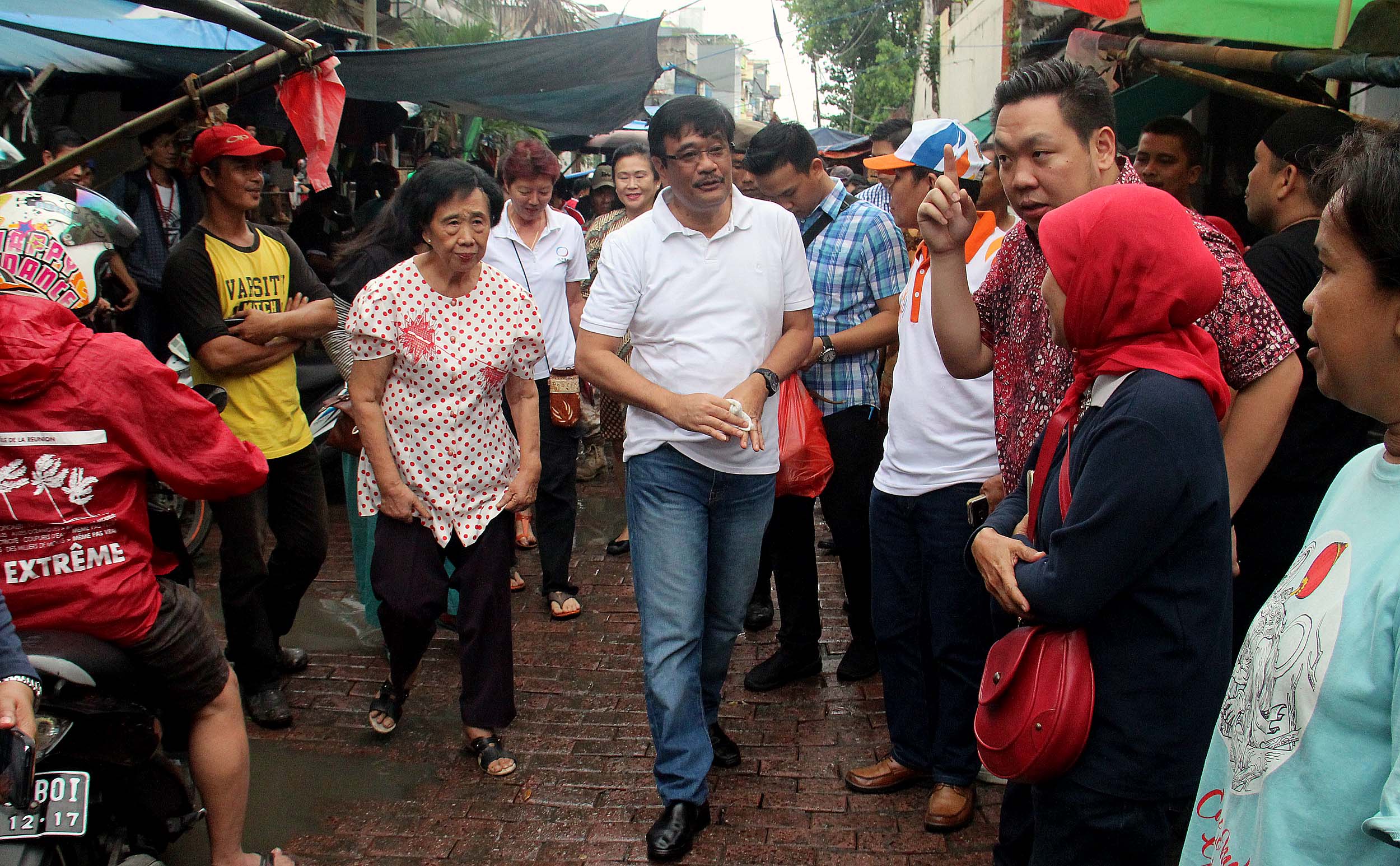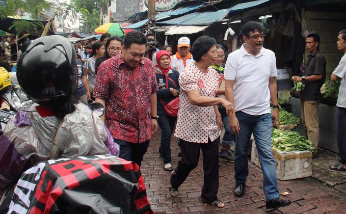 Wakil Gubenur DKI Jakarta Djarot Saiful Hidayat bersama Anggota DPR RI Fraksi PDIP Charles Honoris melakukan blusukan dan belanja di Pasar Petak Sembilan, Jakarta Barat, Sabtu (18/6/2016). Wakil Gubenur DKI Jakarta Djarot Saiful Hidayat menyoroti kondisi jalan di pasar yang becek dan banyak genangan air. Djarot meminta agar fasilitas cagar budaya dan lingkungan sekitarnya perlu ditata lebih bagus lagi.