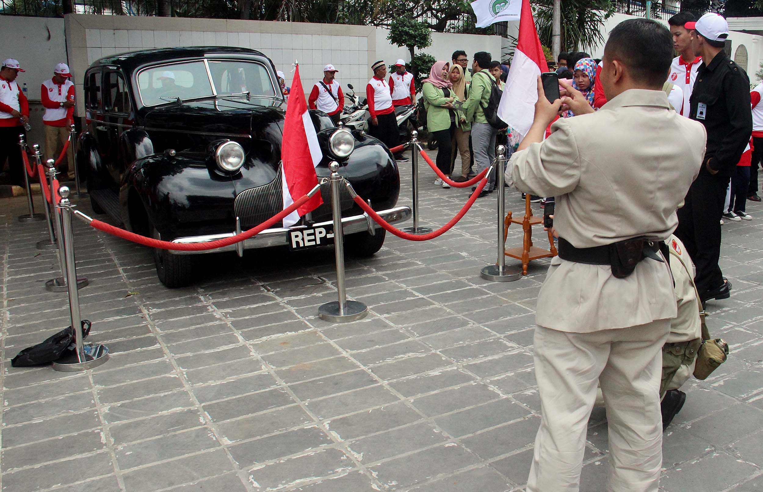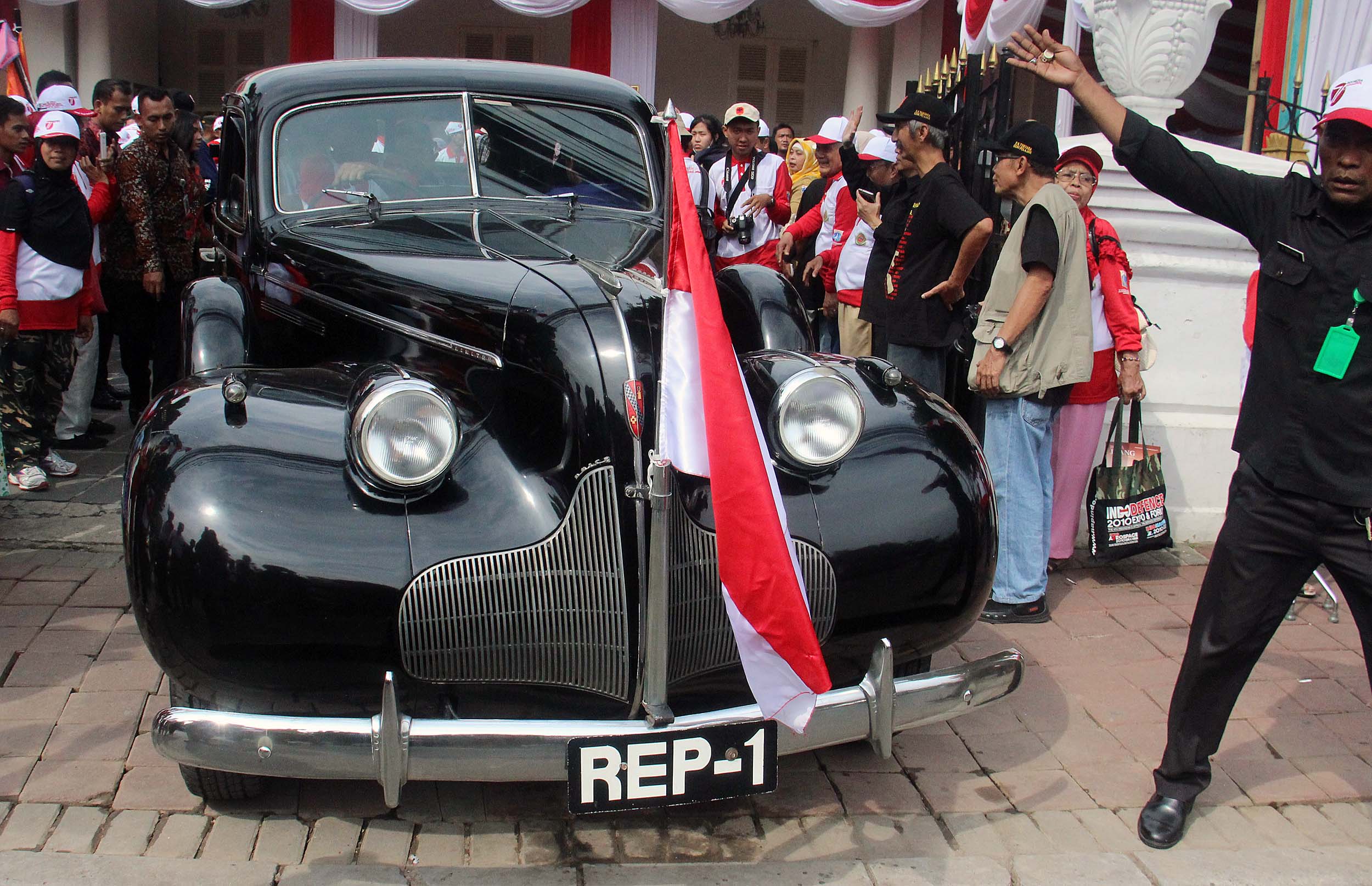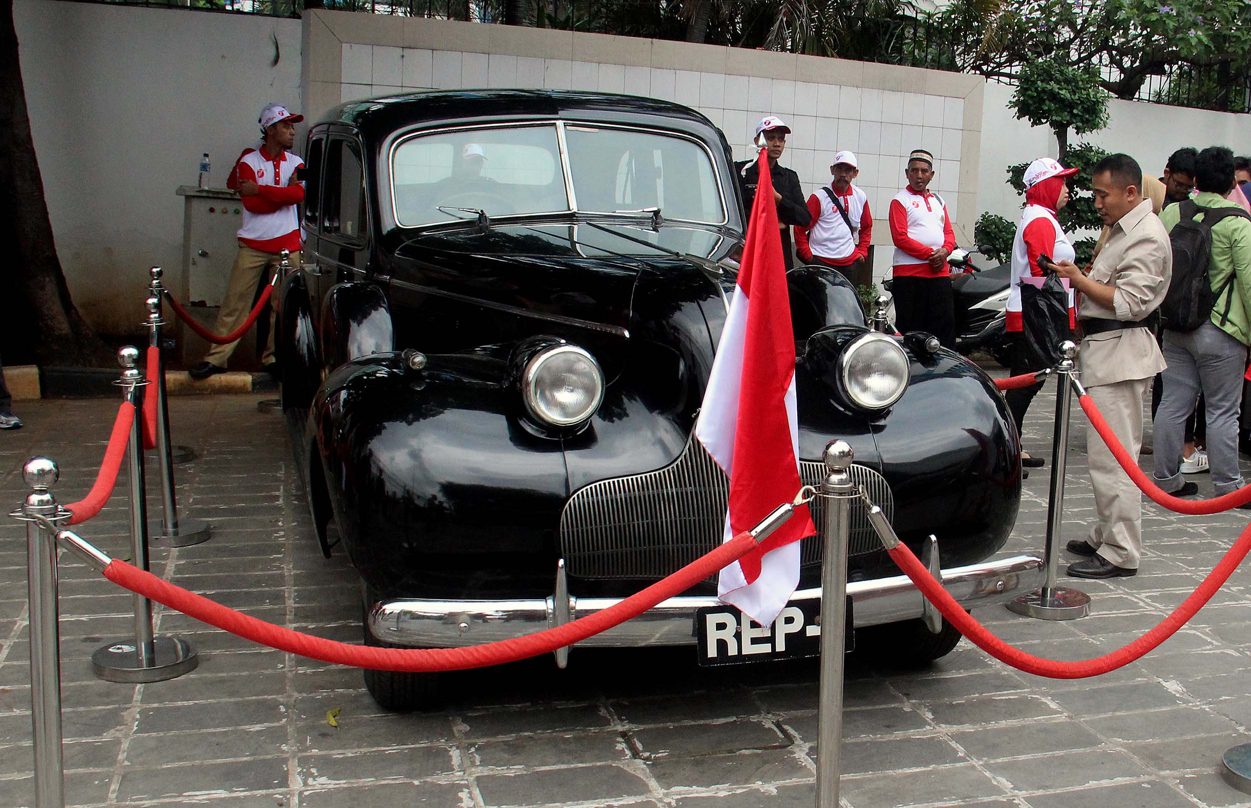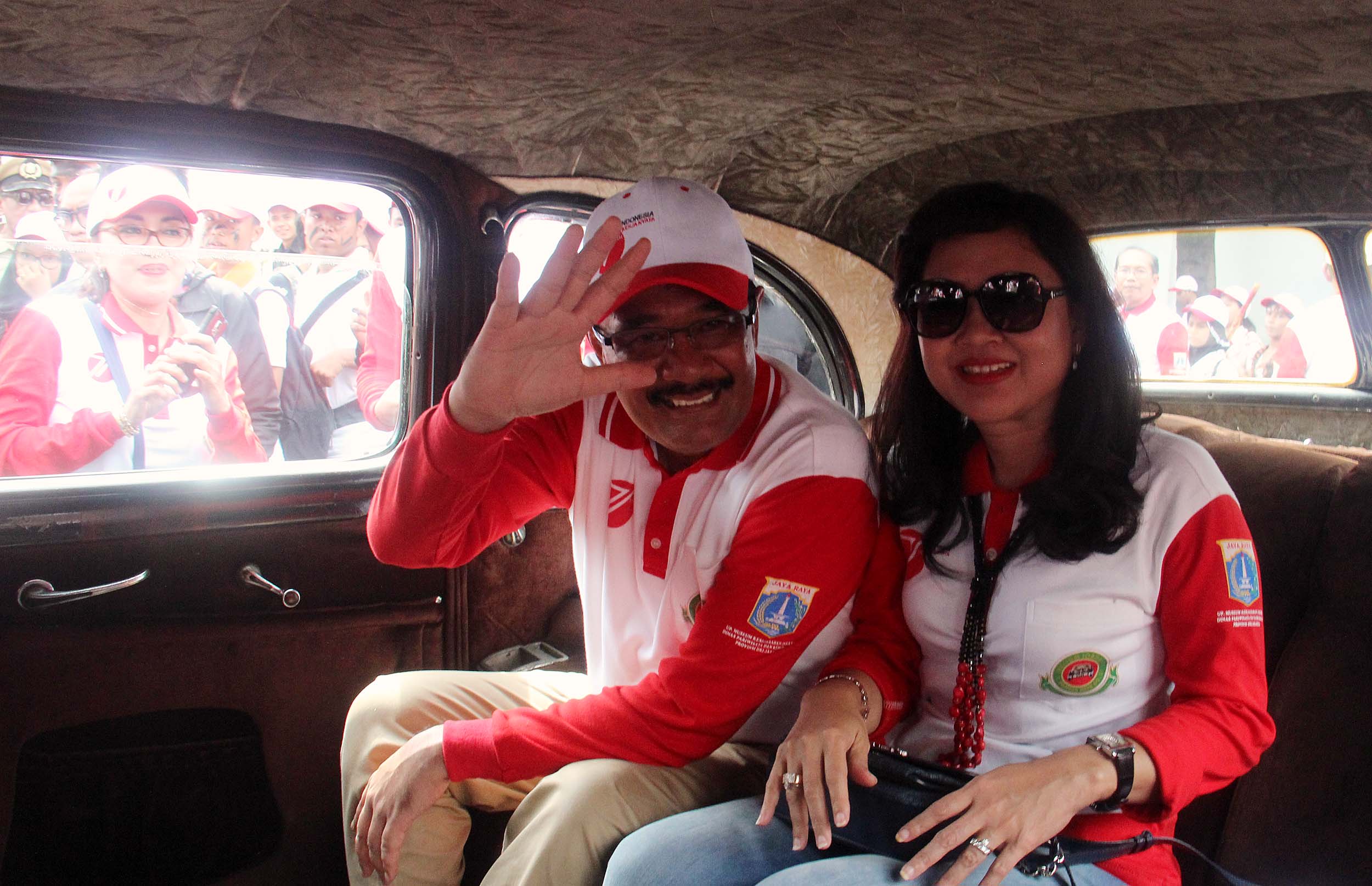 Wakil Gubernur DKI Jakarta Djarot Saiful Hidayat di dampingi sang istri naik mobil kepresidenan pertama di Jakarta, Selasa (15/8/2016). Djarot beserta istri menaiki mobil dinas Presiden RI pertama Soekarno, yaitu mobil REP 1 dan mengikuti jalur napak tilas bersama para peserta dari elemen masyarakat, pelajar, mahasiswa, wirawati dan komunitas museum.
