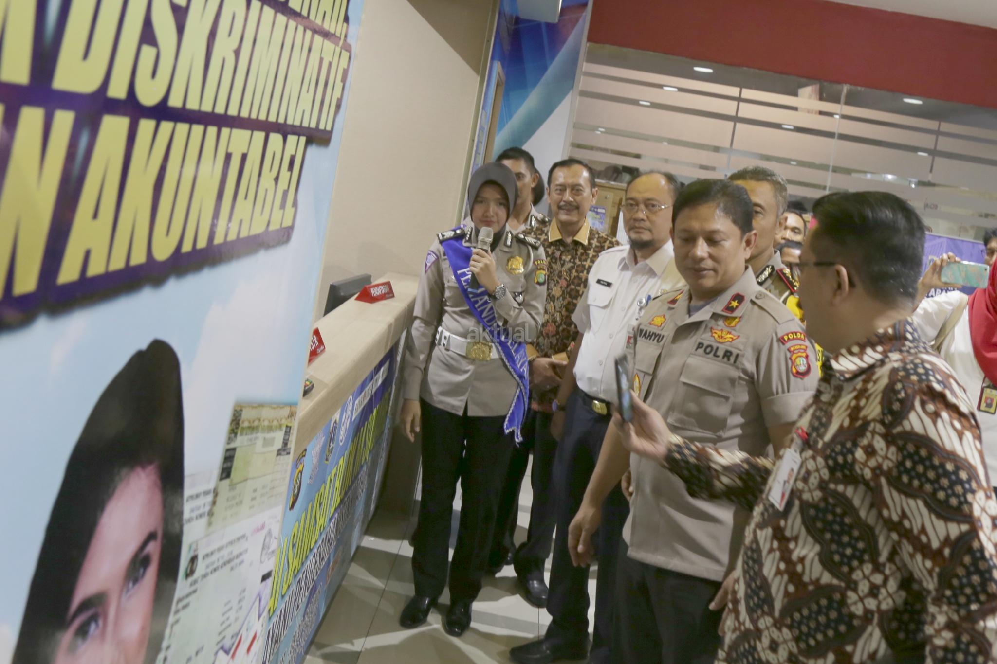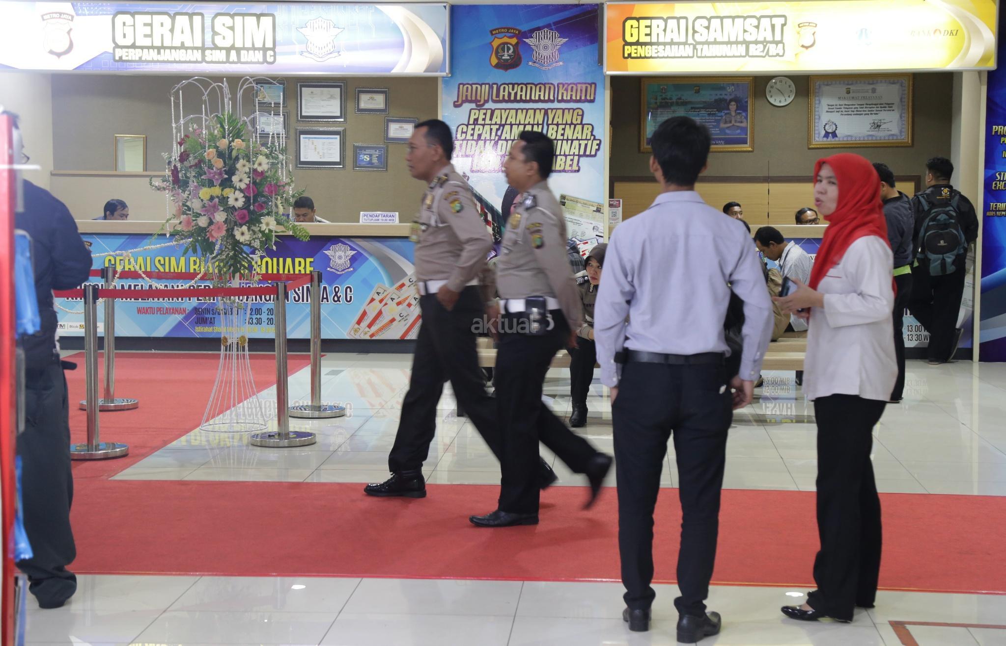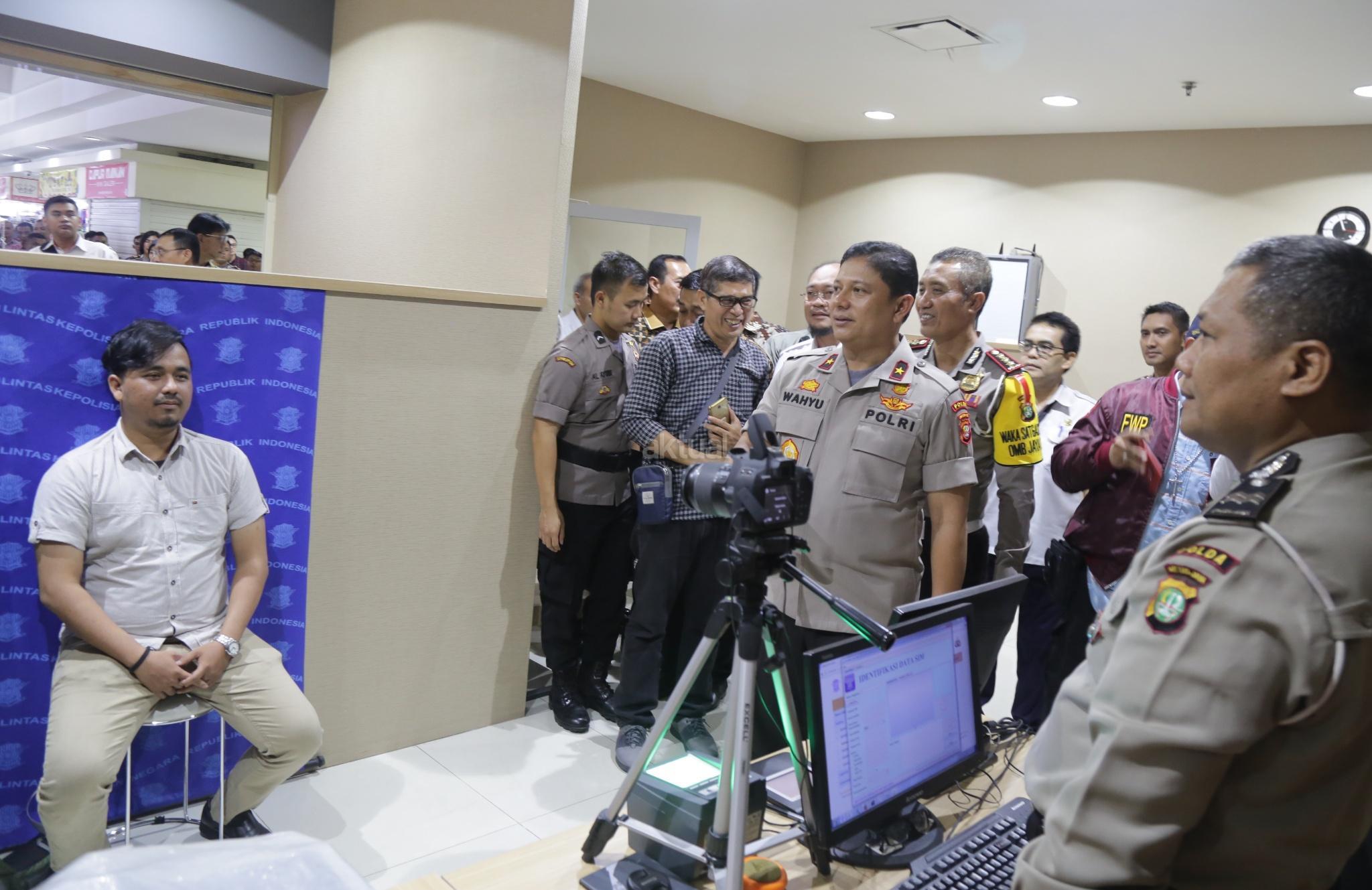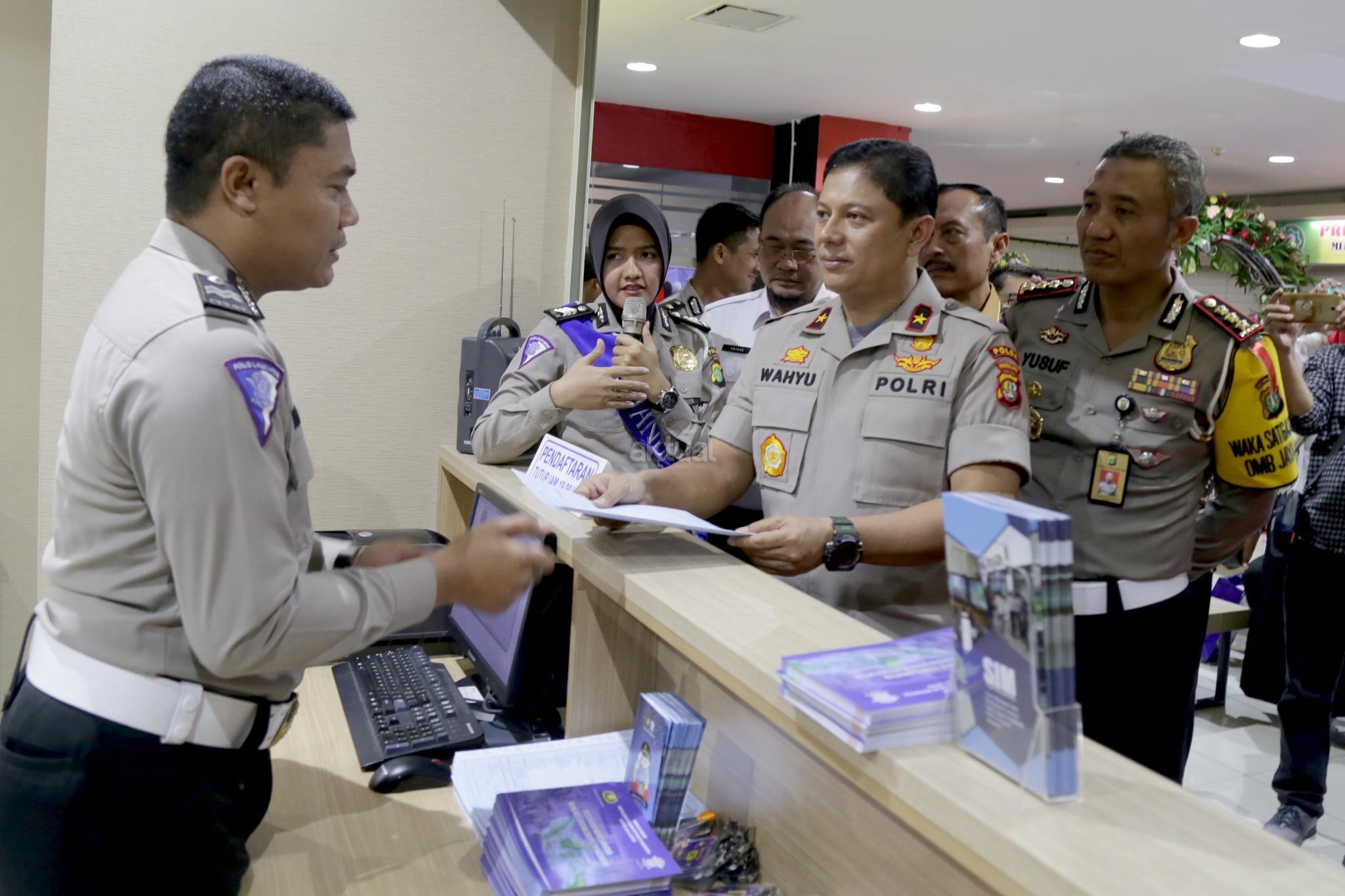 Wakapolda Metro Jaya Brigjen Pol Wahyu Hadiningrat (tengah) melihat proses perpanjangan SIM saat meninjau proses perpanjangan SIM dan STNK usai peresmian Gerai Samsat, Blok M Square di Jakarta, Rabu (26/9). Layanan perpanjangan SIM dan Samsat yang berada di pusat perbelanjaan tersebut dibuka untuk memudahkan masyarakat dalam mengurus SIM dan perpanjangan STNK. AKTUAL/Tino Oktaviano