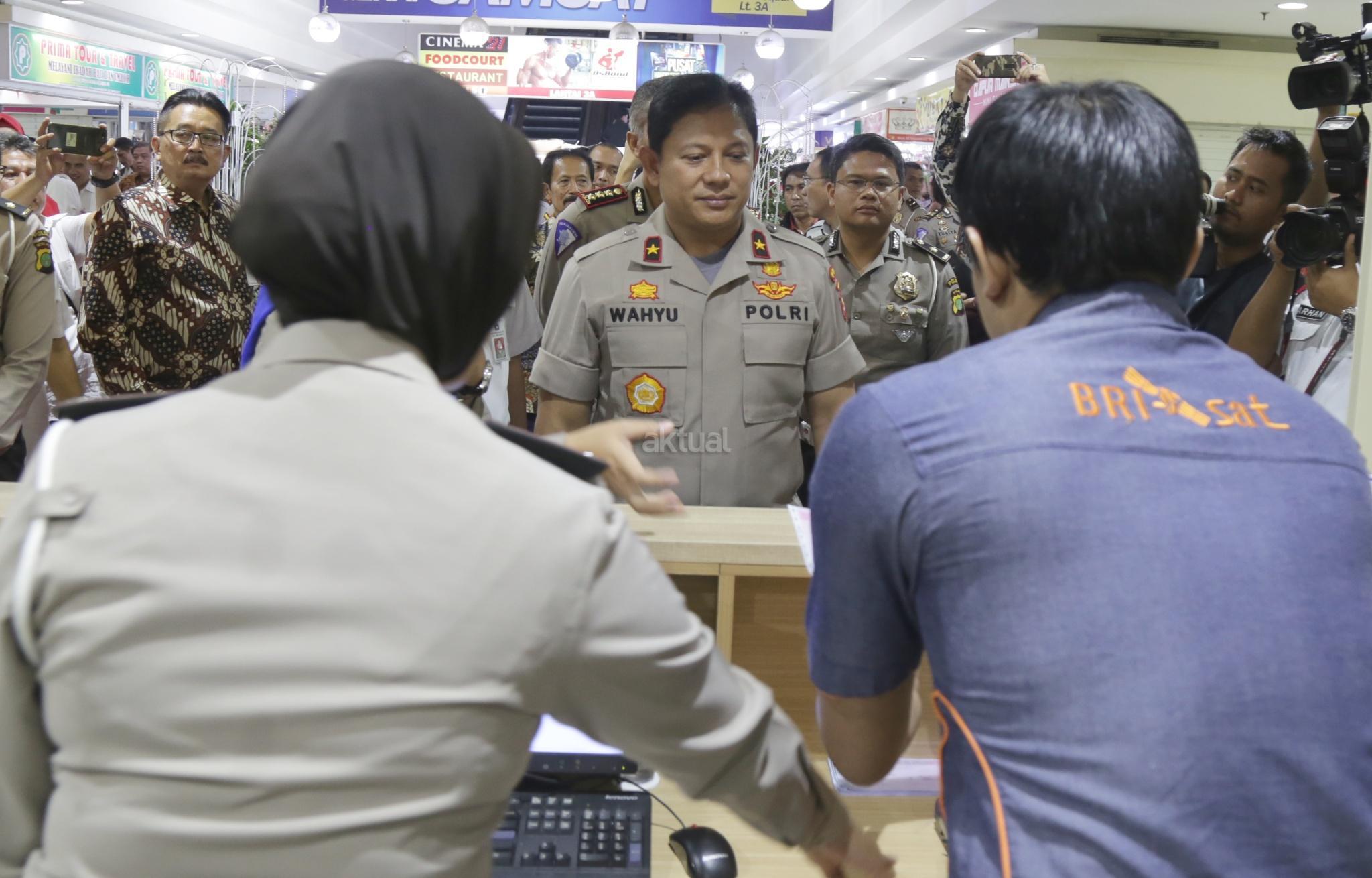 Wakapolda Metro Jaya Brigjen Pol Wahyu Hadiningrat (tengah) berbincang dengan patugas saat meninjau proses perpanjangan SIM dan STNK usai peresmian Gerai Samsat, Blok M Square di Jakarta, Rabu (26/9). Layanan perpanjangan SIM dan Samsat yang berada di pusat perbelanjaan tersebut dibuka untuk memudahkan masyarakat dalam mengurus SIM dan perpanjangan STNK. AKTUAL/Tino Oktaviano