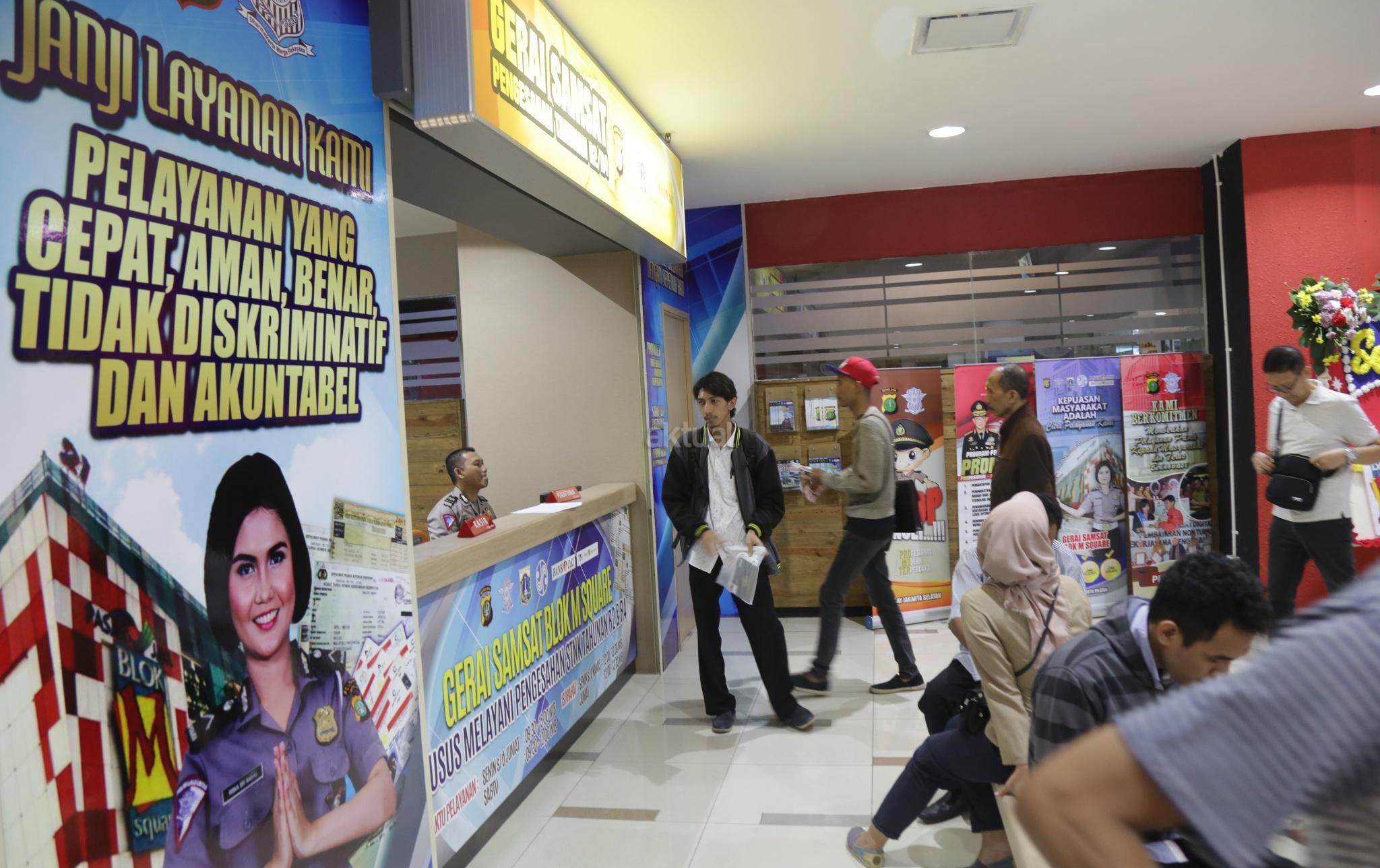Warga melakukan proses perpanjangan STNK di Gerai Samsat dan SIM Blok M Square usai peresmian di Jakarta, Rabu (26/9). Layanan perpanjangan SIM dan Samsat yang berada di pusat perbelanjaan tersebut dibuka untuk memudahkan masyarakat dalam mengurus SIM dan perpanjangan STNK. AKTUAL/Tino Oktaviano
