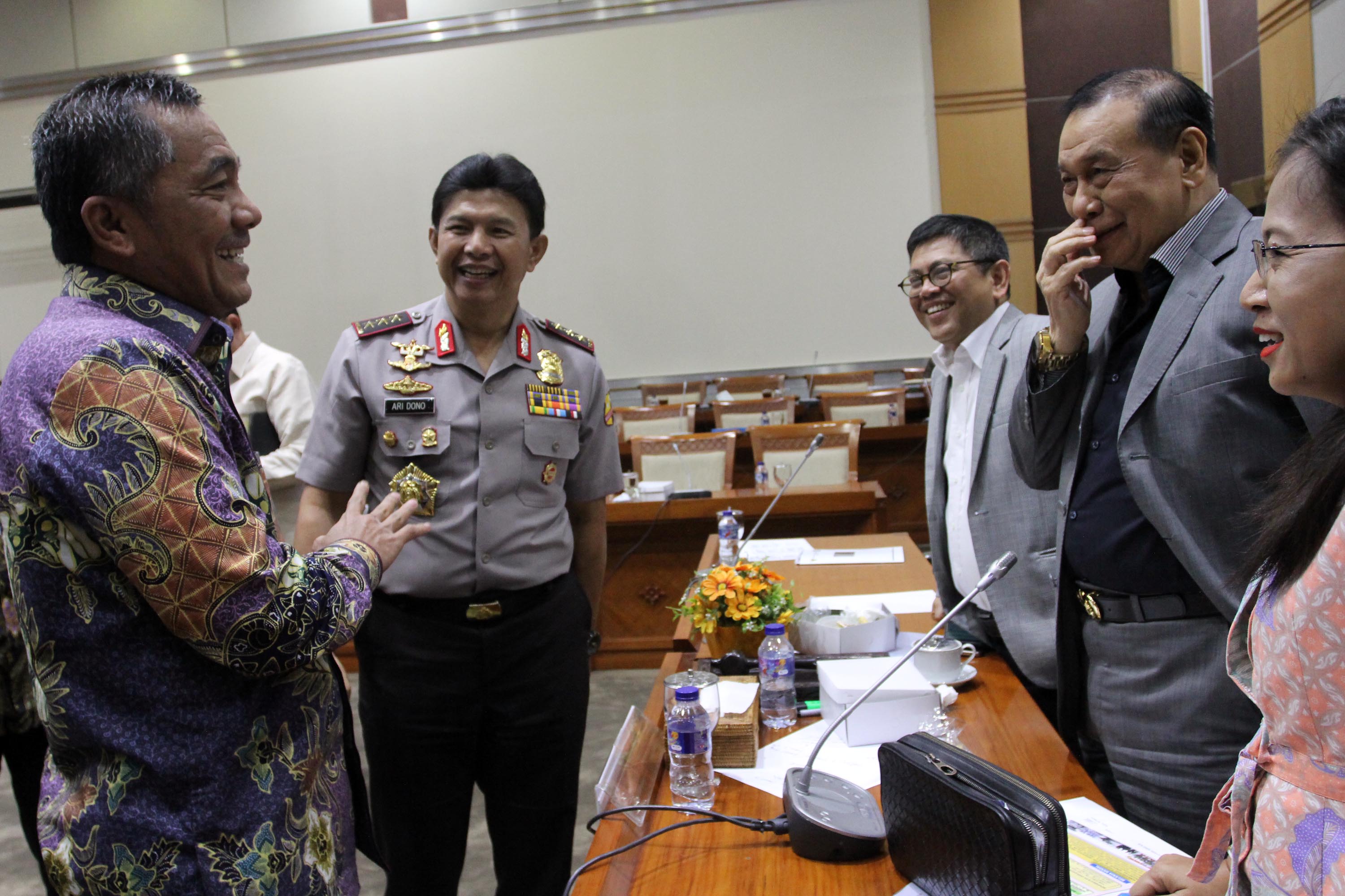 Waka Polri Komjen Polisi Ari Dono Sukmanto (kedua dari kiri) berbicang dengan Ketua Komisi III DPR dari Fraksi Golkar Kahar Muzakir (kedua dari kanan) Wakil Ketua Komisi III dari Farksi Demokrat Erma Suryani Ranik (kanan), anggota Komisi III Fraksi Nasdem Taufiqulhadi (tengah) dan anggota Komisi III Fraksi Hanura Syarifuddin Suding (kiri) bertegur sapa usai mengikuti Rapat Dengar Pendapat (RDP) di Gedung Nusantara III, Kompleks Parlemen Senayan, Jakarta, Kamis (6/9). Rapat tersebut membahas Rencana Kerja Anggaran Kementerian/Lembaga (RKA – KL) Tahun 2019, hasil dari RUU APBN. AKTUAL/Tino Oktaviano