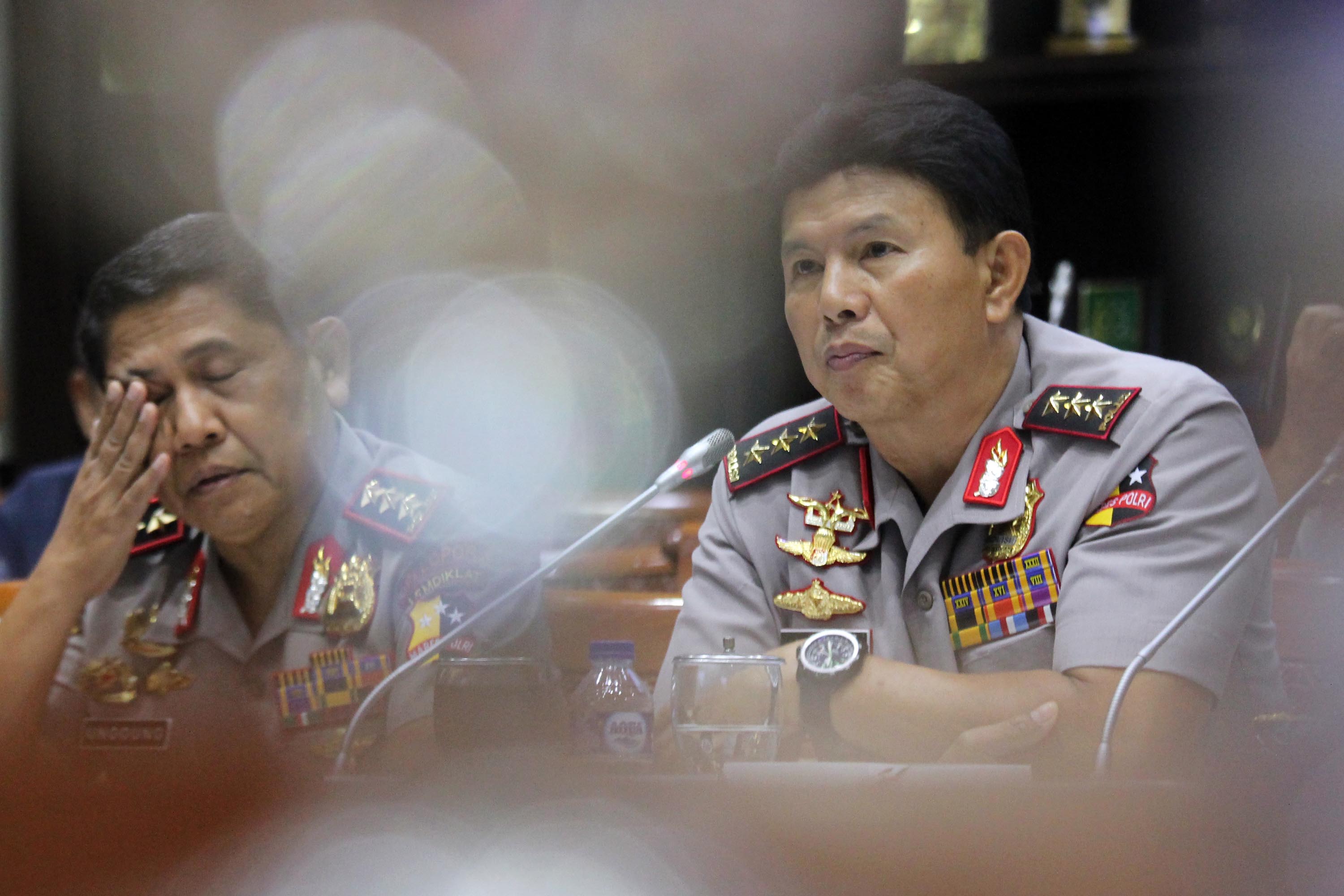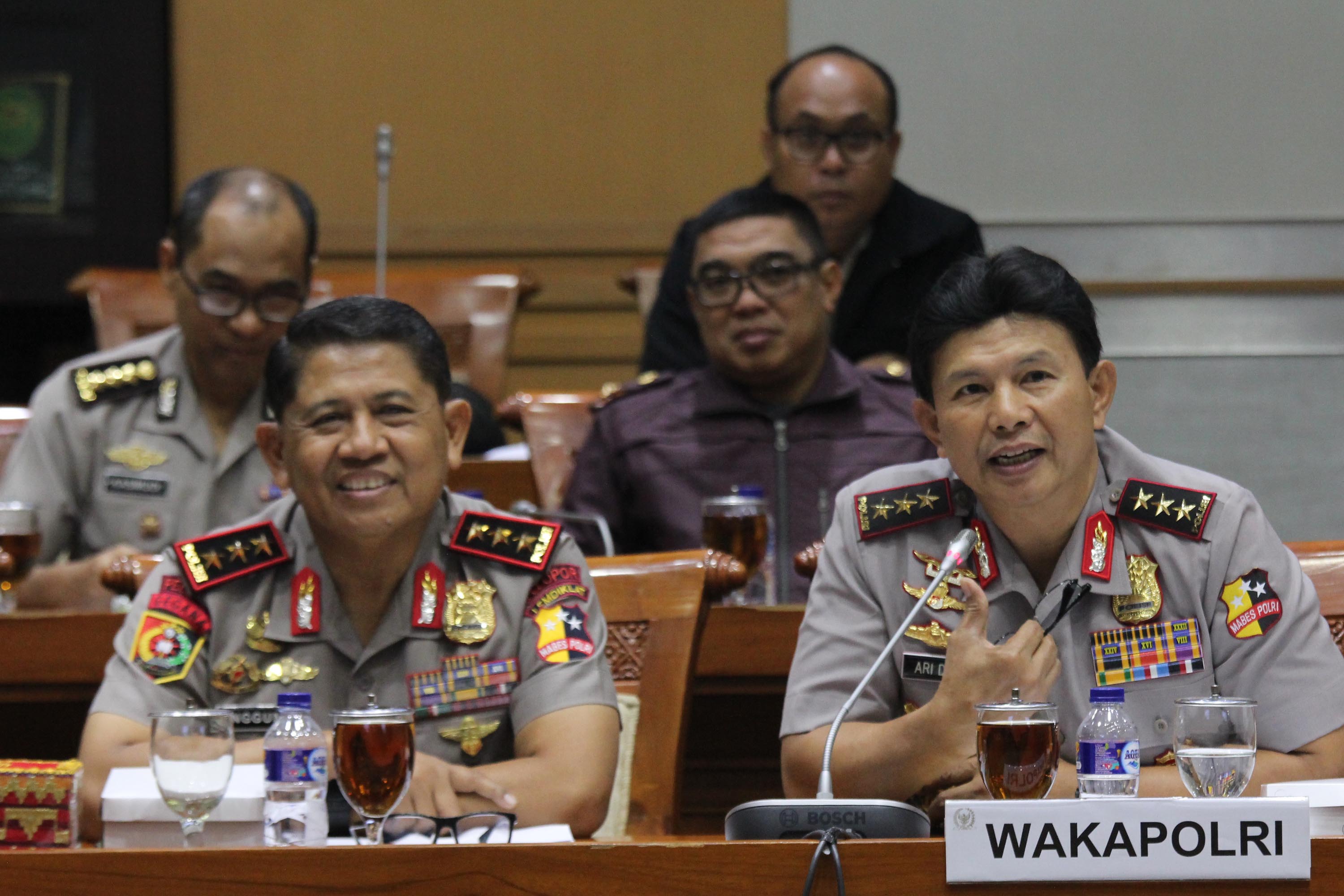 Waka Polri Komjen Polisi Ari Dono Sukmanto (kanan) Kepala Lembaga Pendidikan dan Pelatihan Polri Komjen Polisi Unggung Cahyono (kiri), mengikuti Rapat Dengar Pendapat (RDP) di Gedung Nusantara III, Kompleks Parlemen Senayan, Jakarta, Kamis (6/9). Rapat tersebut membahas Rencana Kerja Anggaran Kementerian/Lembaga (RKA – KL) Tahun 2019, hasil dari RUU APBN. AKTUAL/Tino Oktaviano