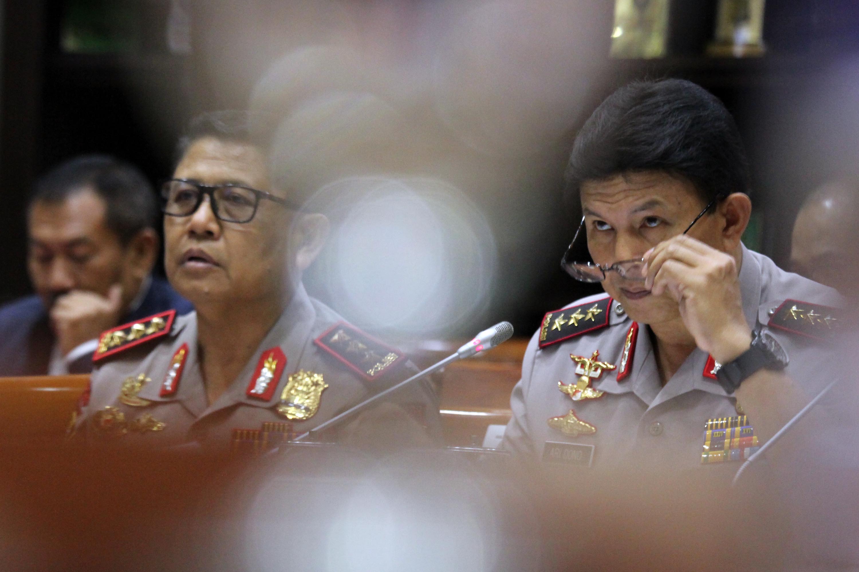 Waka Polri Komjen Polisi Ari Dono Sukmanto (kanan) Kepala Lembaga Pendidikan dan Pelatihan Polri Komjen Polisi Unggung Cahyono (kiri), mengikuti Rapat Dengar Pendapat (RDP) di Gedung Nusantara III, Kompleks Parlemen Senayan, Jakarta, Kamis (6/9). Rapat tersebut membahas Rencana Kerja Anggaran Kementerian/Lembaga (RKA - KL) Tahun 2019, hasil dari RUU APBN. AKTUAL/Tino Oktaviano