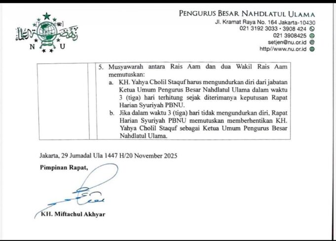 Gus Yahya, sapaan KH Yahya Cholis Staquf, diberi waktu hingga Minggu, 23 November 2025 untuk mengundurkan diri. Bila tidak, Gus Yahya akan diberhentikan dari jabatan Ketum PBNU.