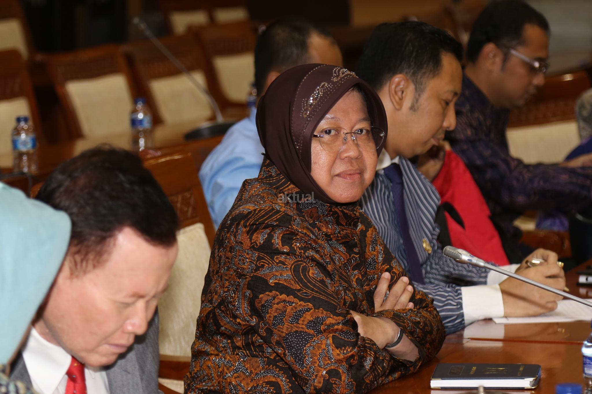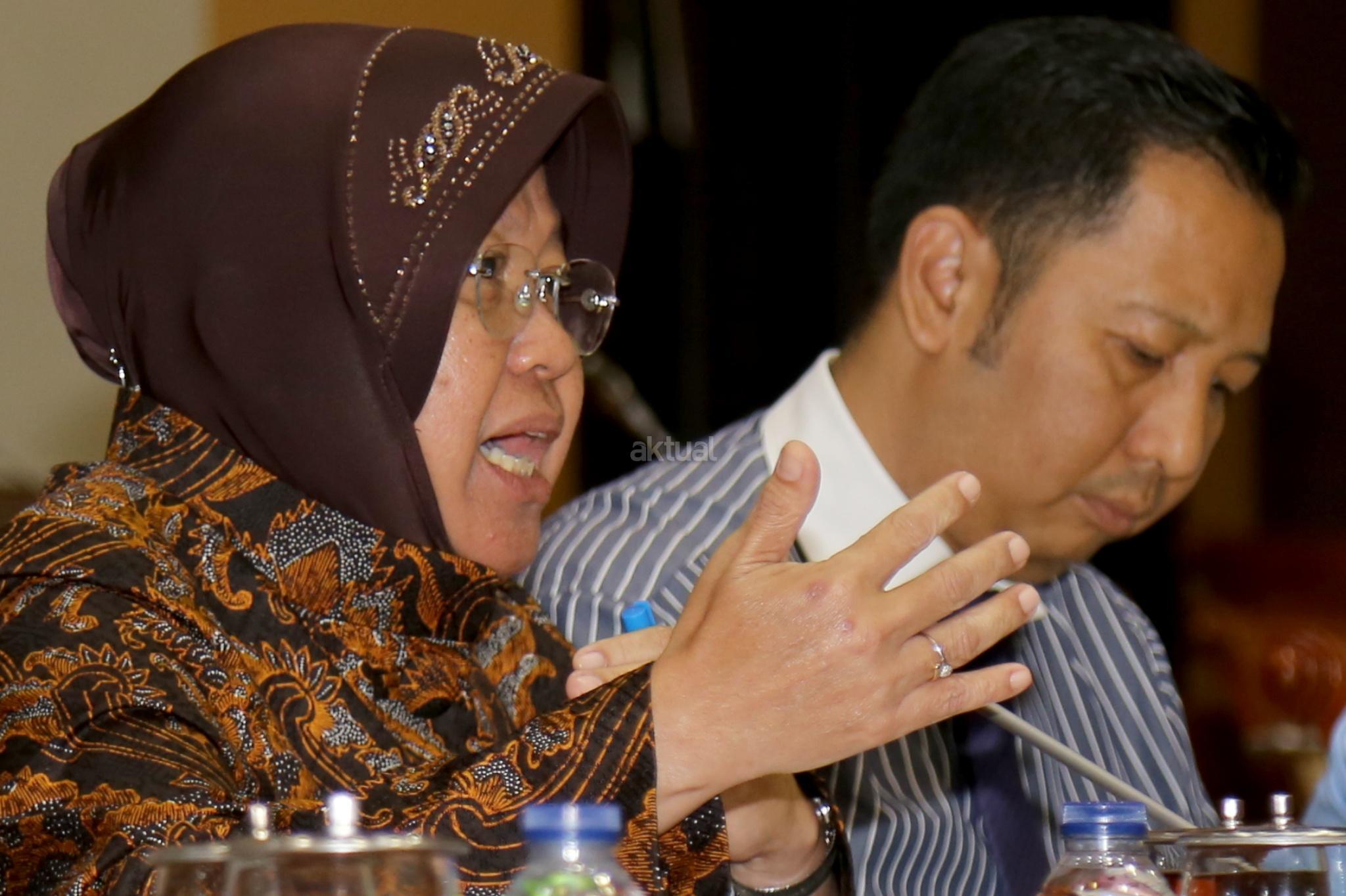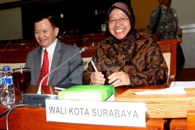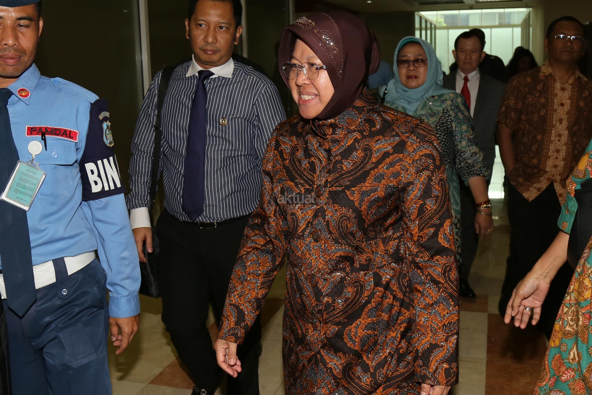 Walikota Surabaya Tri Rismaharini bersiap melakukan Rapat dengar Pendapat dengan Komisi III DPR, Jakarta, Selasa (29/11). Komisi III meminta penjalasan tentang perkembangan pembangunan pasar Turi Surabaya ke Risma. AKTUAL/Tino Oktaviano
