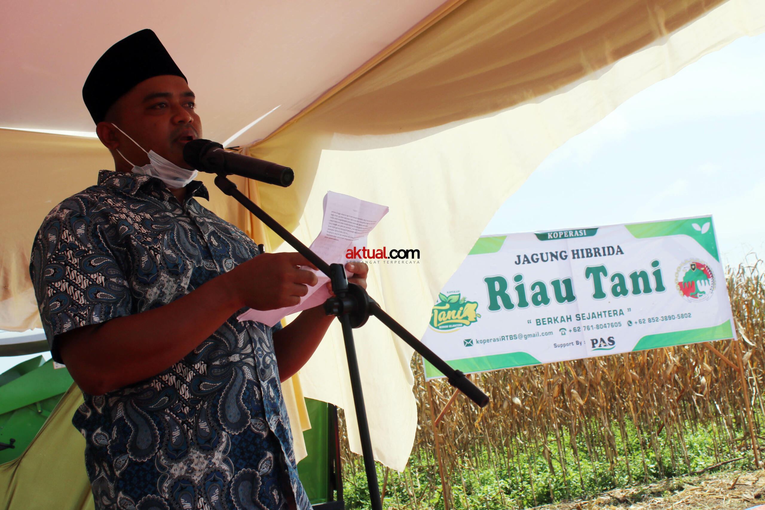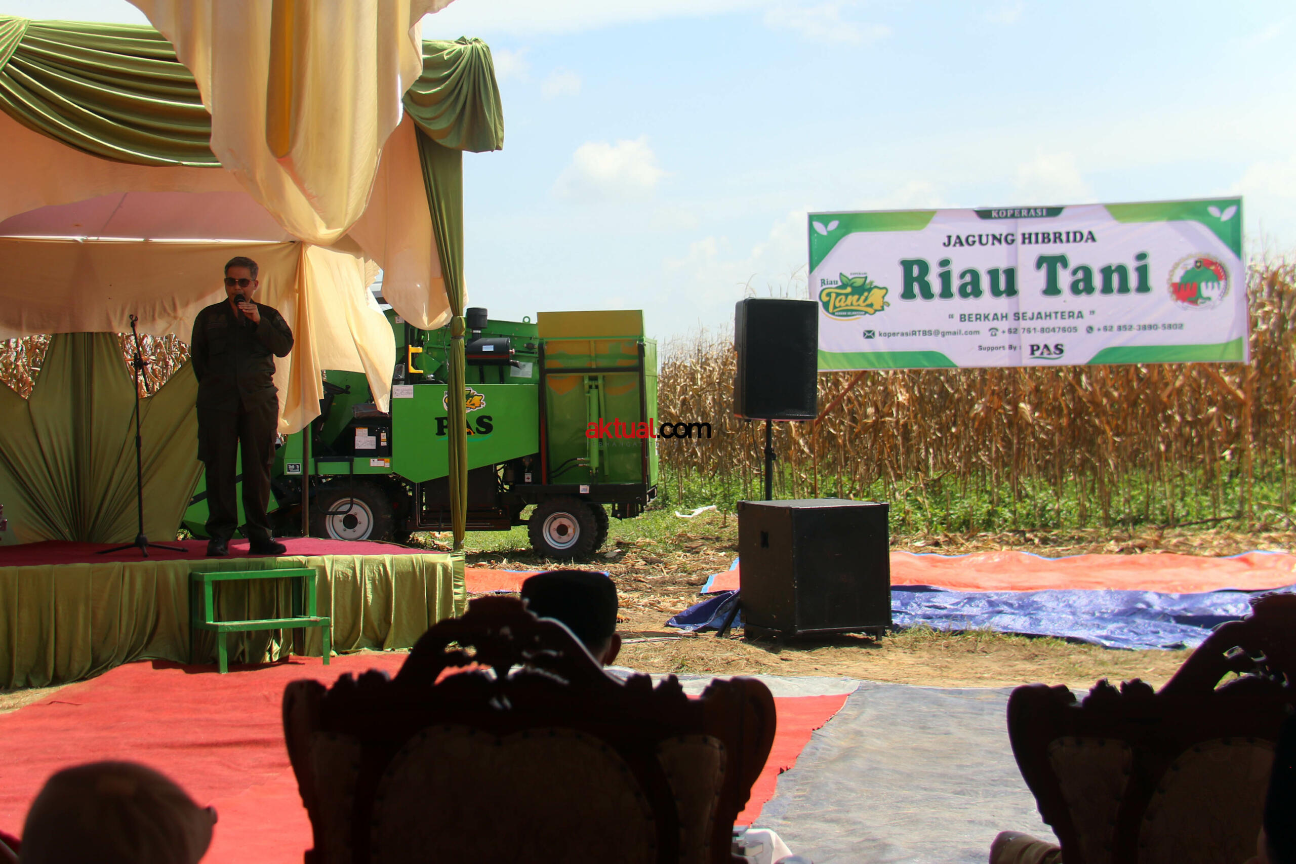 Pidato sambutan Ketua Koperasi RTBS, Irfan Kasogi dalam Kegiatan Panen Jagung dan Penerapan Mekanisasi Pertanian yang diselenggarakan Koperasi Riau Tani Berkah Sejahtera (RTBS) di kawasan Agrowisata, Pekanbaru, Riau, Senin (21/6) siang. Foto: Warnoto/Aktual.com