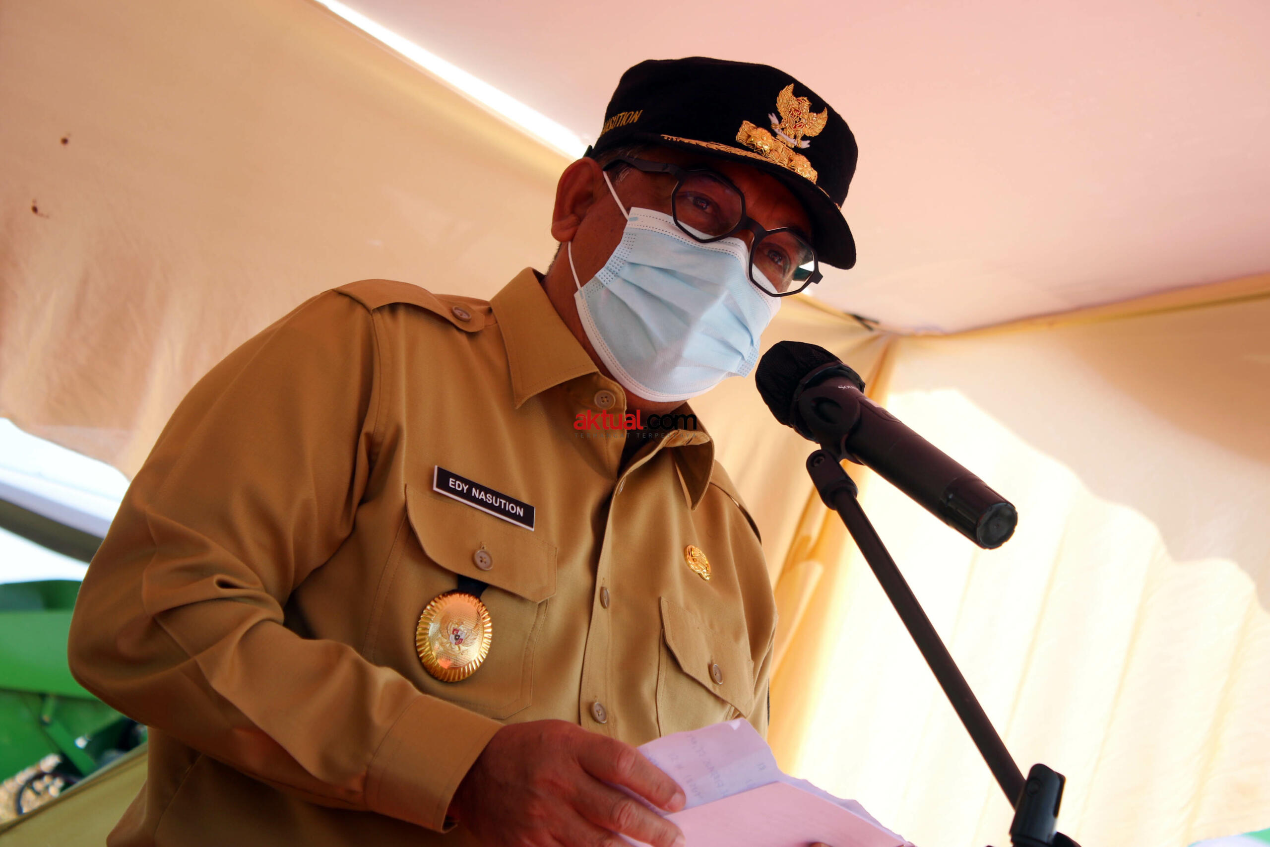 Pidato sambutan Wakil Gubernur, Edy Afrizal Natar Nasution dalam Kegiatan Panen Jagung dan Penerapan Mekanisasi Pertanian yang diselenggarakan Koperasi Riau Tani Berkah Sejahtera (RTBS) di kawasan Agrowisata, Pekanbaru, Riau, Senin (21/6) siang. Foto: Warnoto/Aktual.com