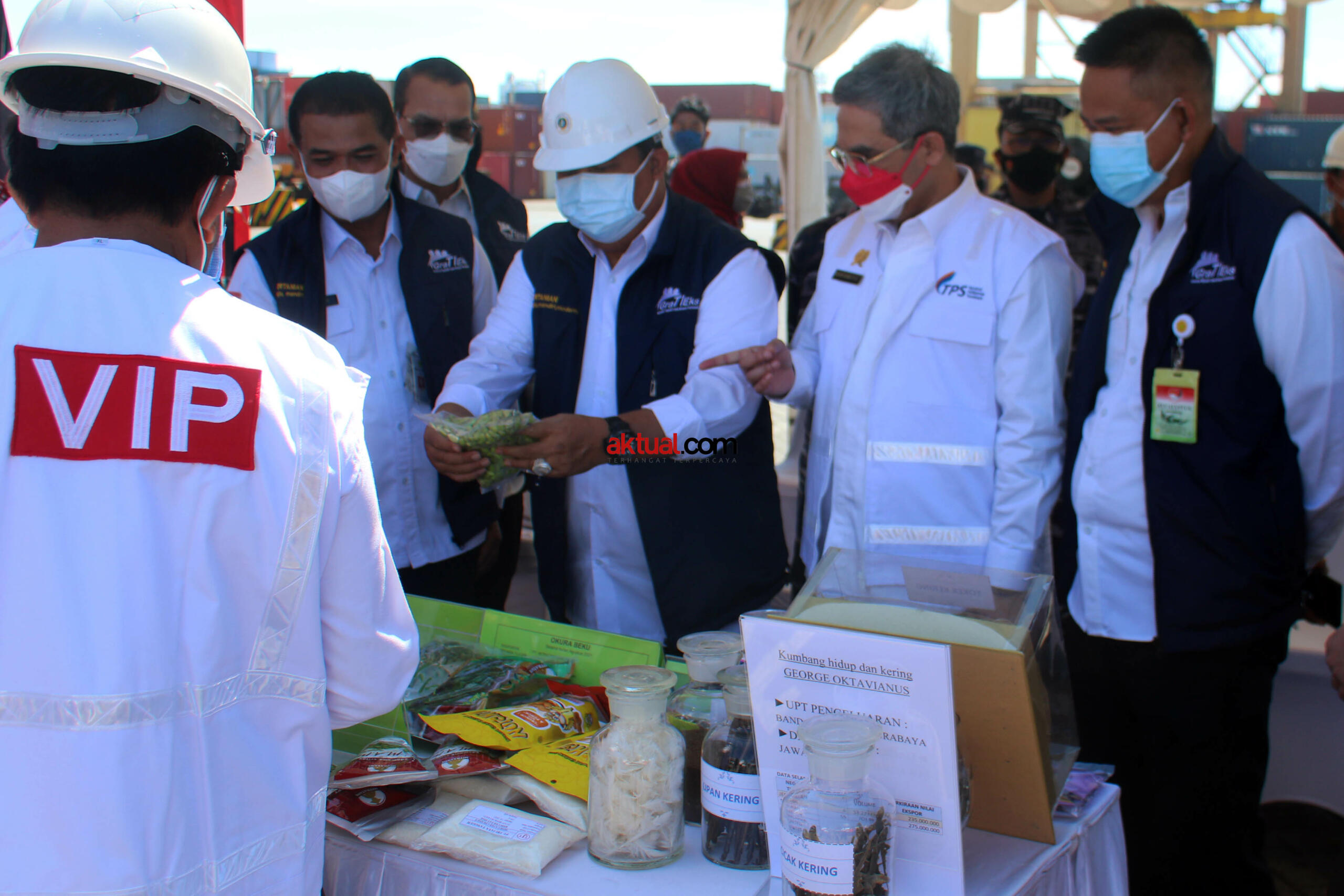Wakil Menteri Pertanian, Harvick Hasnul Qolbi saat meninjau sejumlah produk pertanian berorientasi ekspor yang dipamerkan dalam seremoni pelepasan Merdeka Ekspor Pertanian oleh Presiden Joko Widodo, yang diikuti oleh jajaran kabinet juga kepala daerah secara virtual di Pelabuhan Tanjung Perak, Surabaya, pada Sabtu (14/8/2021). Kegiatan ini dilakukan secara serentak di sejumlah pelabuhan di Indonesia. (Foto: Aktual / Warnoto)