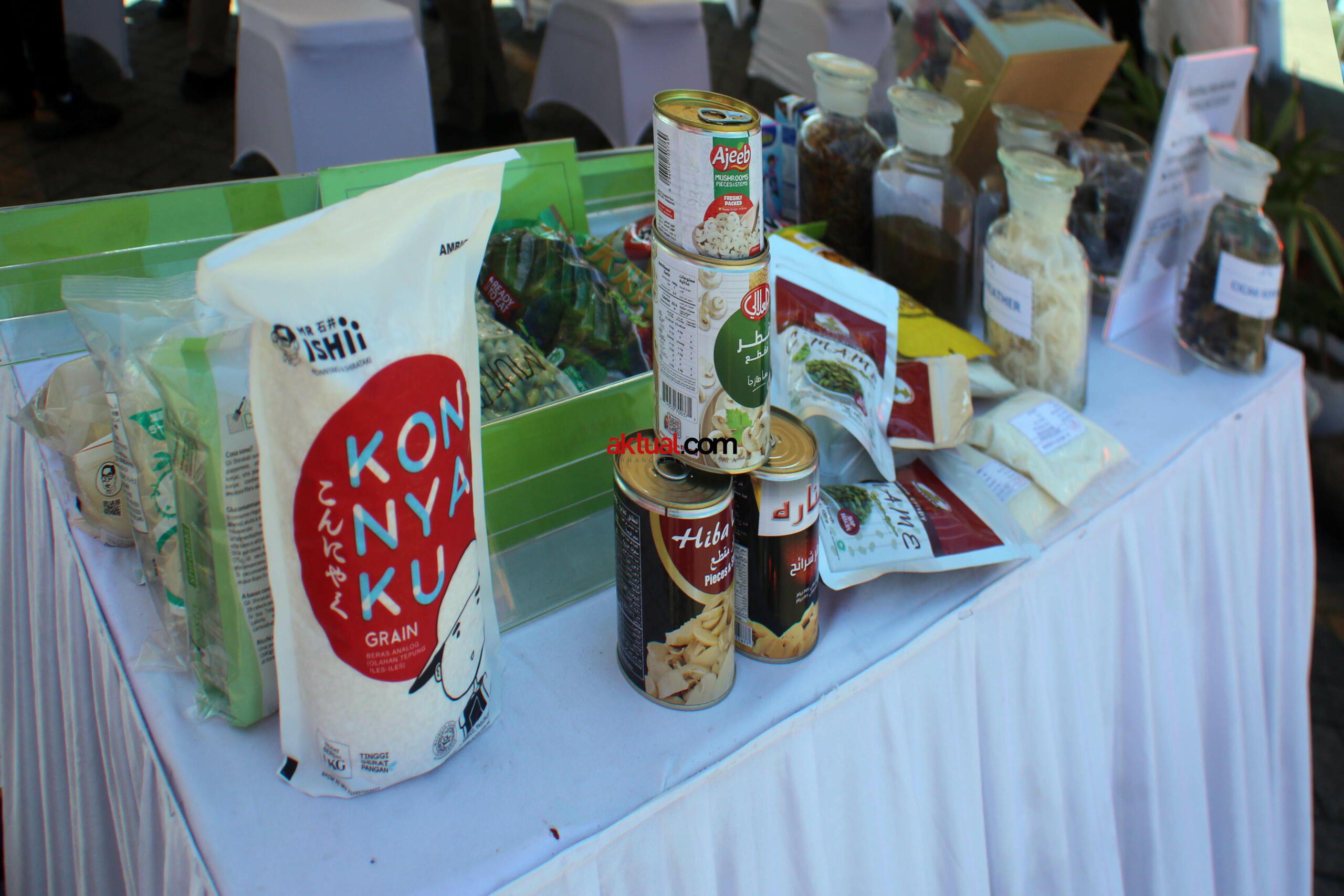 Sejumlah produk pertanian berorientasi ekspor yang dipamerkan dalam seremoni pelepasan Merdeka Ekspor Pertanian oleh Presiden Joko Widodo, yang diikuti oleh jajaran kabinet juga kepala daerah secara virtual di Pelabuhan Tanjung Perak, Surabaya, pada Sabtu (14/8/2021). Kegiatan ini dilakukan secara serentak di sejumlah pelabuhan di Indonesia. (Foto: Aktual / Warnoto)