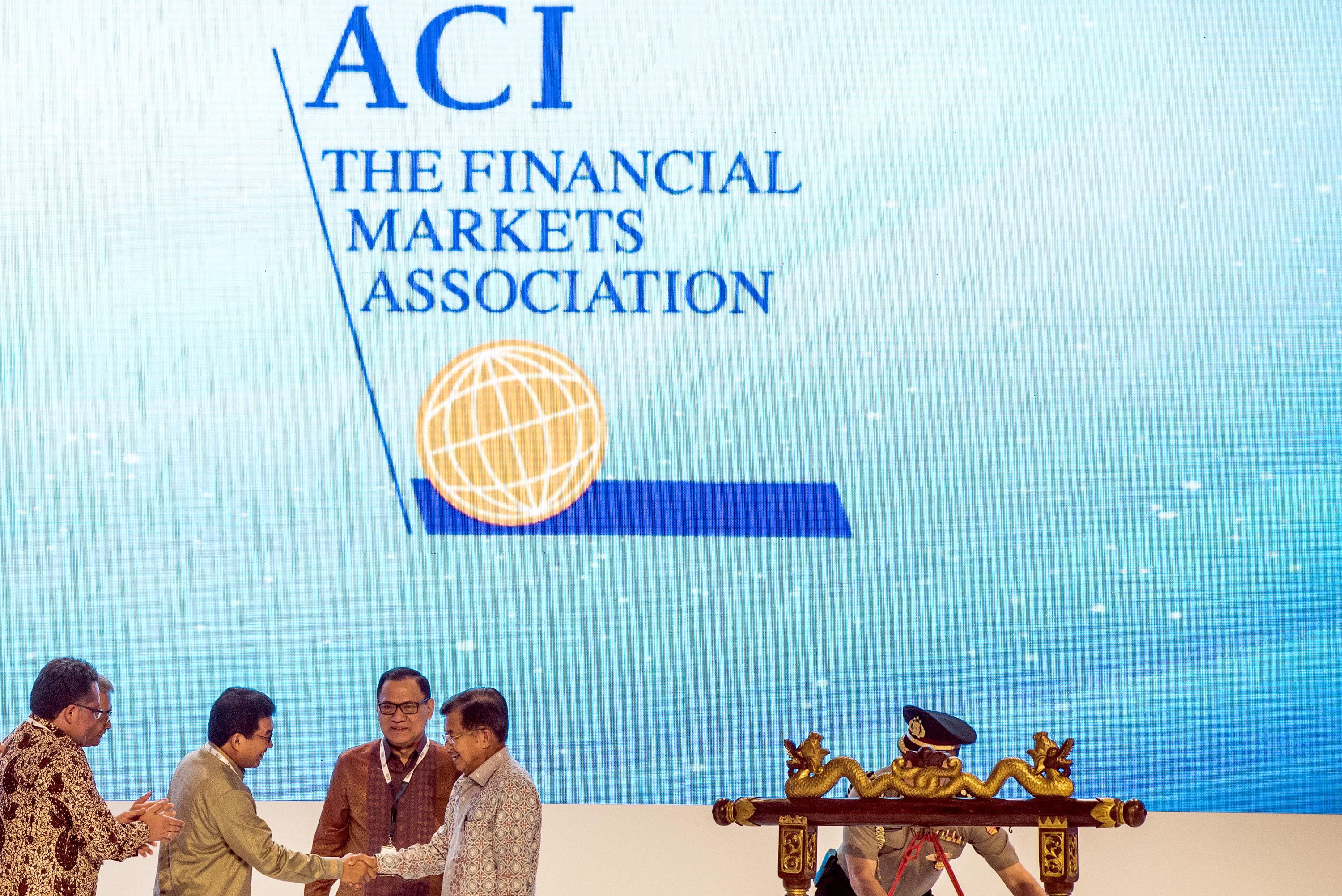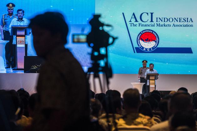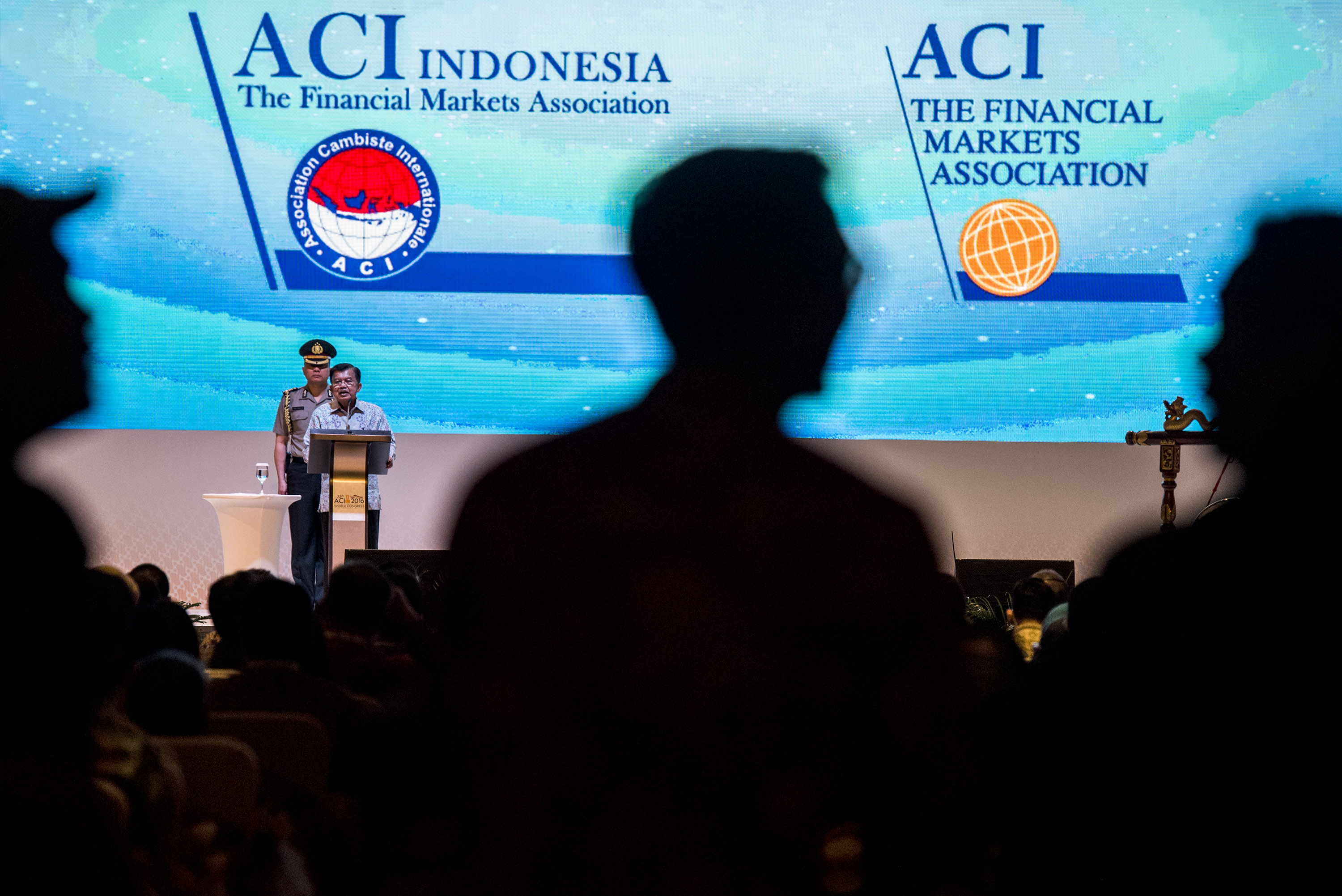 Wakil Presiden Jusuf Kalla menyampaikan pidatonya saat pembukaan The 55th ACI - Financial Market Association (ACI-FMA) World Congress di Jakarta, Jumat (29/4). Kongres itu merupakan wadah penting bagi para profesional keuangan dari seluruh dunia untuk membangun jejaring, berdiskusi dan memperdebatkan kesempatan, tantangan bisnis saat ini, terutama di bidang keuangan dan bertekad untuk meningkatkan peran Indonesia sebagai salah satu kekuatan ekonomi dunia. ANTARA FOTO/M Agung Rajasa/foc/16.