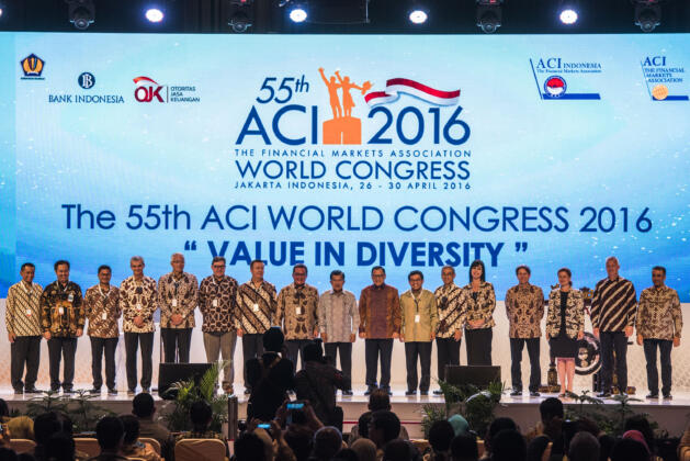 Wakil Presiden Jusuf Kalla (tengah) didampingi Ketua Dewan Komisioner OJK Muliaman D. Hadad (ketujuh kanan) dan Gubernur BI Agus Martowardojo (kedelapan kanan) foto bersama dengan pengurus ACI - Financial Market Association (FMA) World Congress saat pembukaan "The 55th ACI-FMA World Congress" di Jakarta, Jumat (29/4). Kongres itu merupakan wadah penting bagi para profesional keuangan dari seluruh dunia untuk membangun jejaring, berdiskusi dan memperdebatkan kesempatan, tantangan bisnis saat ini, terutama di bidang keuangan dan bertekad untuk meningkatkan peran Indonesia sebagai salah satu kekuatan ekonomi dunia. ANTARA FOTO/M Agung Rajasa/foc/16.