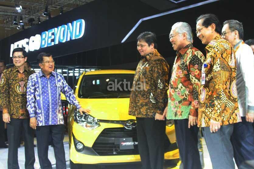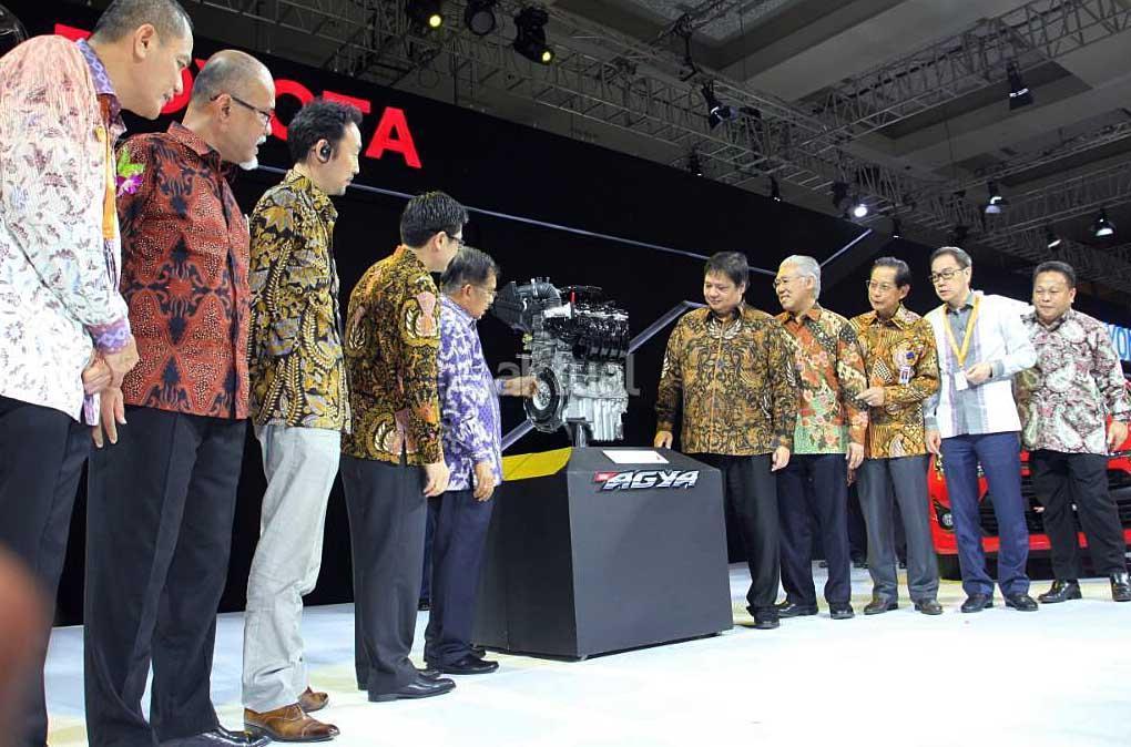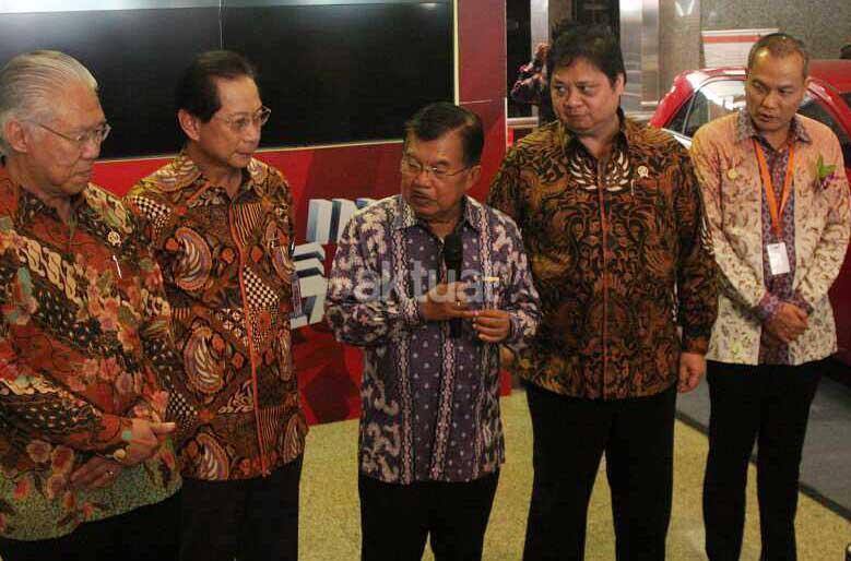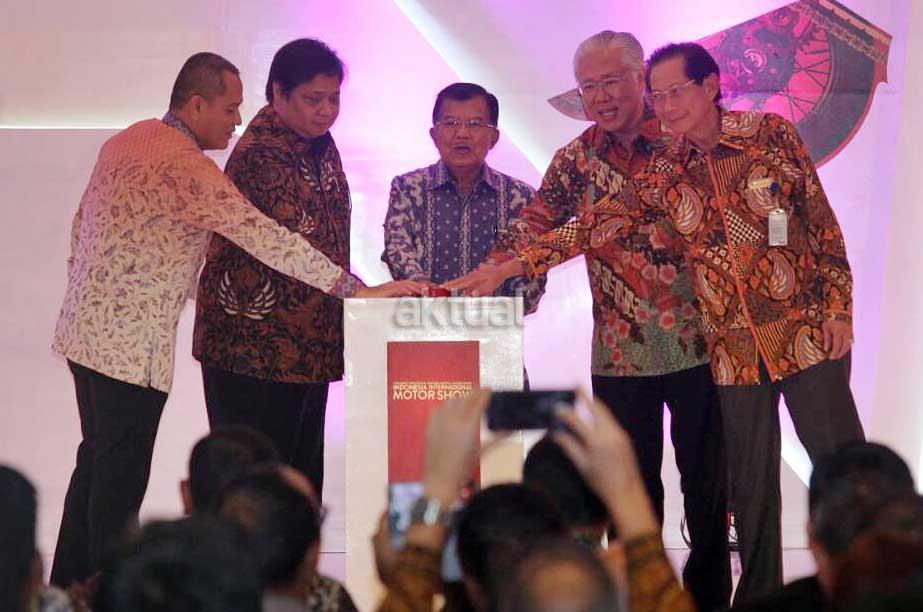 Wakil Presiden Jusuf Kalla (tengah) didampingi Menteri Perindustrian Airlangga Hartarto (kedua kiri), Menteri Perdagangan Enggartiasto Lukita (kedua kanan), Komisaris Utama Dyandra Promosindo Lilik Oetama (kiri), dan Presiden Direktur Bank BCA Jahja Setiaatmadja membuka secara simbolis Indonesia International Motor Show (IIMS) 2017 di JiExpo Kemayoran, Jakarta, Kamis (27/4). Ajang pameran industri otomotif yang berlangsung pada 27 April-7 Mei 2017 ini menargetkan nilai transaksi sebesar Rp3,1 triliun. AKTUAL/Eko S Hilman