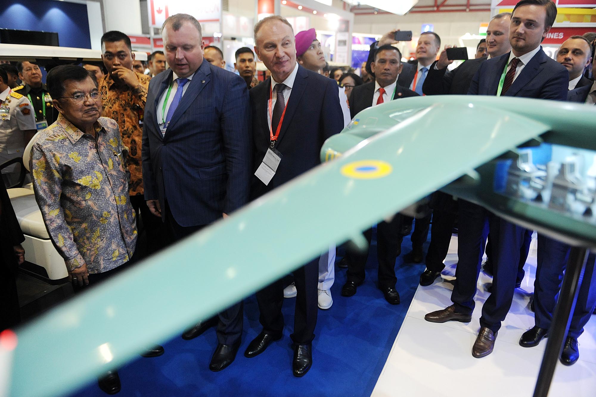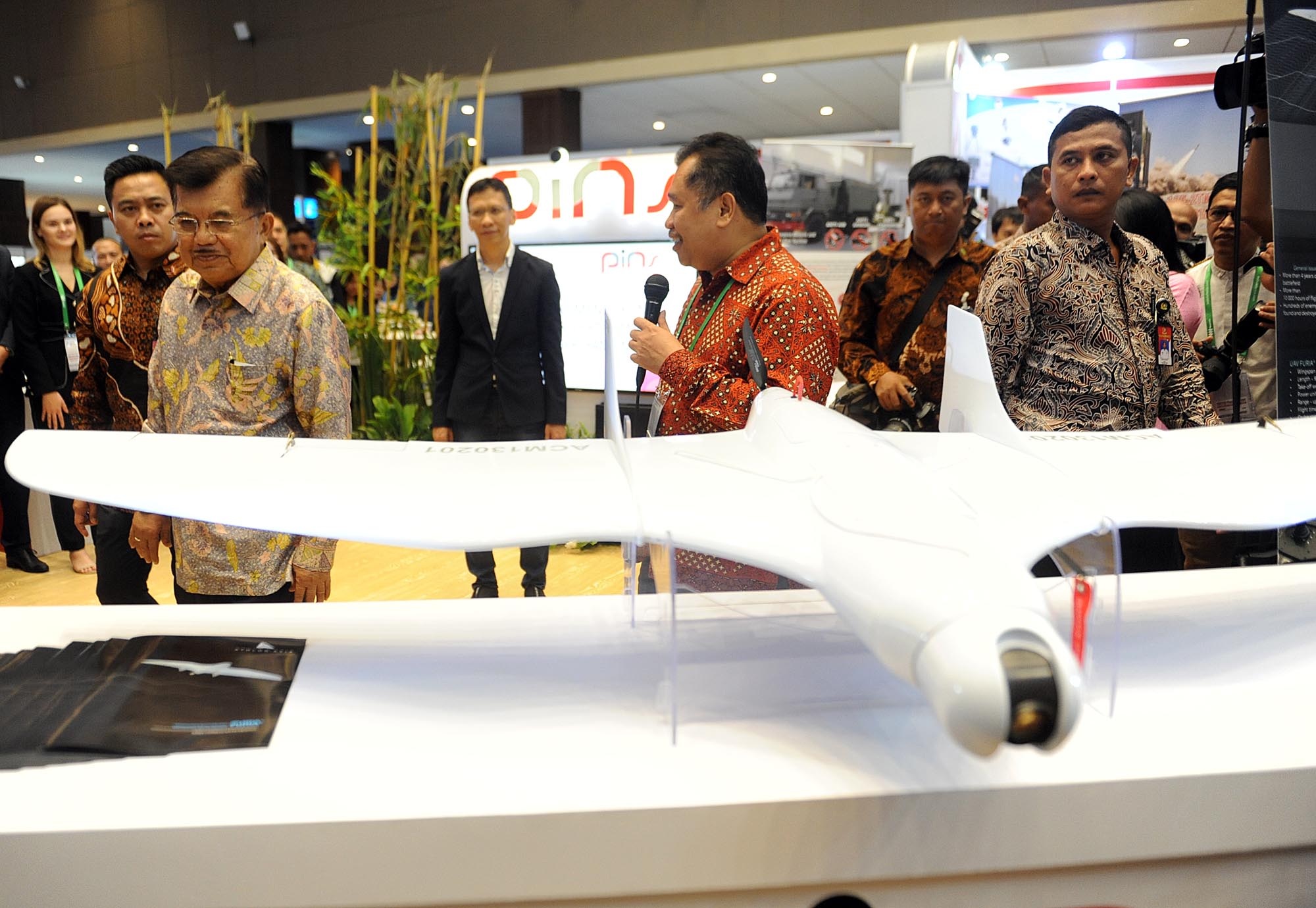 Wakil Presiden Jusuf Kalla mengamati drone militer canggih PINS Indonesia dengan The Belarus Defense Company dan sejumlah alat utama sistem senjata (alutsista) yang ditampilkan dalam pembukaan Indo Defence 2018 Expo and Forum, di JIExpo Kemayoran, Jakarta, Rabu (7/11/2018). Pameran industri pertahanan yang diselenggarakan oleh Kementerian Pertahanan itu berlangsung hingga 10 November 2018. AKTUAL/Tino Oktaviano
